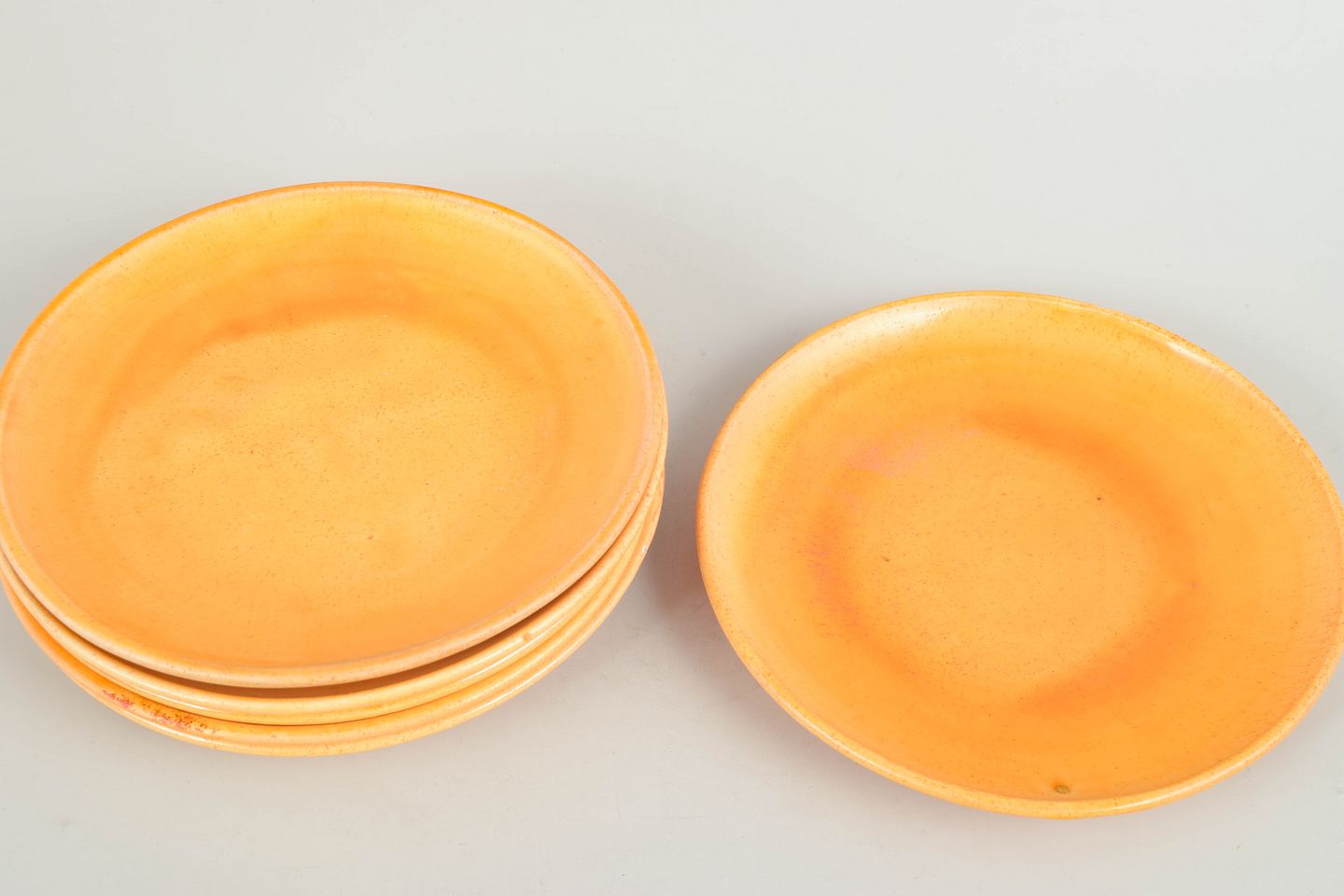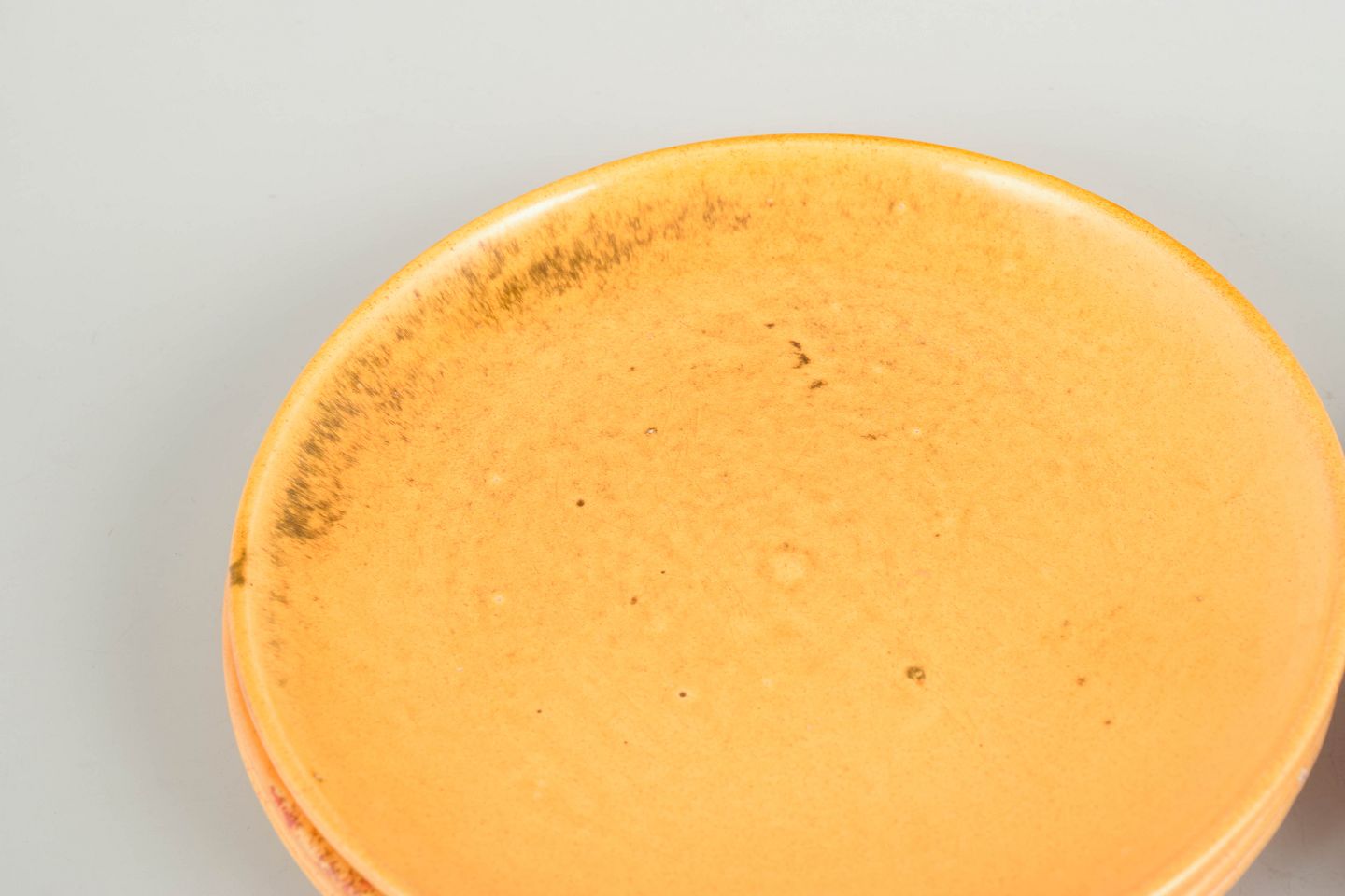 Seks keramiske tallerkener med uranholdig glasur i varme gyldne toner, fremstillet hos Kähler i 1930’erne.