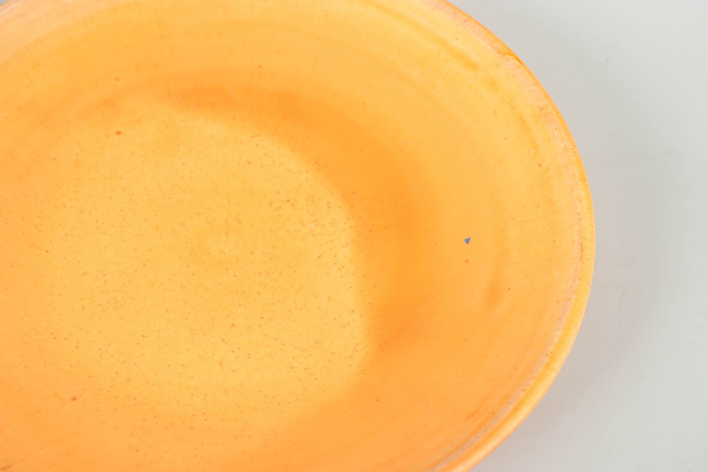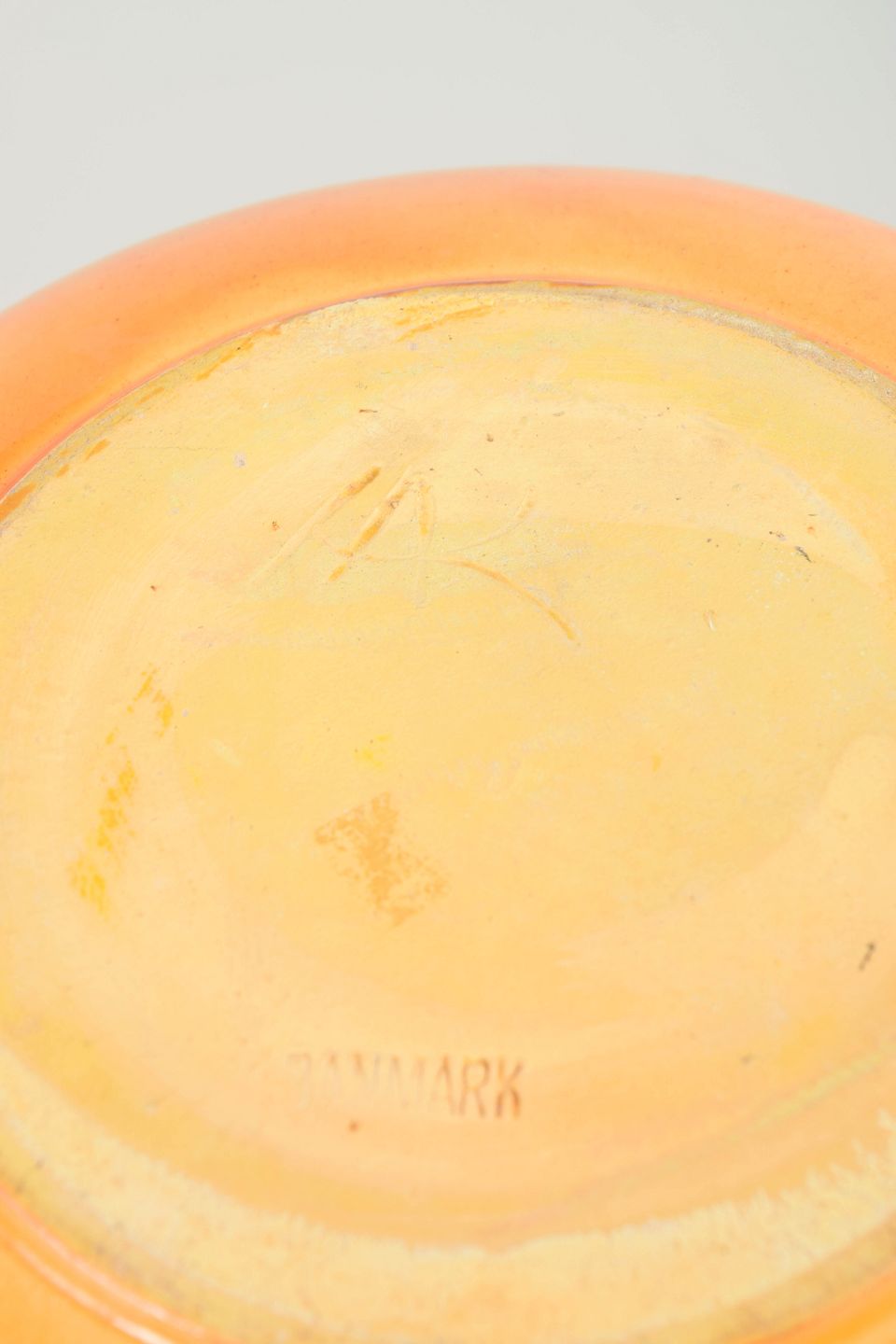 Fire keramiske tallerkener med uranholdig glasur i varme gyldne toner, fremstillet hos Kähler i 1930’erne.