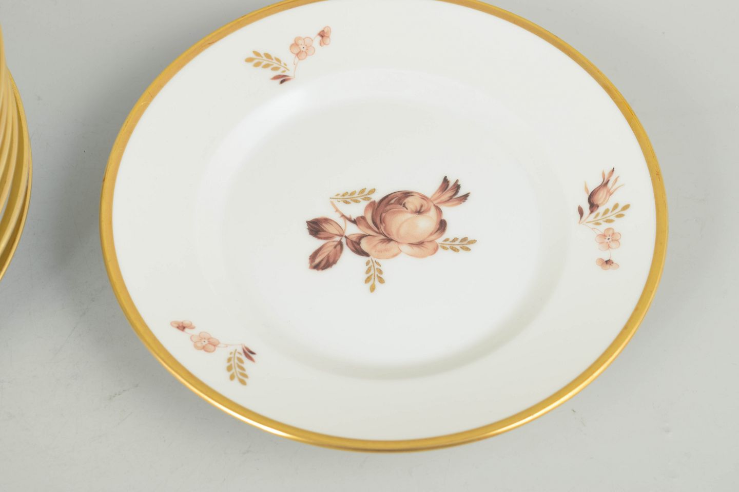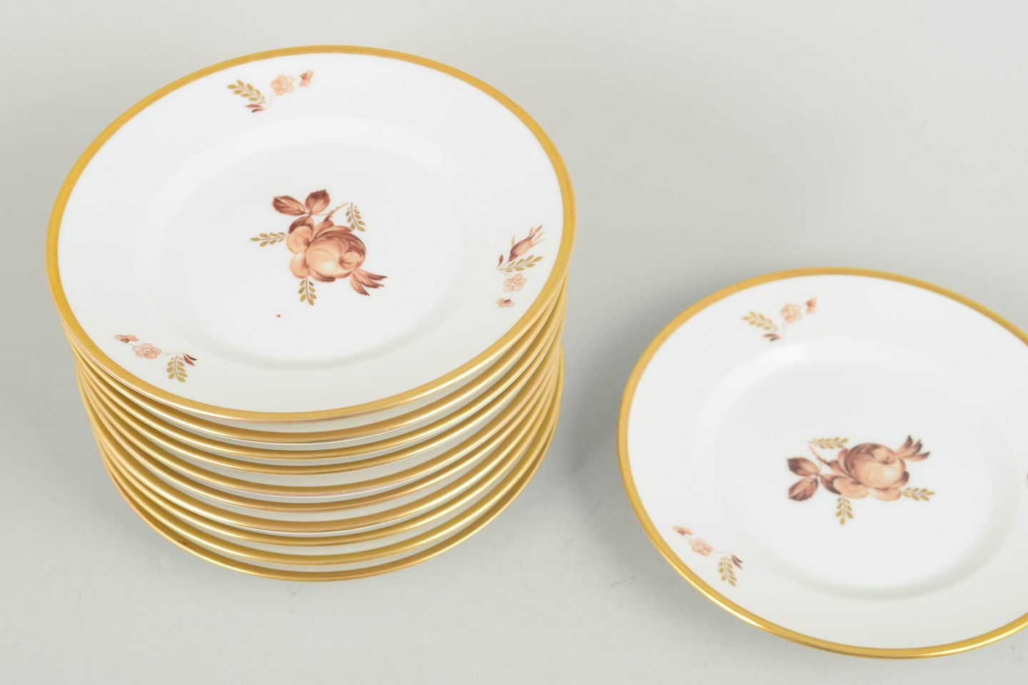 Dekorative porcelænstallerkener i hvidt porcelæn med brun blomsterdekoration og guldkant, model 688/9633, fra 1970’erne, første sortering.