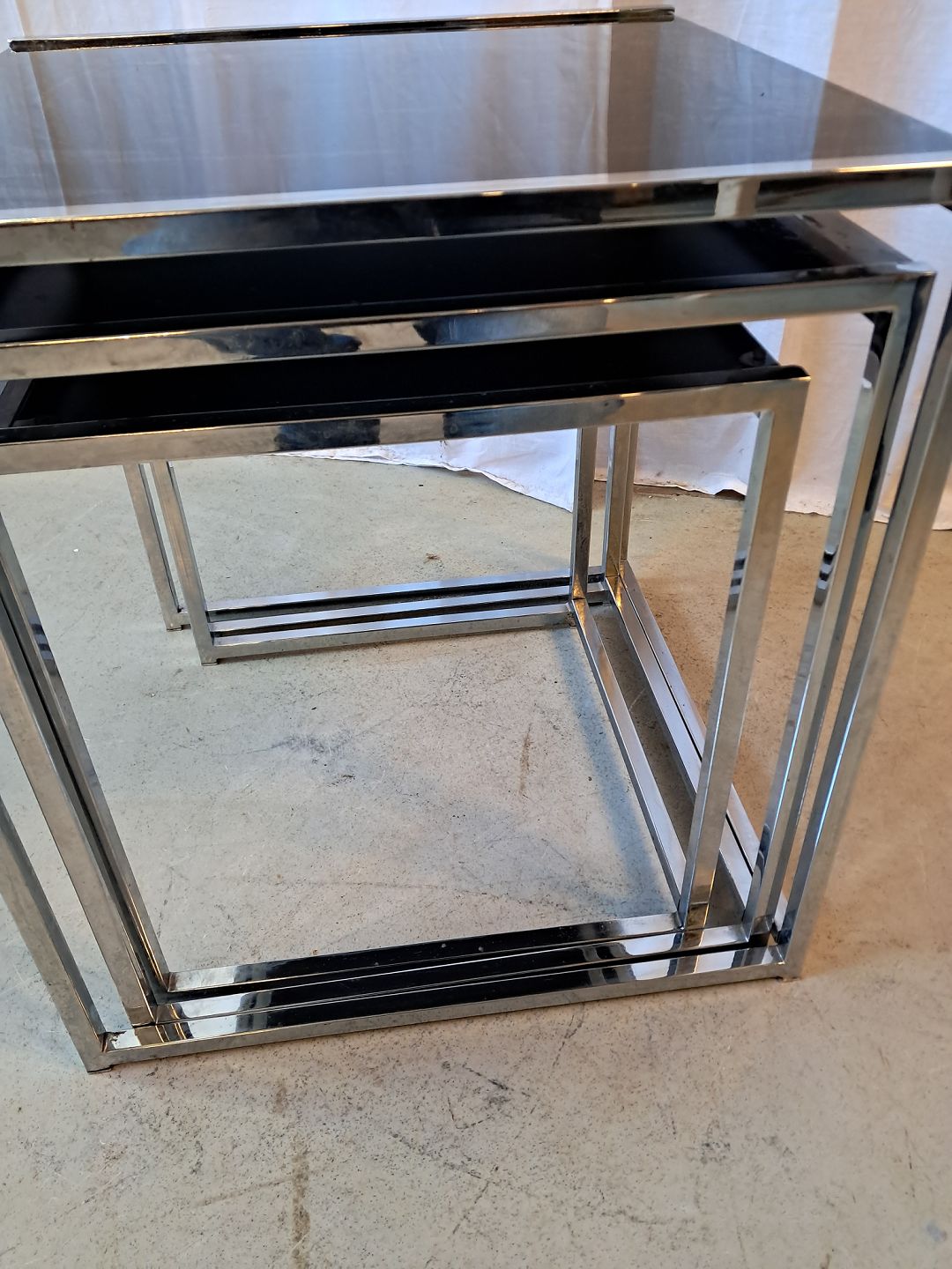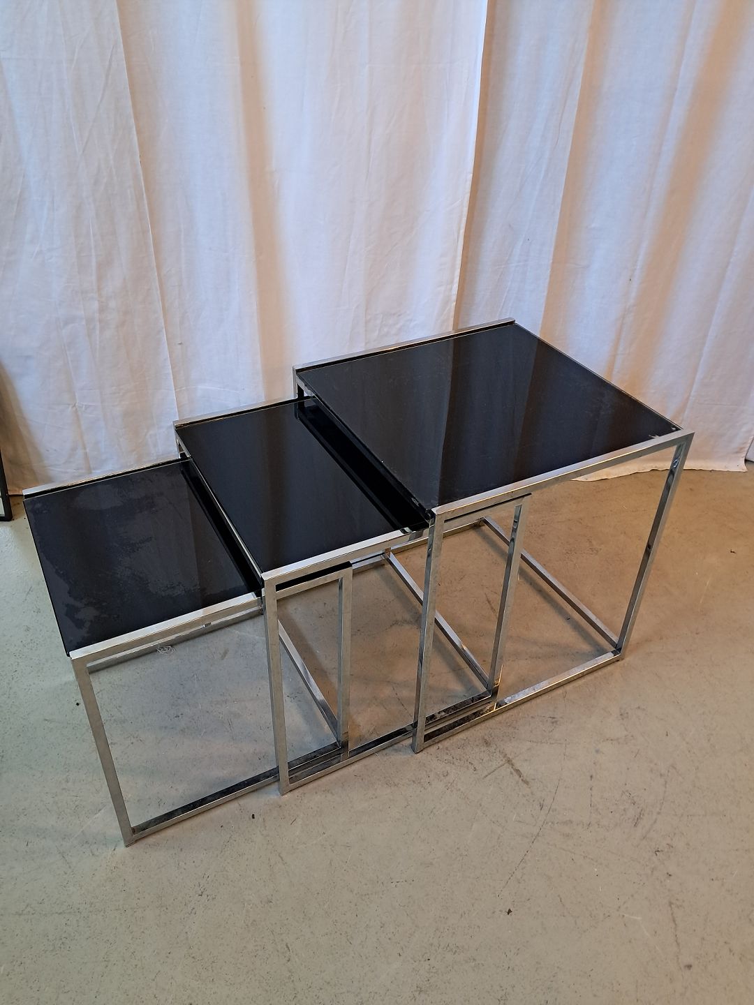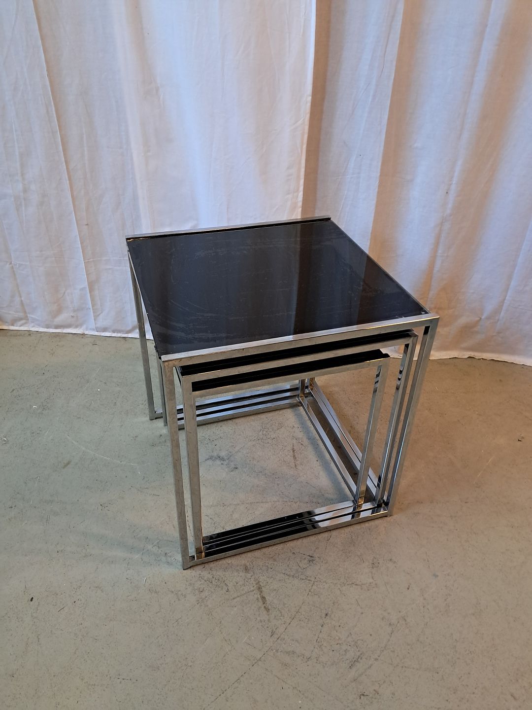 3 Indskudsborde i metal med glasplader, fra 1990erne.