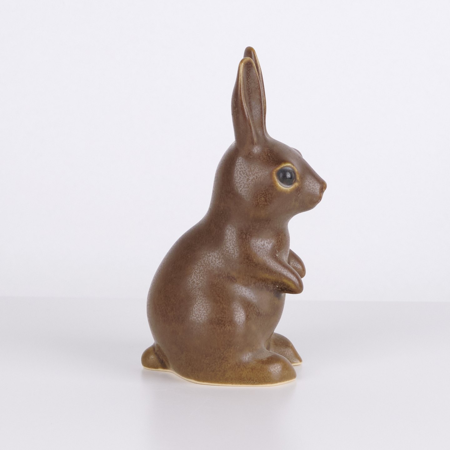 Große Hasenfigur von Knud Basse aus braun glasierter Keramik. Die Figur ist in aufrecht sitzender Form mit langen Ohren und fein handgemalten Augen modelliert.