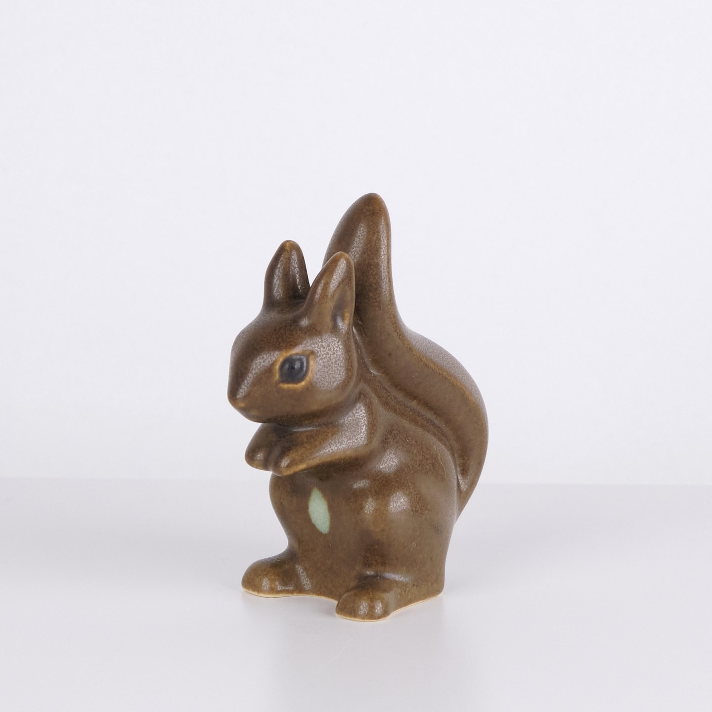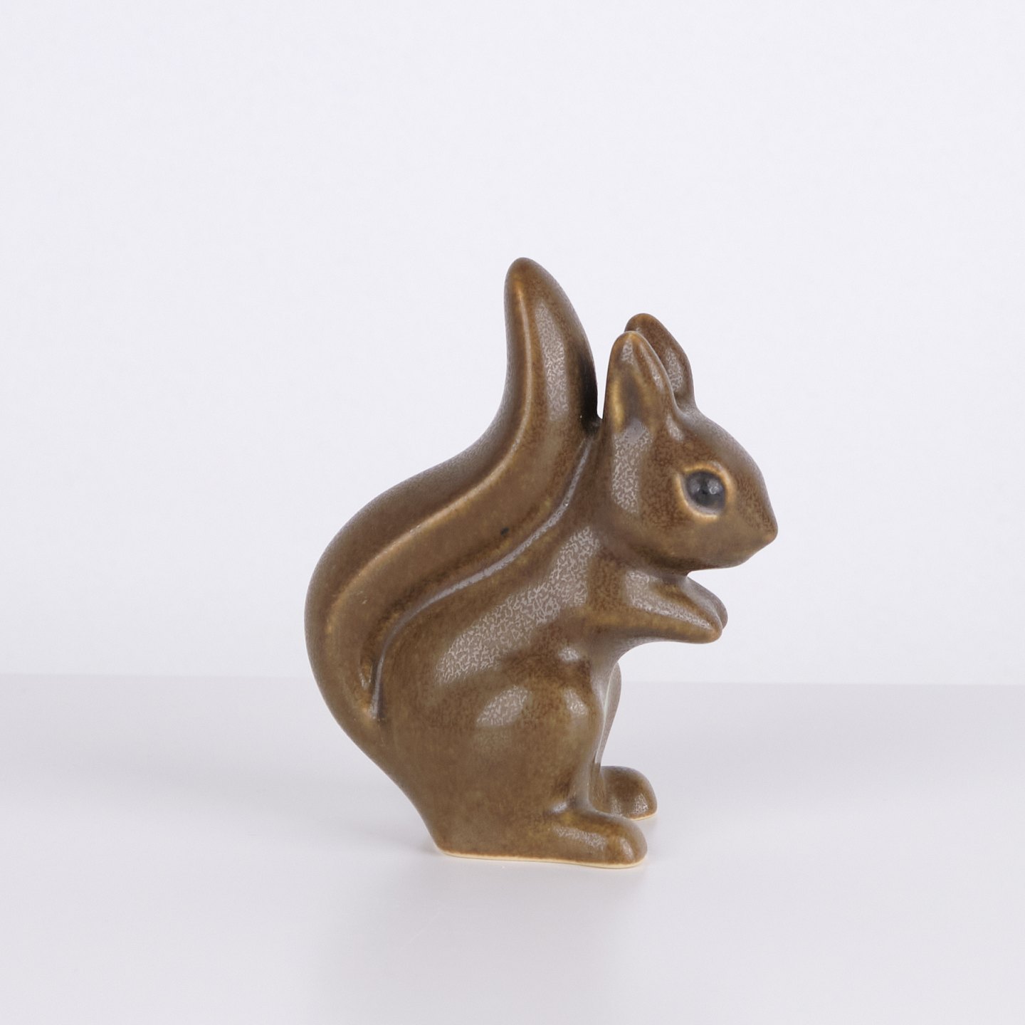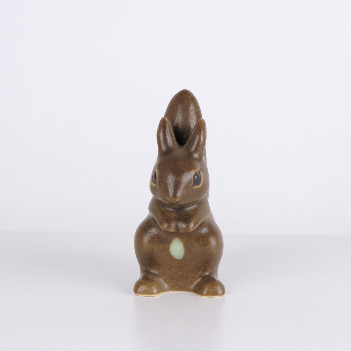 Hasenfigur von Knud Basse aus braun glasierter Keramik. Das Modell zeigt einen aufrecht sitzenden Hasen mit zusammengelegten Vorderpfoten und markanter Schwanzform auf der Rückseite. Die Figur ist vorne mit einem hellen Detail dekoriert und ein klassisches Beispiel für Knud Basses beliebte Tierfiguren aus den 1960er Jahren.