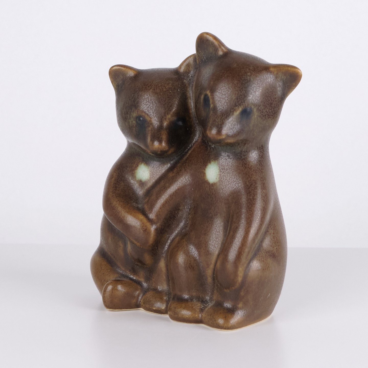 Große Doppelfigur von Knud Basse aus braun glasierter Keramik. Das Modell zeigt zwei dicht nebeneinander sitzende Bären mit hervorgehobenen hellen Brustdetails. Eine größere und seltenere Figur aus Knud Basses Tierserie, hergestellt in Dänemark in den 1960er Jahren.