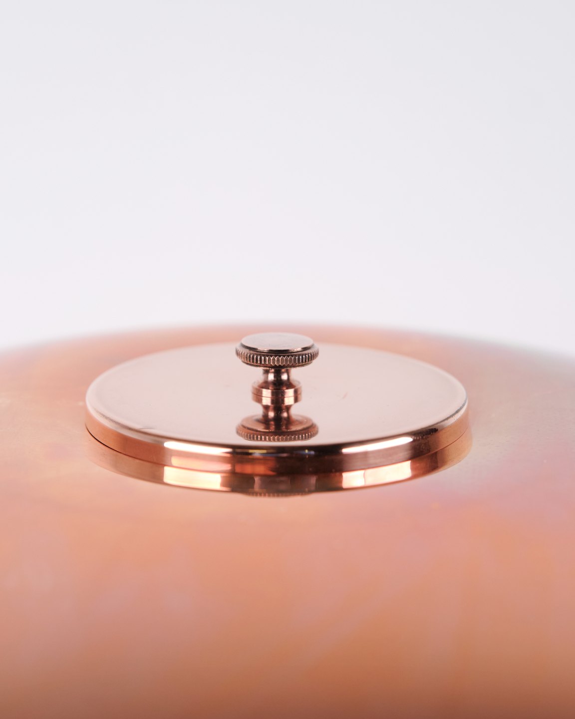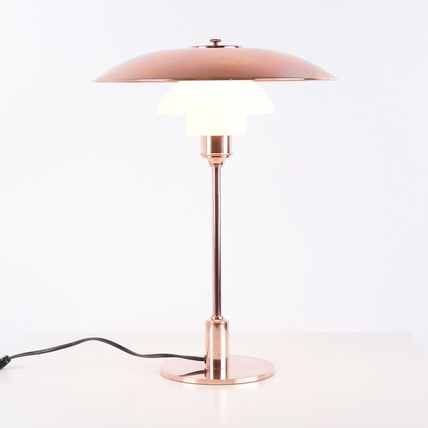 PH Tischlampe Modell PH 3½-2½ Limited Edition, entworfen von Poul Henningsen und hergestellt von Louis Poulsen. Die Lampe ist aus Kupfer gefertigt, mit oberem Schirm aus Kupfer sowie zwei unteren Schirmen aus weißem Opalglas. Bei dieser Ausführung ist nur der obere Kupferschirm enthalten. Das Modell wurde nur für einen begrenzten Zeitraum im Jahr 2015 produziert und verkauft und ist daher besonders begehrt bei Sammlern von PH Lampen und dänischem Lichtdesign.