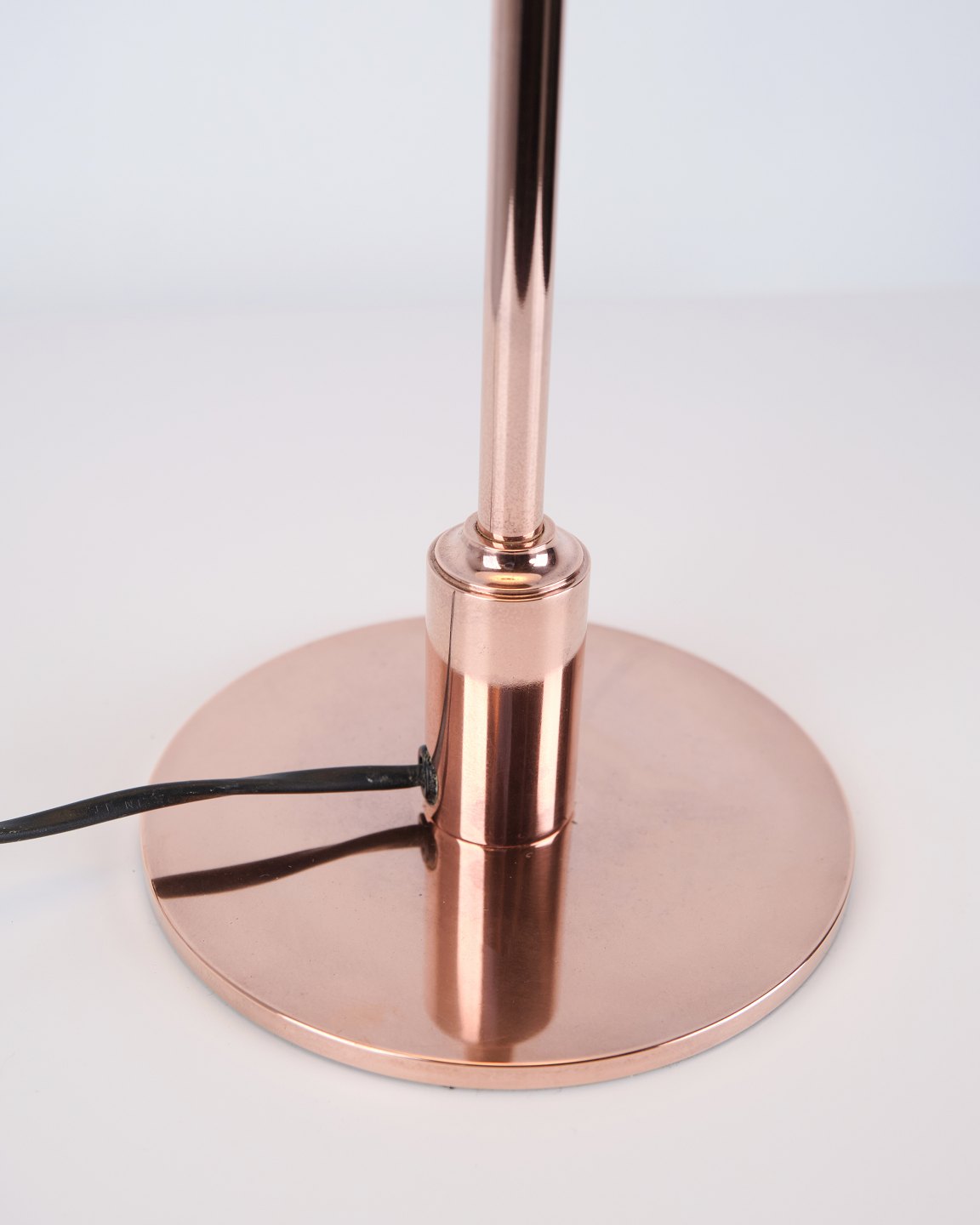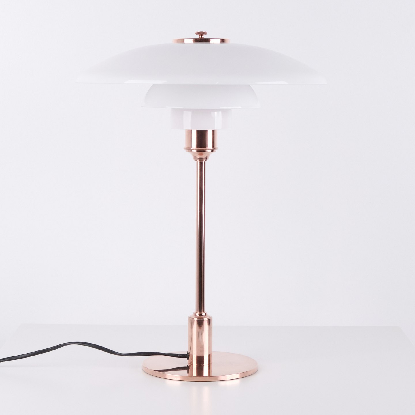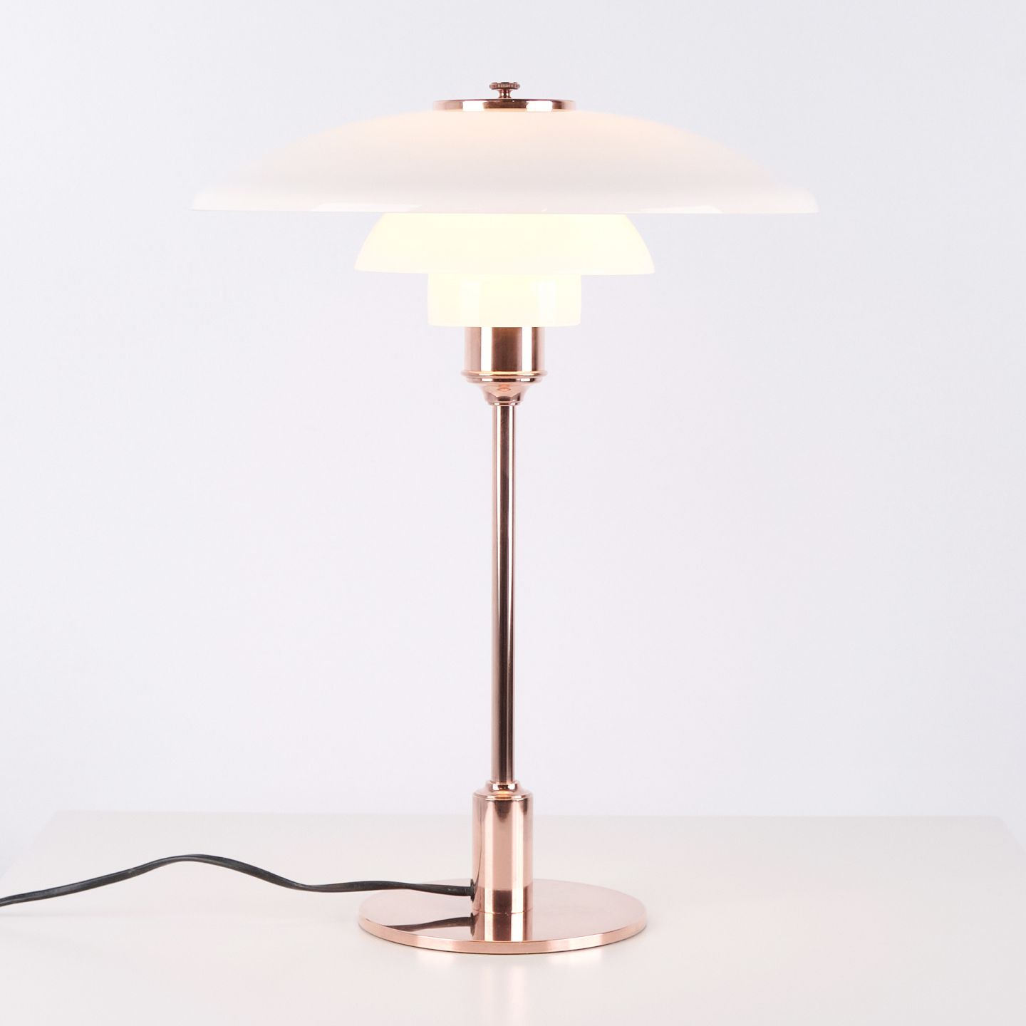 PH Tischlampe Modell PH 3½-2½ Limited Edition, entworfen von Poul Henningsen und hergestellt von Louis Poulsen. Die Lampe ist aus Kupfer gefertigt mit oberem Schirm aus weißem Opalglas sowie zwei unteren Schirmen aus weißem Opalglas. Das Modell wurde im Jahr 2015 nur für einen begrenzten Zeitraum verkauft.