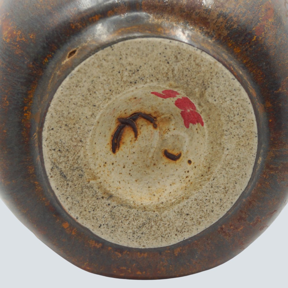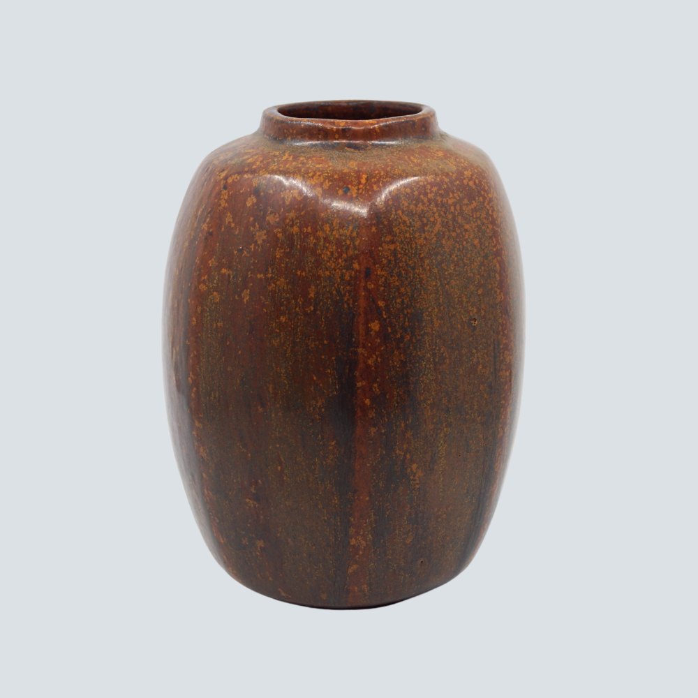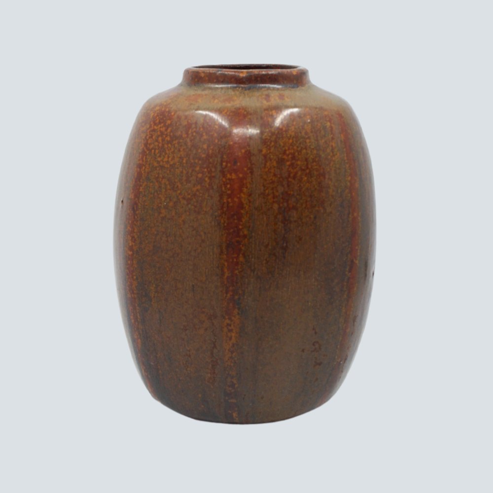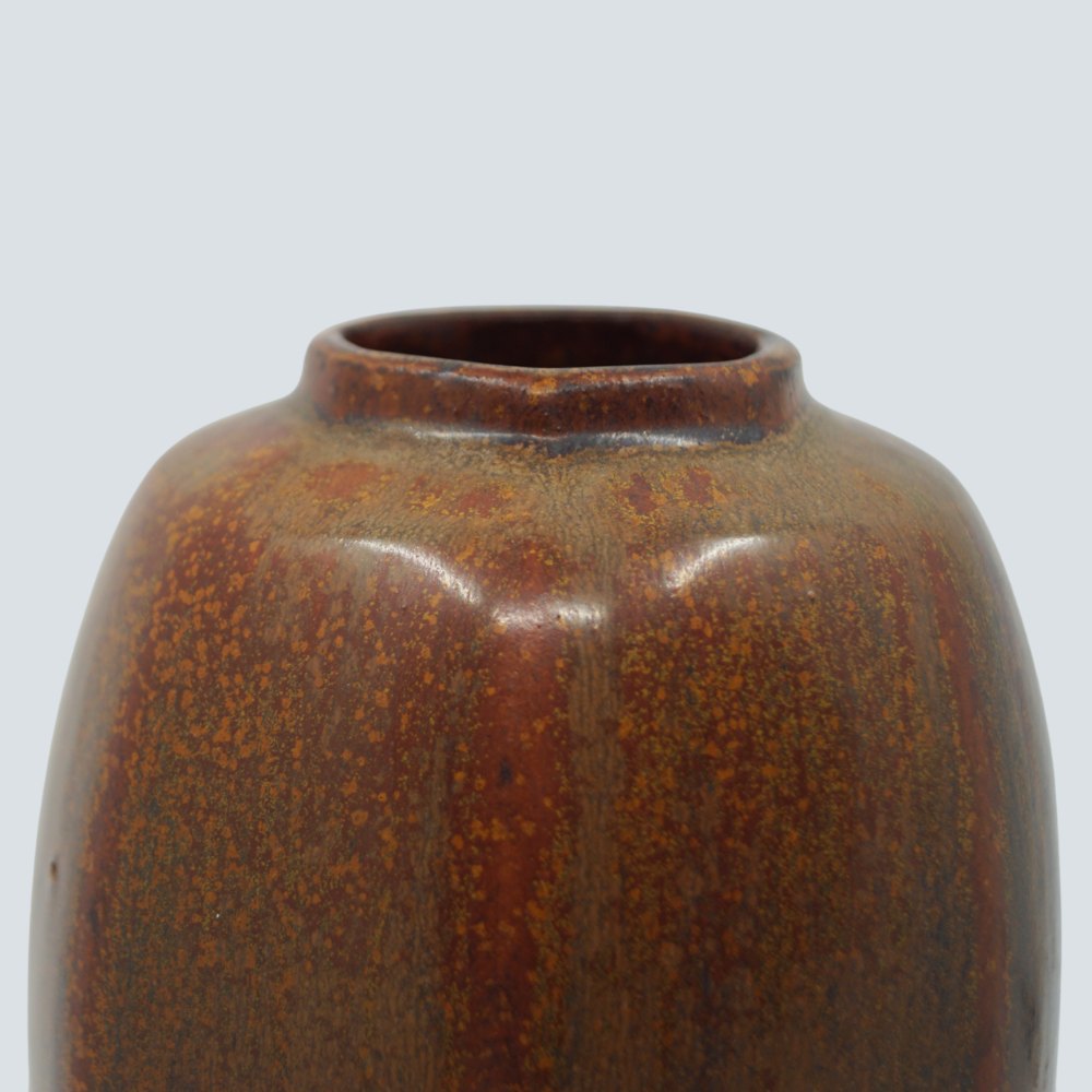 Text zugänglich auf Dänische: Arne Bang; Vase af stentøj, sekskantet. Med rødbrun glasur. I god stand.