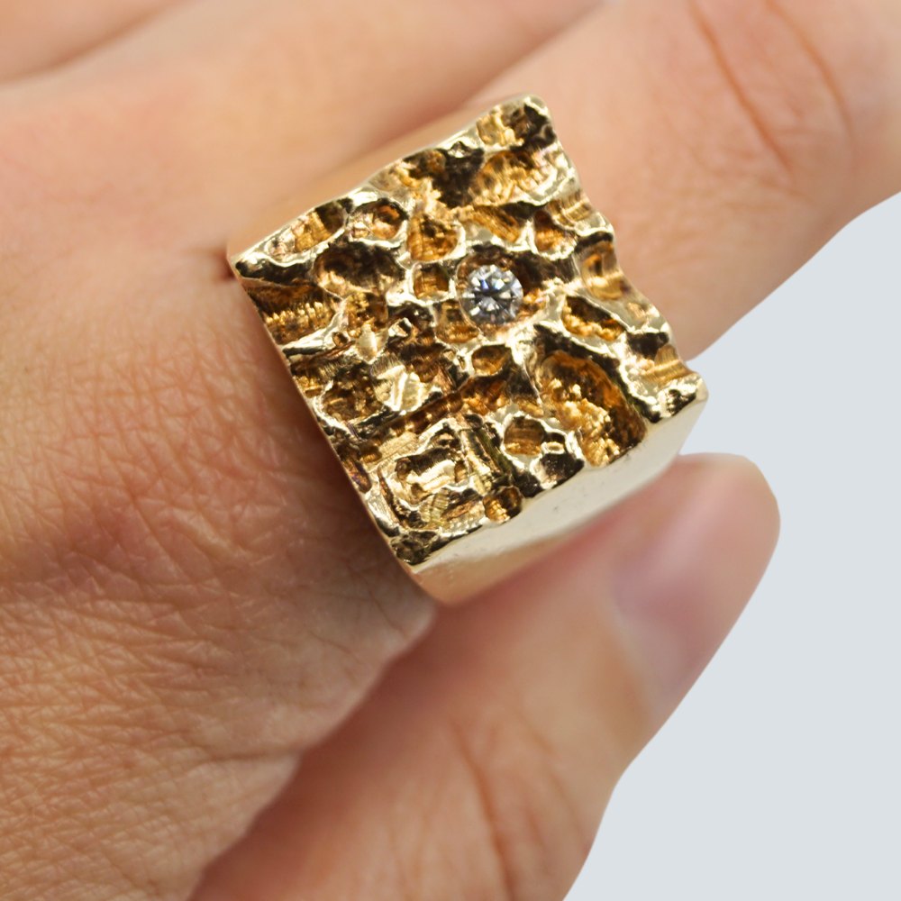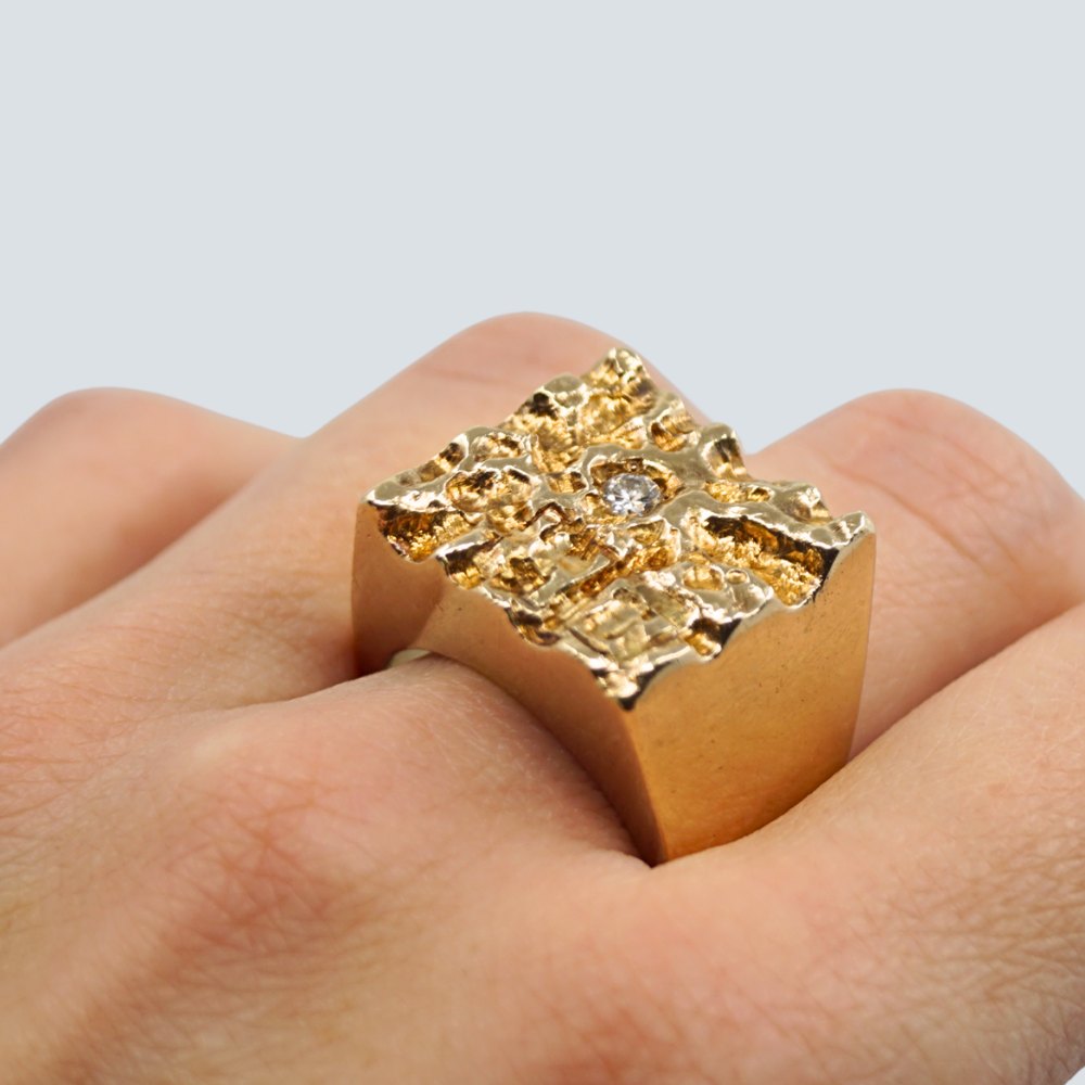 Text zugänglich auf Dänische: Ejvind Sørensen; Stor signetring i 14 kt. guld med diamant, ca. 0.10 ct. Kraftig kvalitet. Vægt: 50 gram.