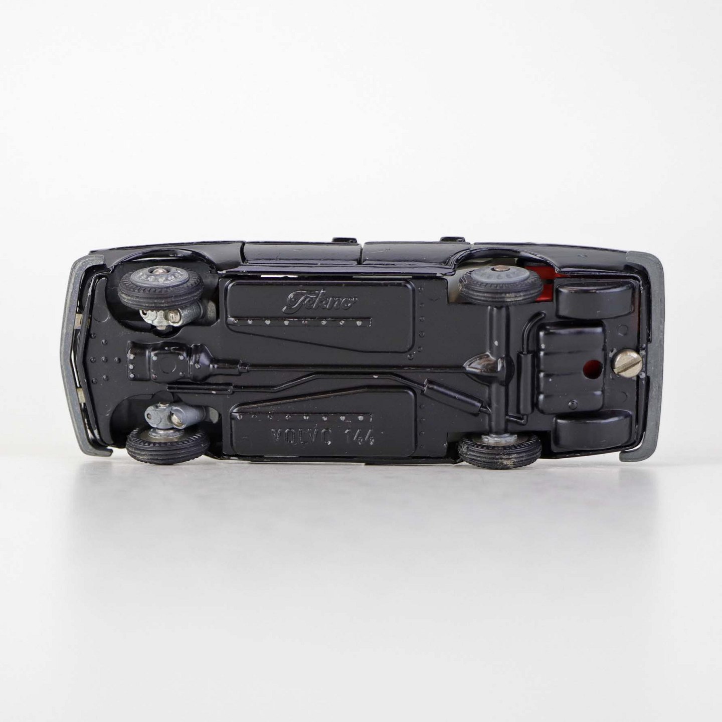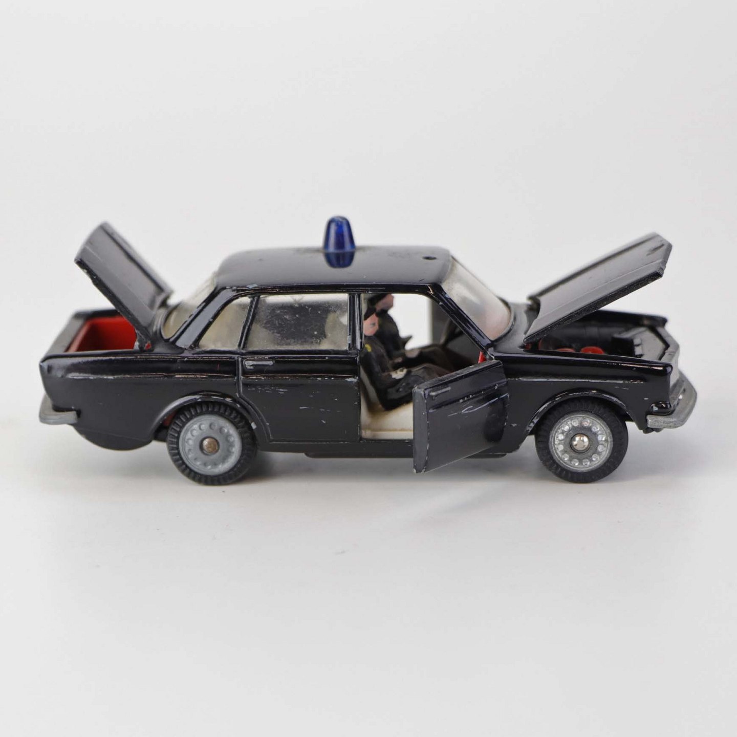 Politibil med to figurer. Legetøjsbil i sortlakeret metal med gummi hjul og blå blinklys. Model Volvo 144