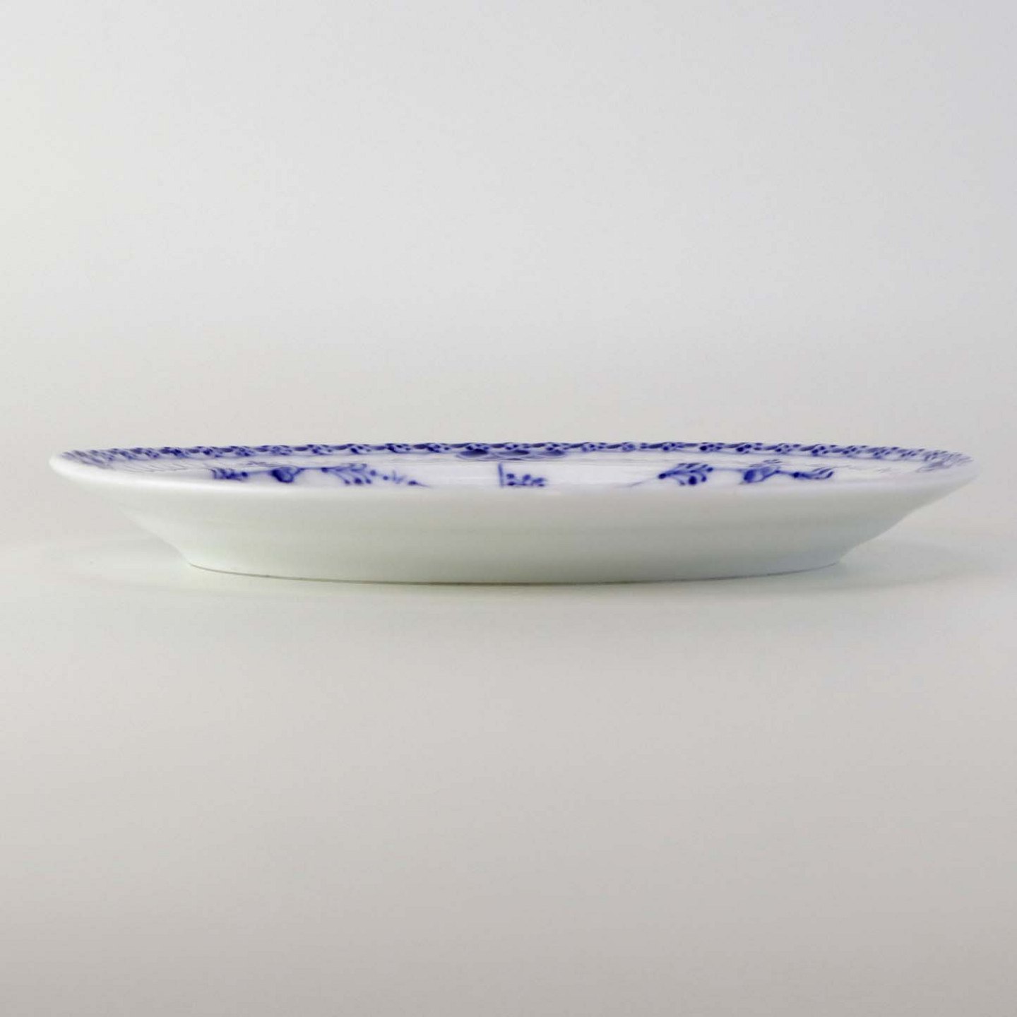 Musselmalet halvblonde er riflet hvidt porcelæn med dekoration af blå ranker og en kant med blonder.