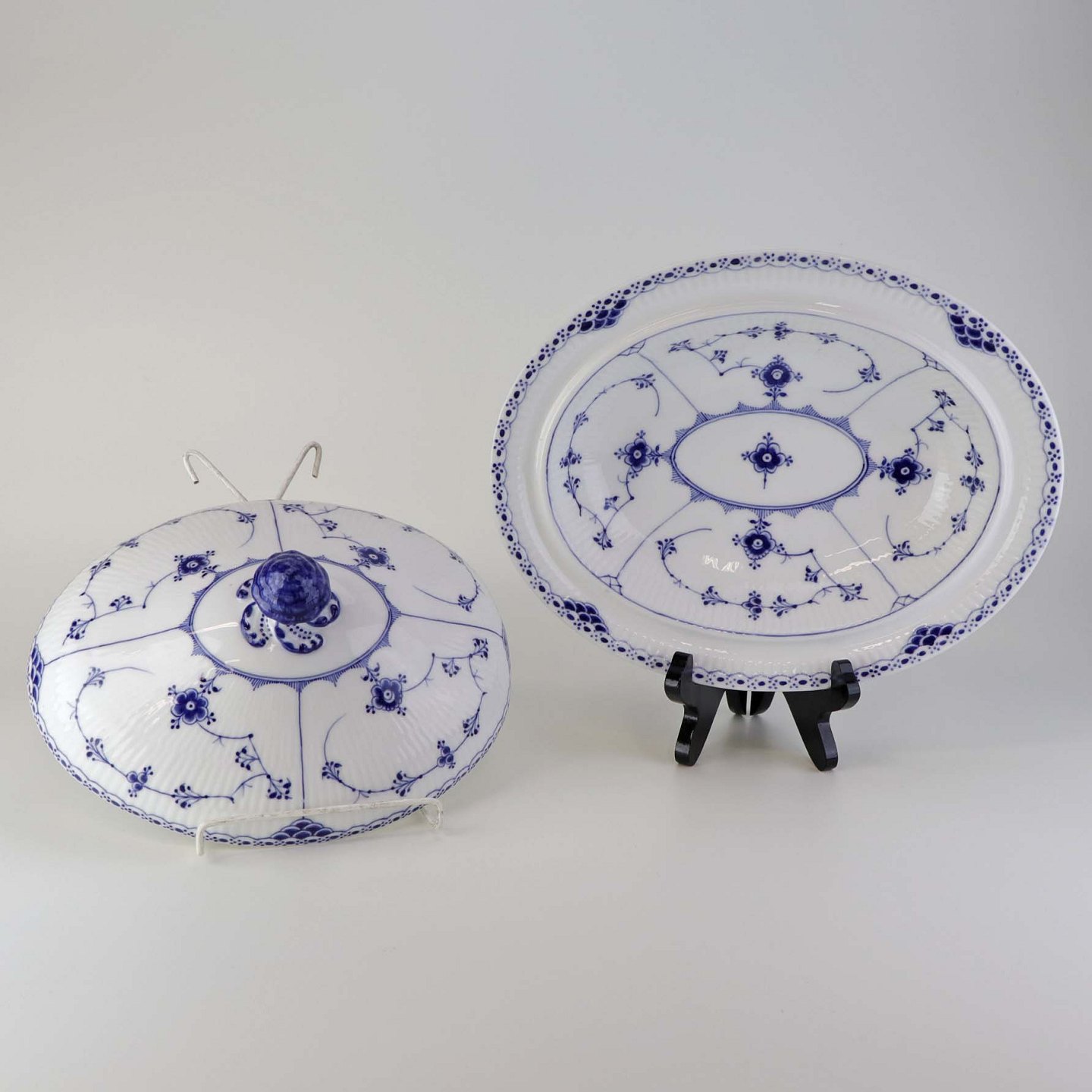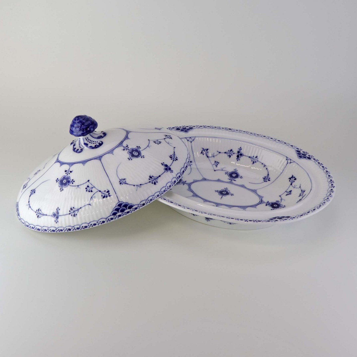 Oval terrin med låg kongeligt porcelæn fra stellet Musselmalet Halvblonde. Nr. 1/621
