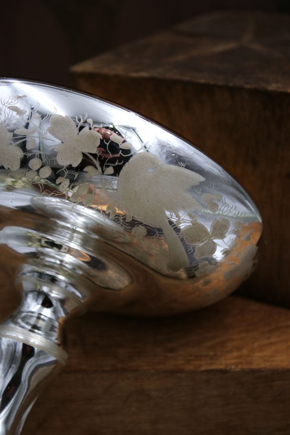 (Mercury glass) med fin ætset dekoration med fugle og bladranker.