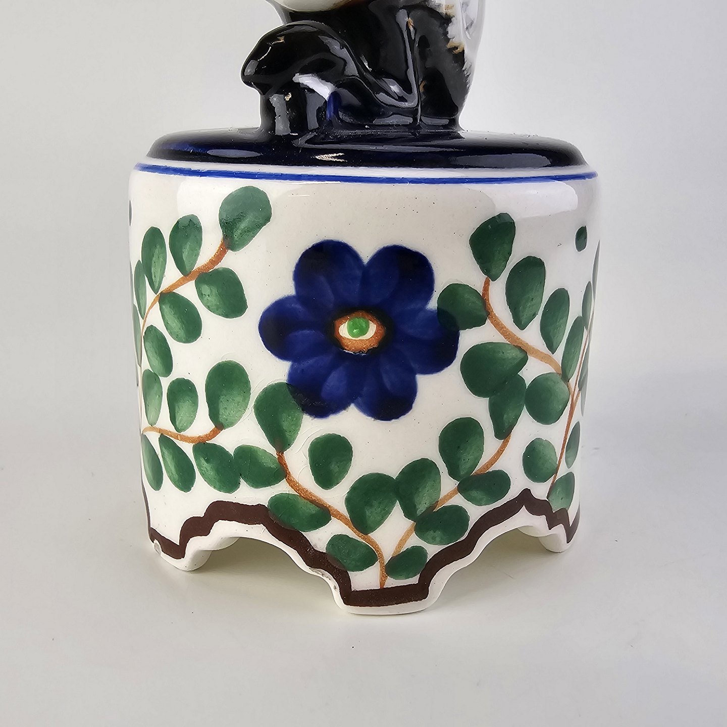Figur i fajance med motiv af en faun på en opsats med malet blomstermotiv