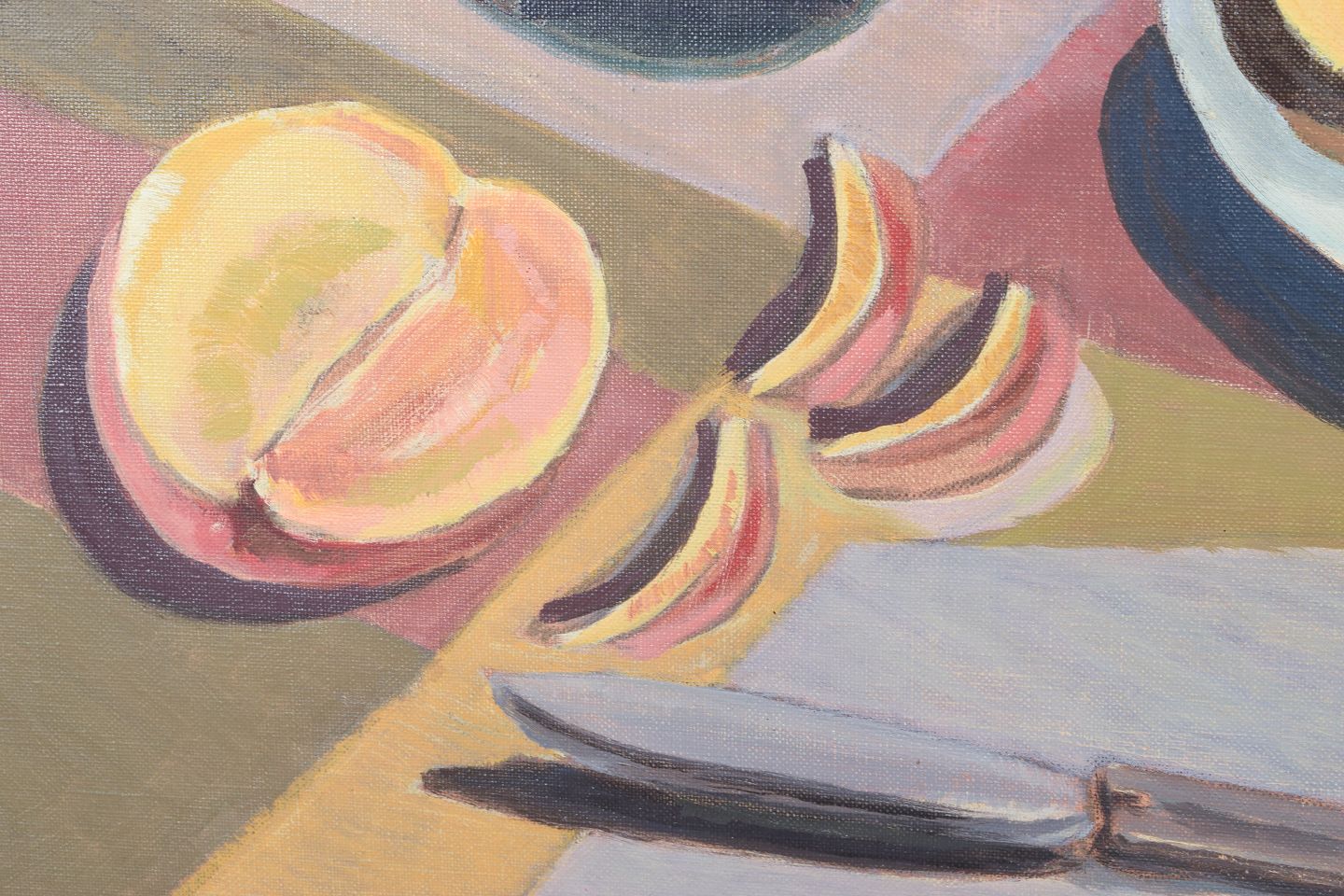 Modernistisk stilleben med frugt og glas opstillet i et roligt interiør, udført i en afdæmpet farvepalette med geometrisk opbygning. Kompositionen balancerer mellem figurativ gengivelse og stiliseret formsprog, signeret og dateret 1977.
