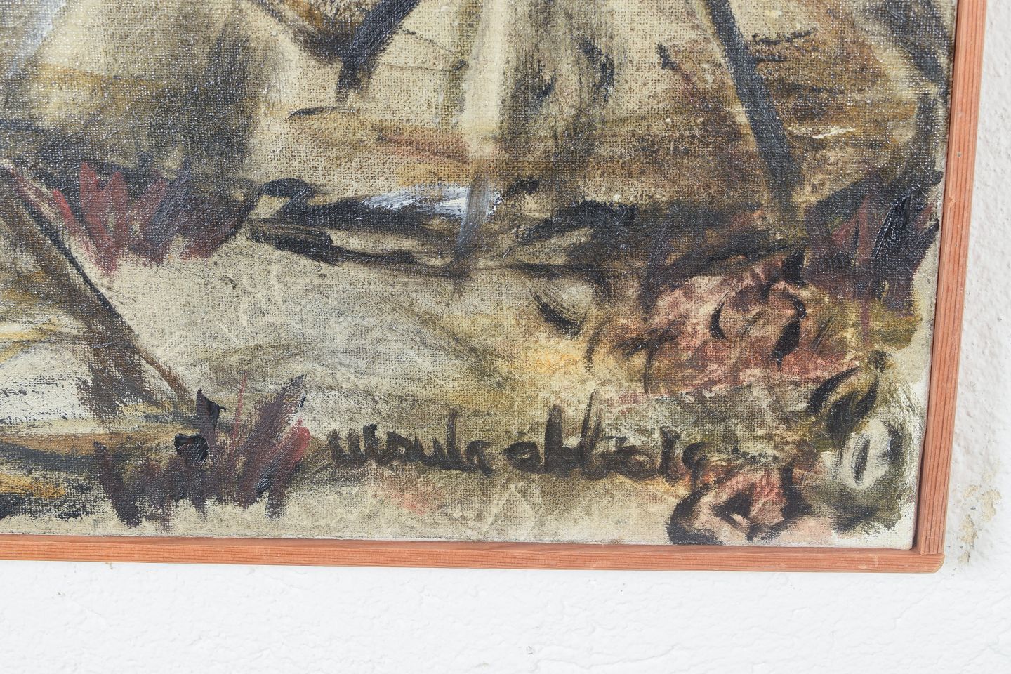 Modernistisk landskabsmotiv fra Lappland med samiske telte gengivet i en ekspressiv og let abstraheret form. Udført i dæmpede jordfarver med fri penselføring, signeret.