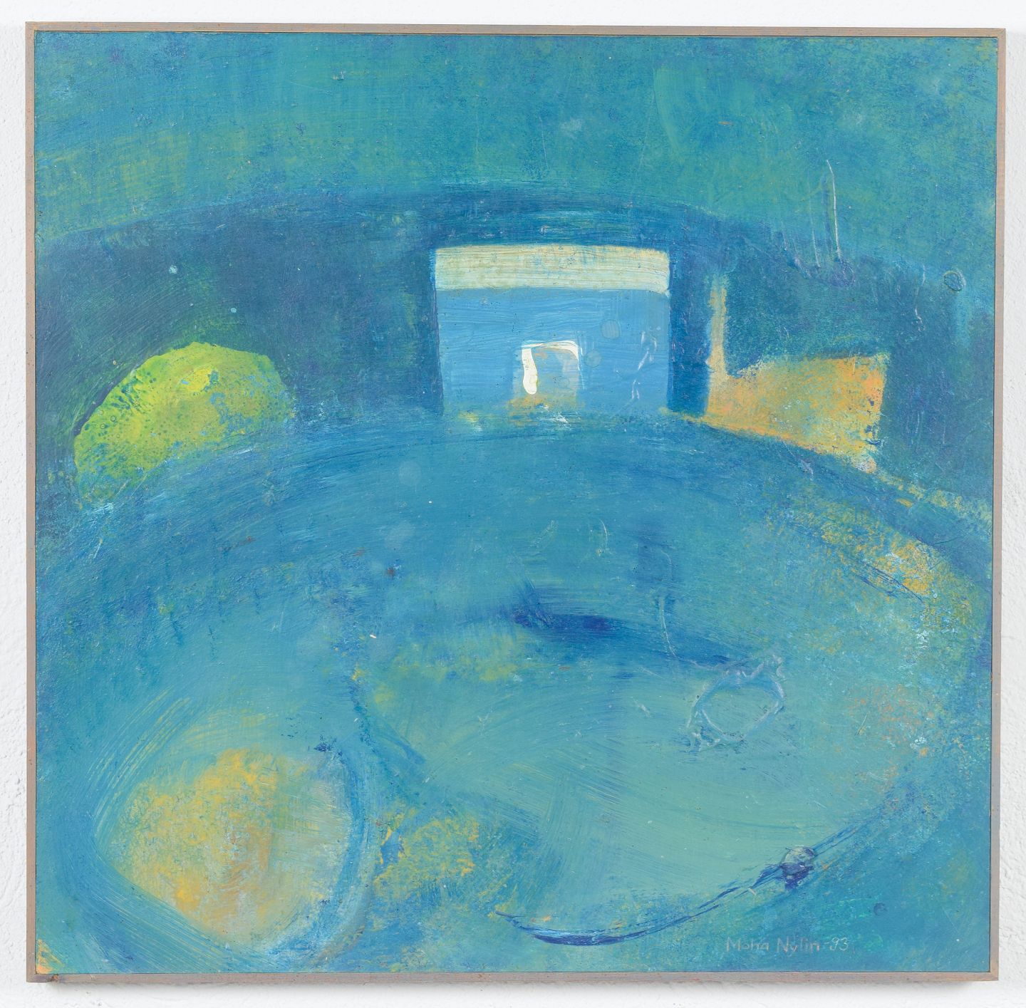 Abstrakt modernistisk komposition med bløde organiske former og afdæmpet farvepalette i blå og grønne nuancer. Centralt motiv med arkitektonisk antydning skaber en rolig, næsten drømmende rumlighed. Signeret og dateret 1993, betitlet "Hem II".