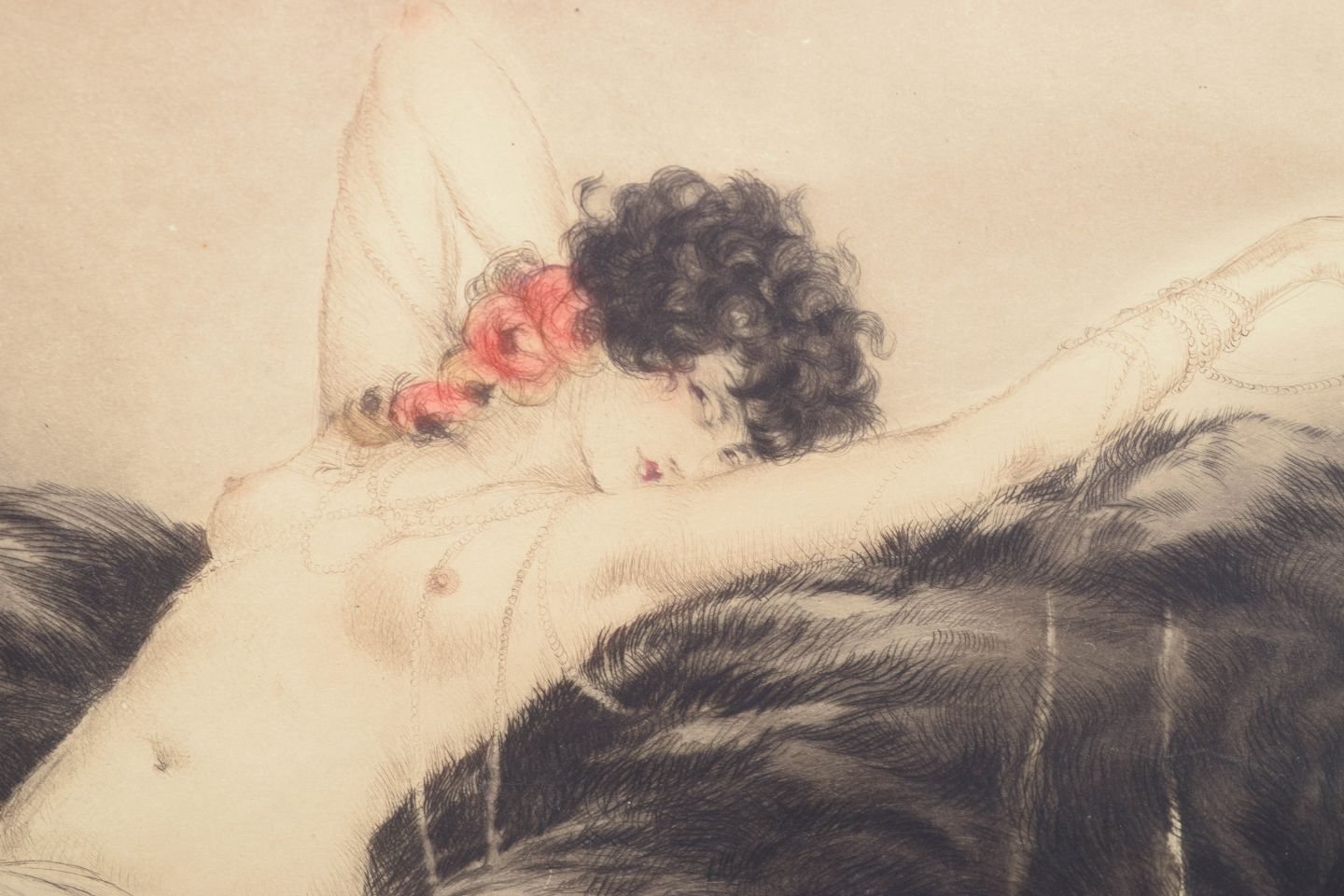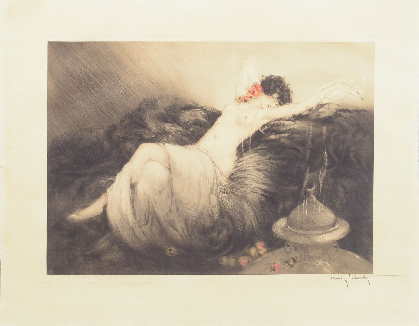 Sanselig og stemningsfuld komposition med liggende kvindefigur udført i Icart’s karakteristiske Art Deco stil med bløde linjer og nuancerede toner. Signeret i blyant og med præget stempel i papiret.