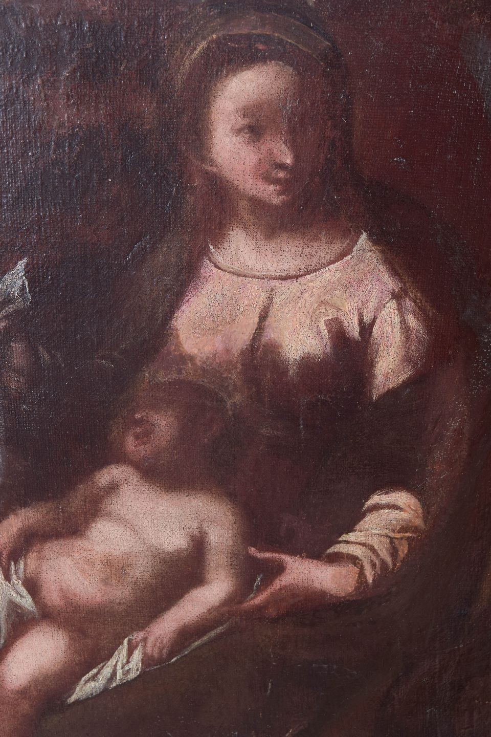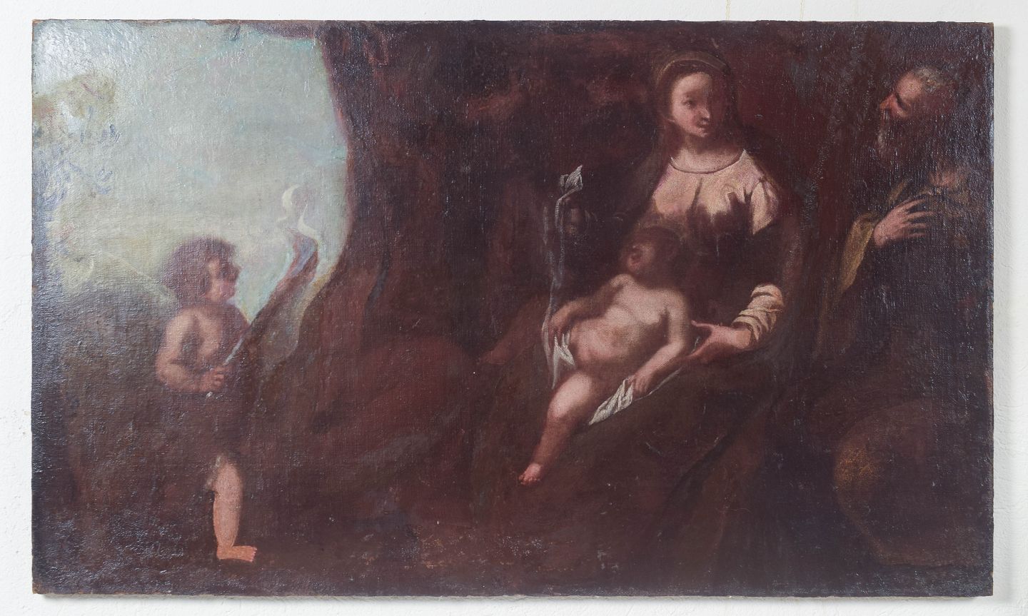 Klassisk religiøs komposition med Madonna og barnet flankeret af helgenfigur samt engel, udført i en blød og dæmpet koloristisk skala med tydelig inspiration fra barokkens billedtradition. Malet i olie på lærred og senere professionelt restaureret.