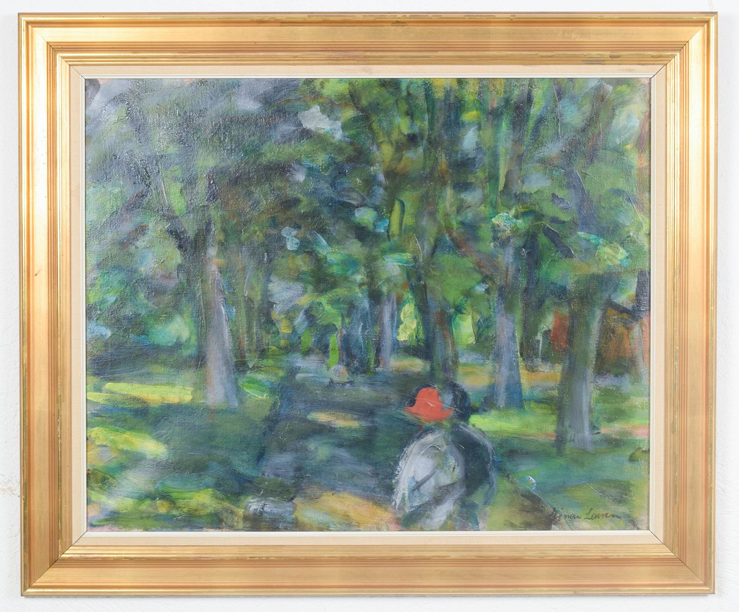 Modernistisk komposition med figurativt motiv i et skovlandskab, udført i en fri og let opløst penselføring med fokus på lys, farve og atmosfære. Signeret og dateret 1965.