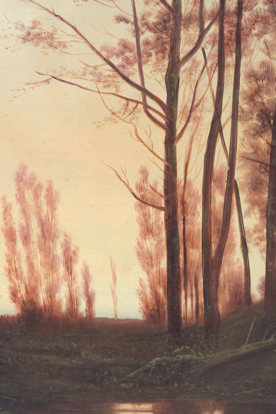 Stemningsfuldt landskabsmotiv med slanke træstammer langs et stille vandløb i varmt aftenslys, udført i en naturalistisk stil med bløde overgange og afdæmpet farvepalette. Signeret nederst.