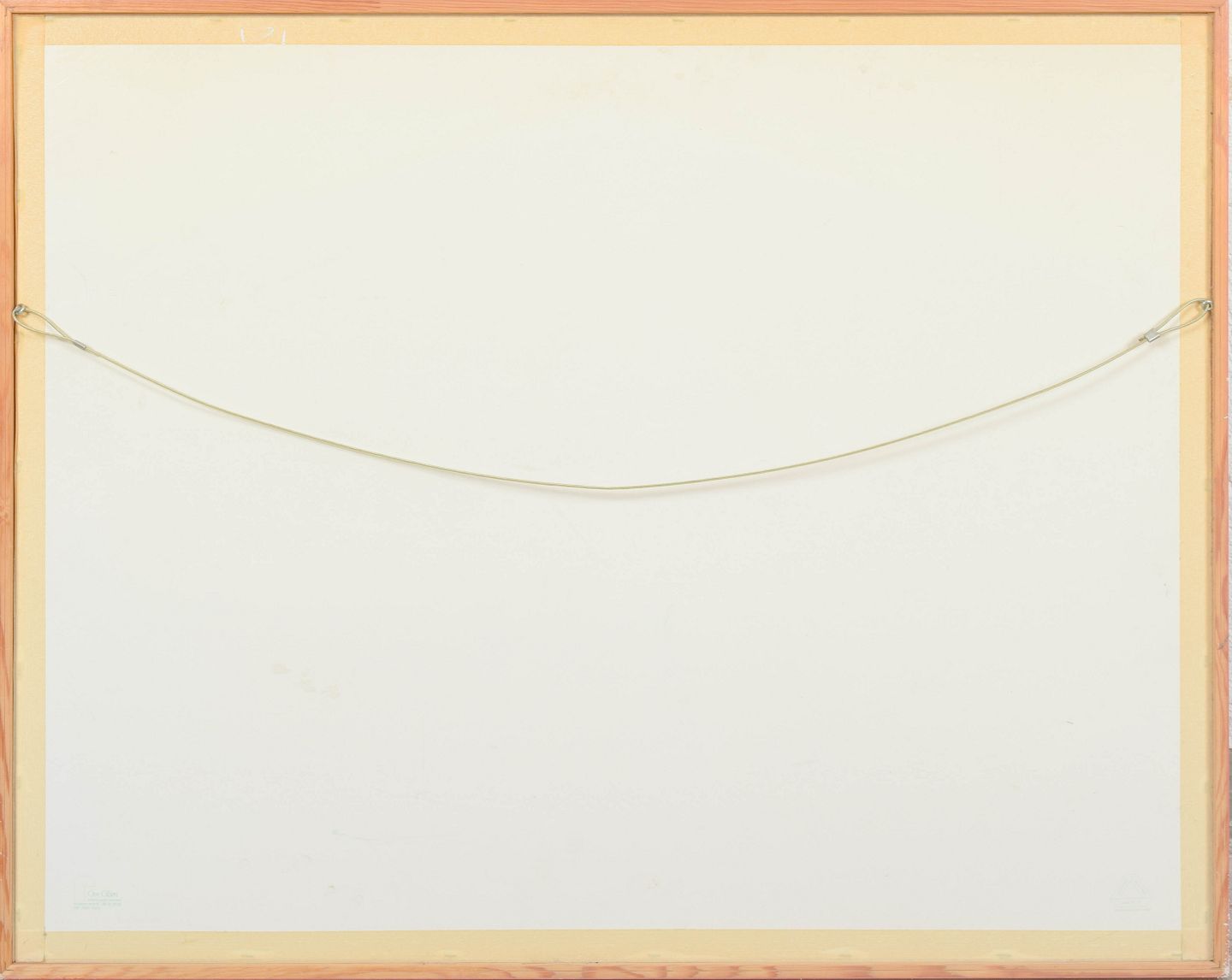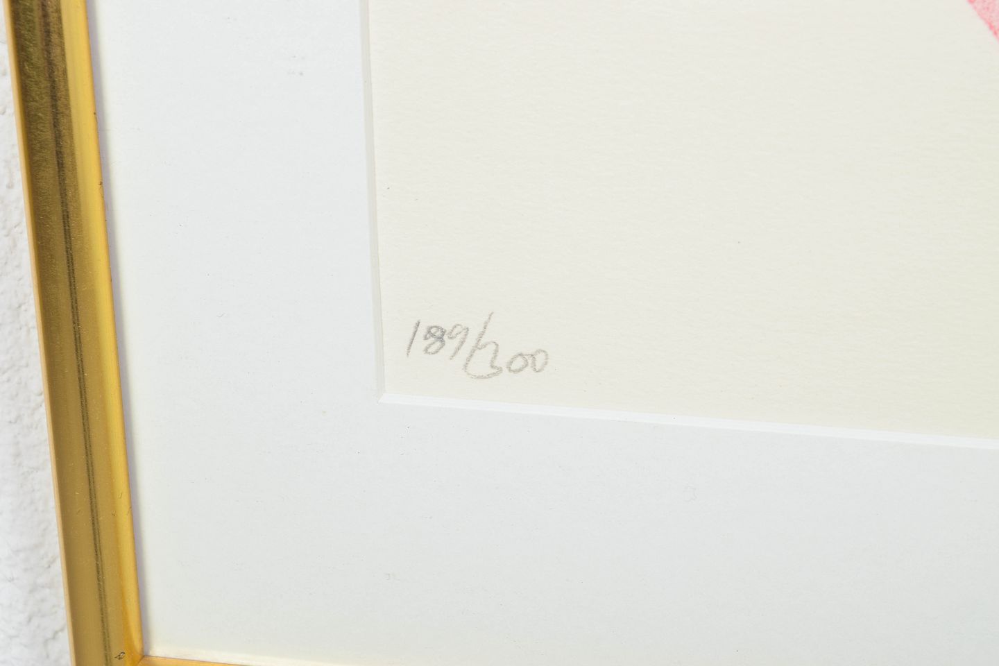 Abstrakt og ekspressivt motiv med dynamiske, cirkulære bevægelser i røde, blå og gule farveforløb, udført som farvelitografi, signeret og nummereret 189/300, dateret 1994.
