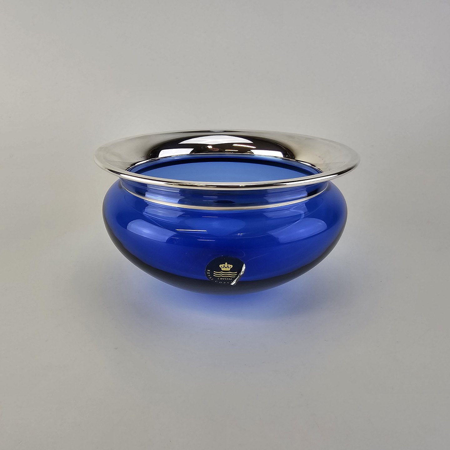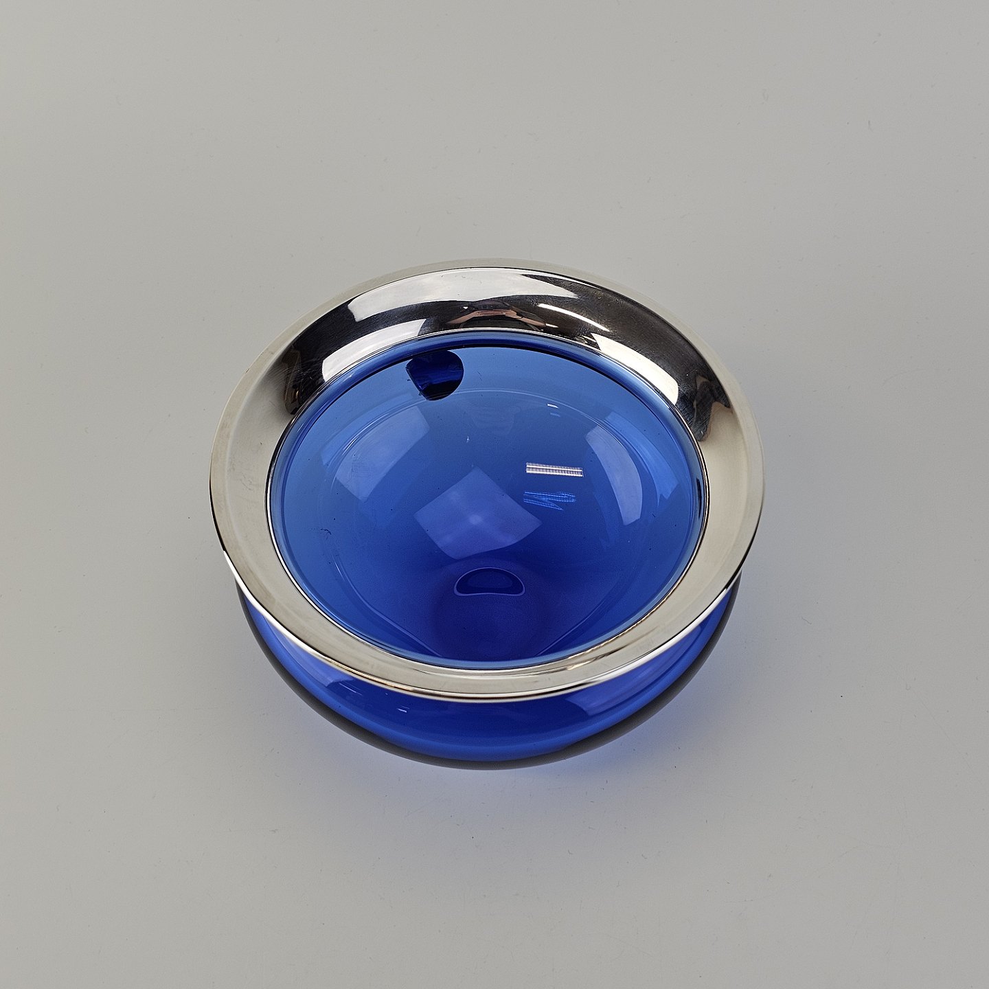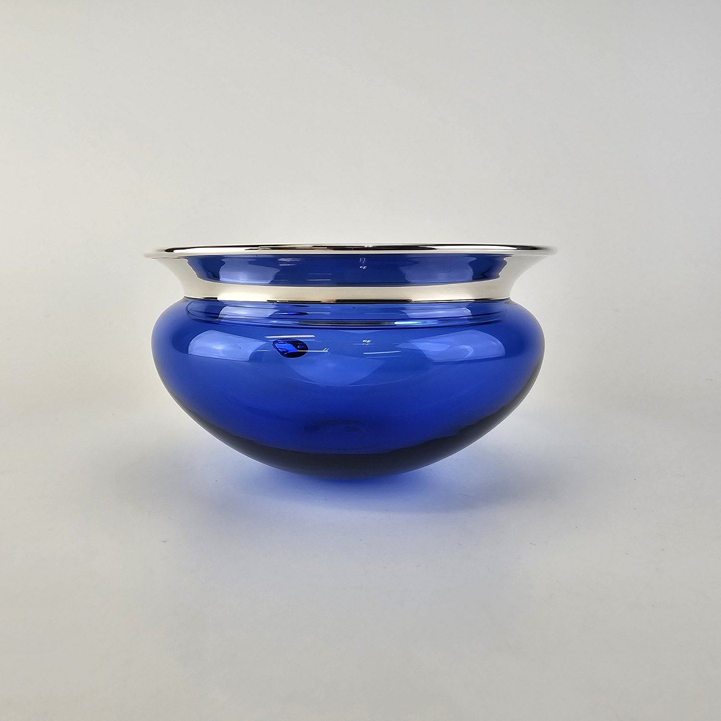 Mundblæst skål i blåt krystalglas med kant dyppet i sølv, fra serien Saturn