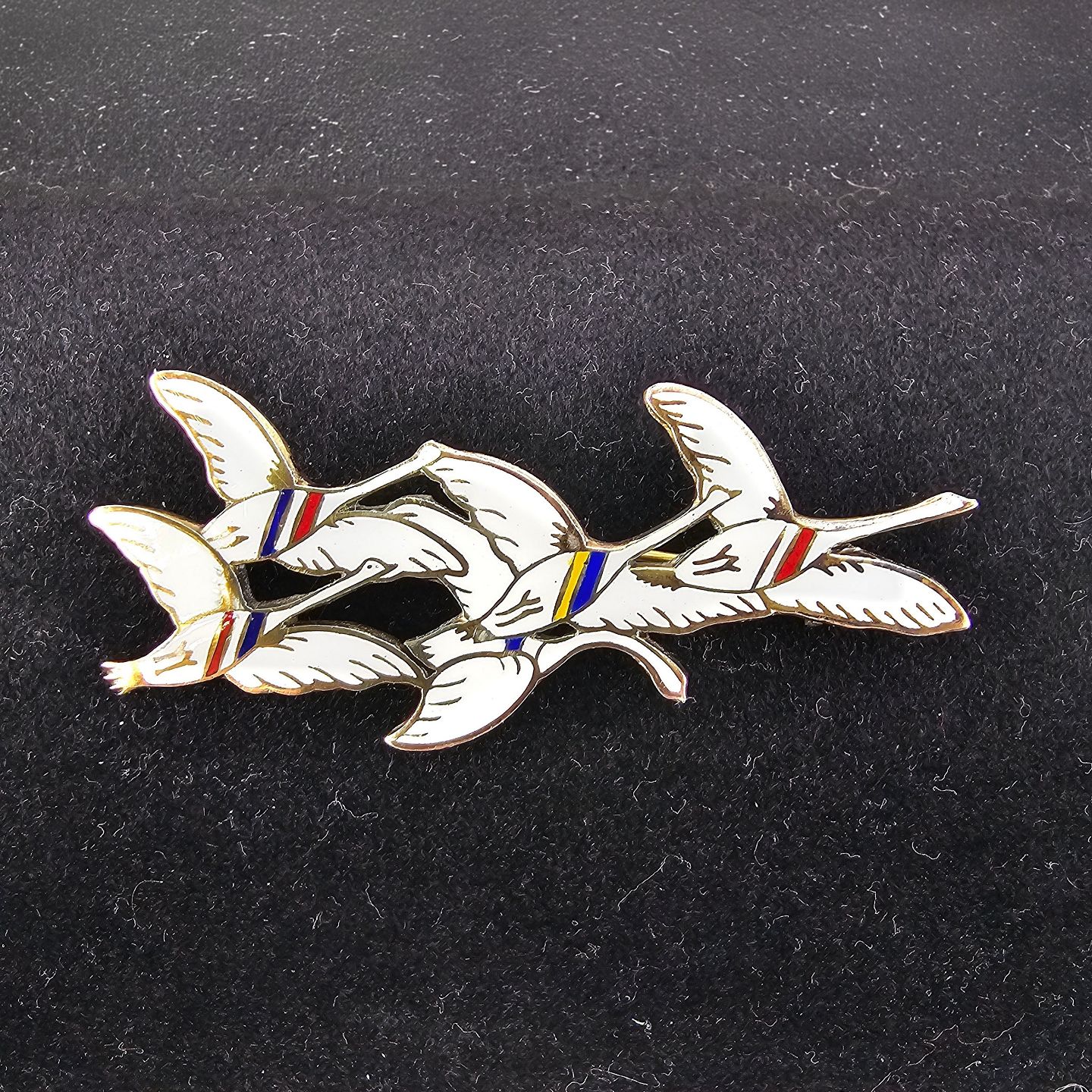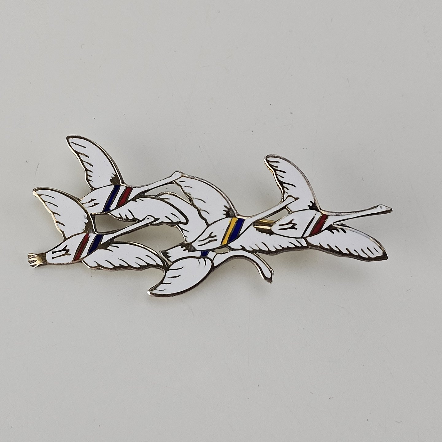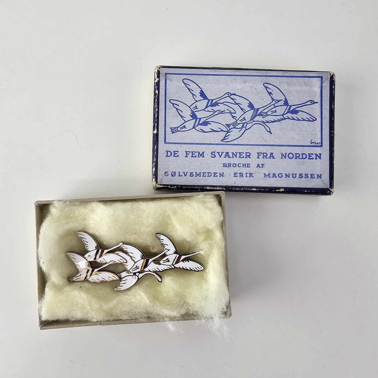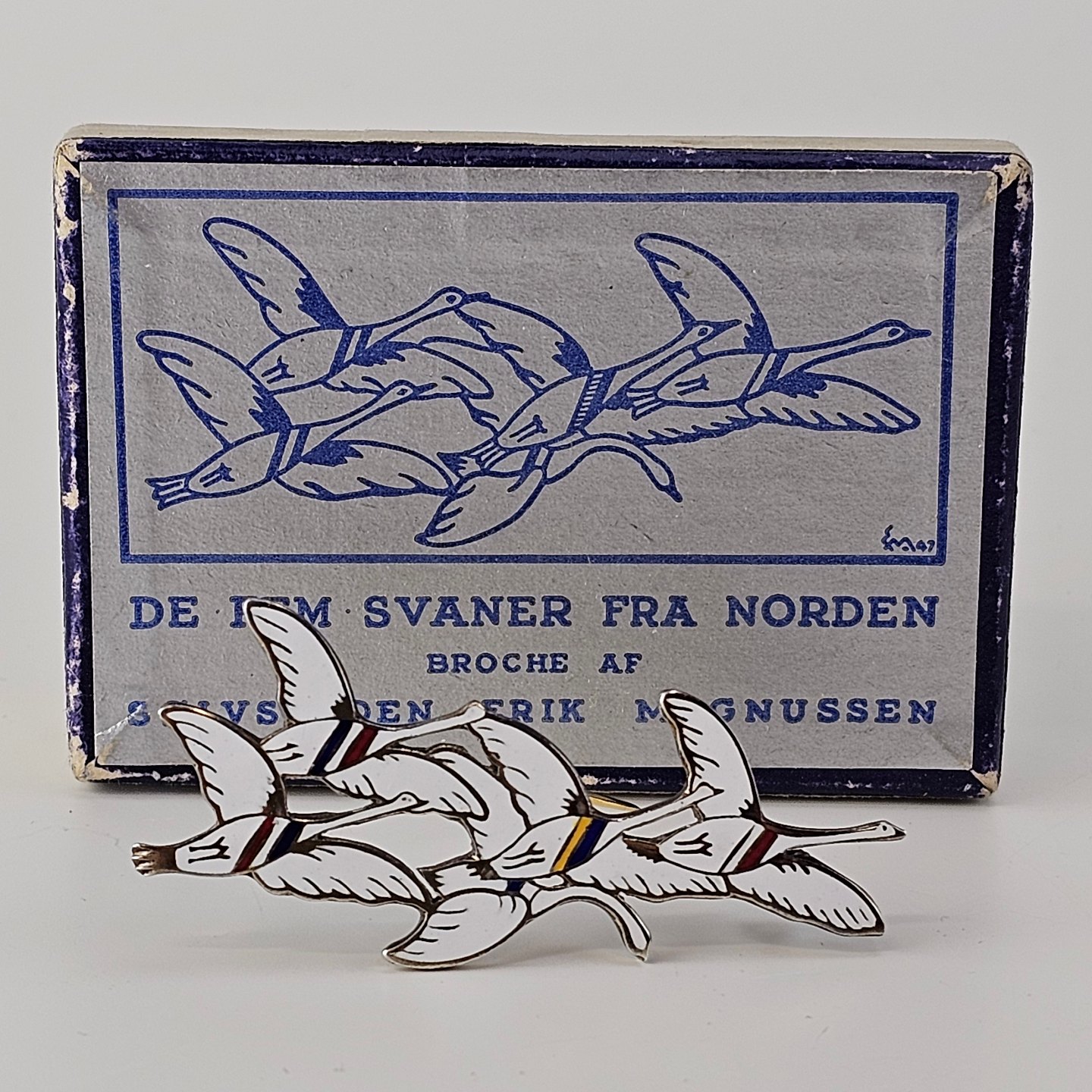 Text zugänglich auf Dänische: Broche i sterling sølv og emalje med motiv af fem svaner dekoreret med farver for de fem nordiske lande