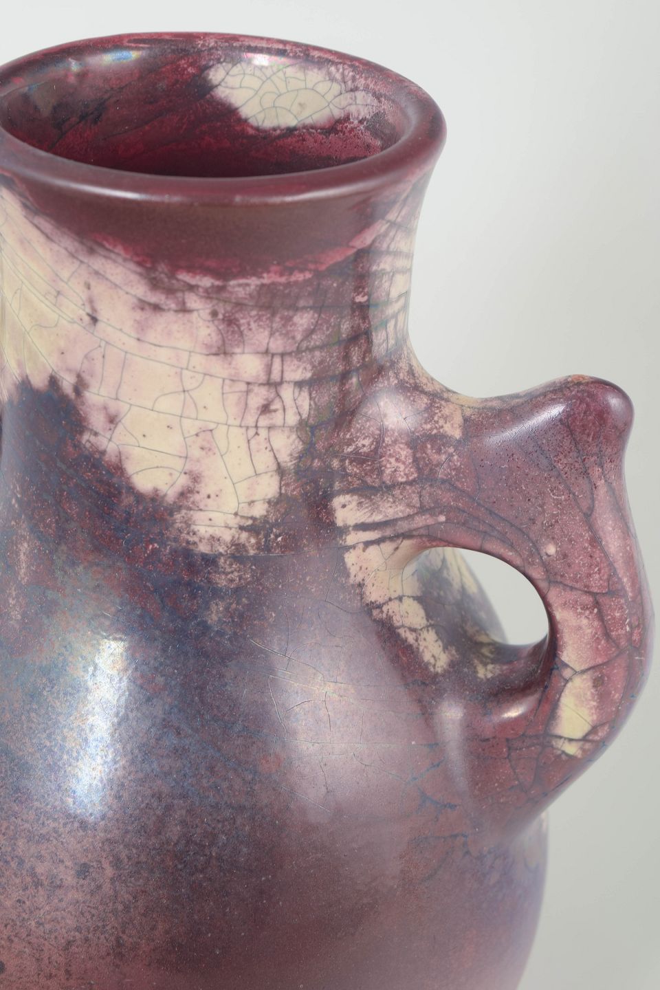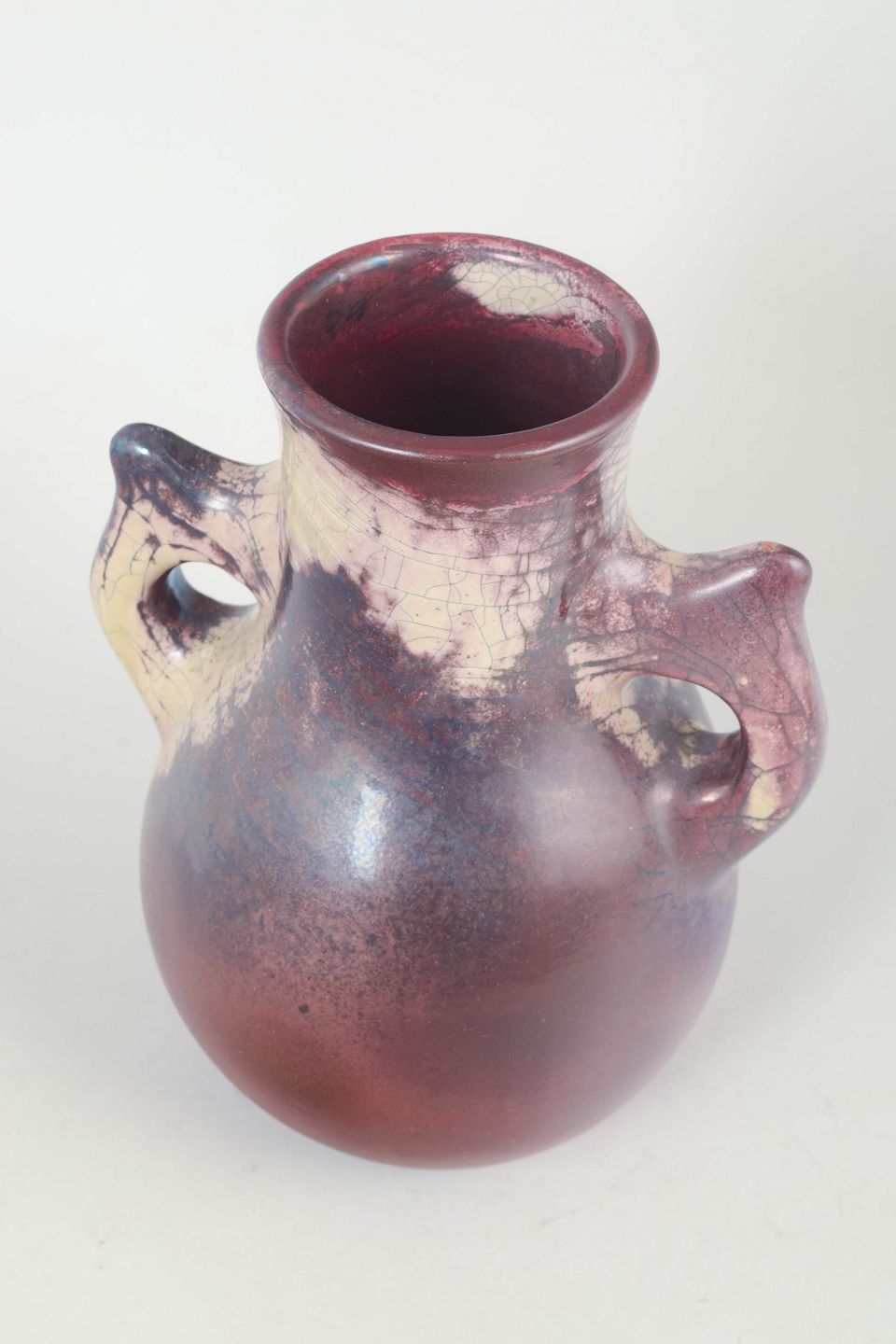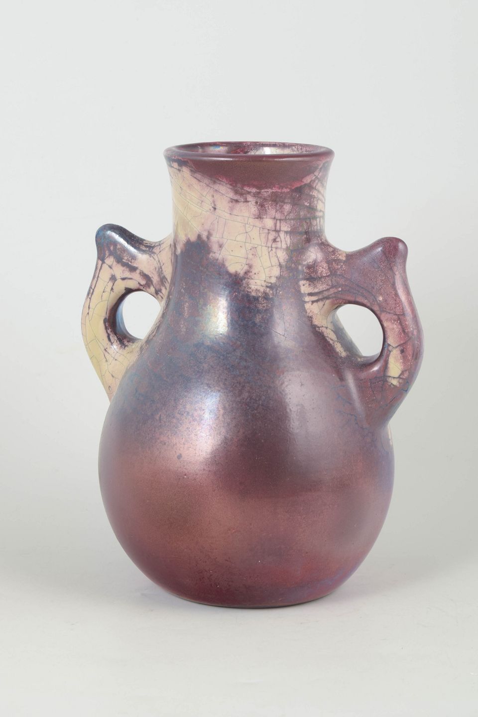 Dekorativ vase i stentøj med iriserende lustreglasur i dybe violette og metalliske nuancer. Modellen er udført med to karakteristiske hanke og rund korpus, typisk for Kählers kunstneriske produktion i slutningen af 1800-tallet.