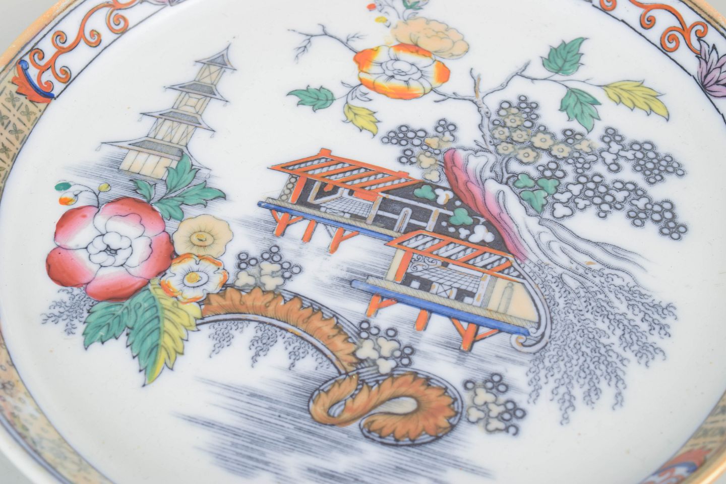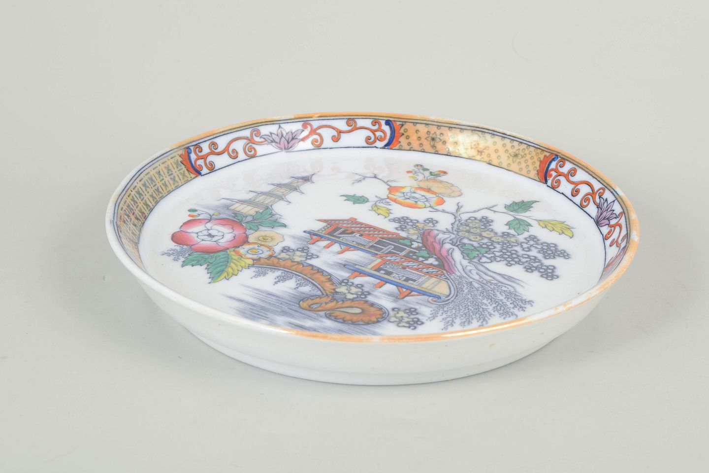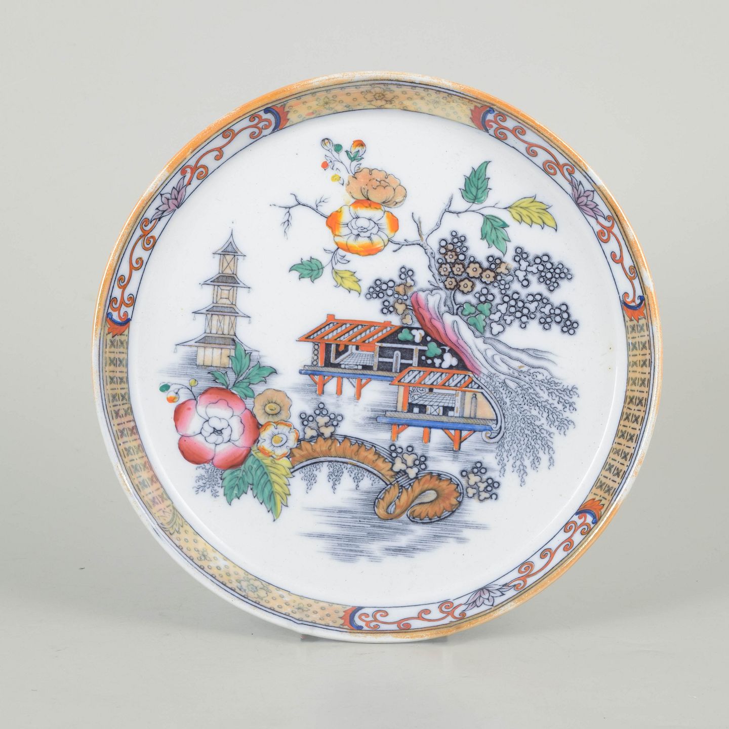 Rundt fad i fajance med polykrom dekoration i orientalistisk japansk stil med pagodemotiv, bygninger, fugl og blomster. Model Japan, produceret i perioden 1866–1925 og dateret til 1880’erne.