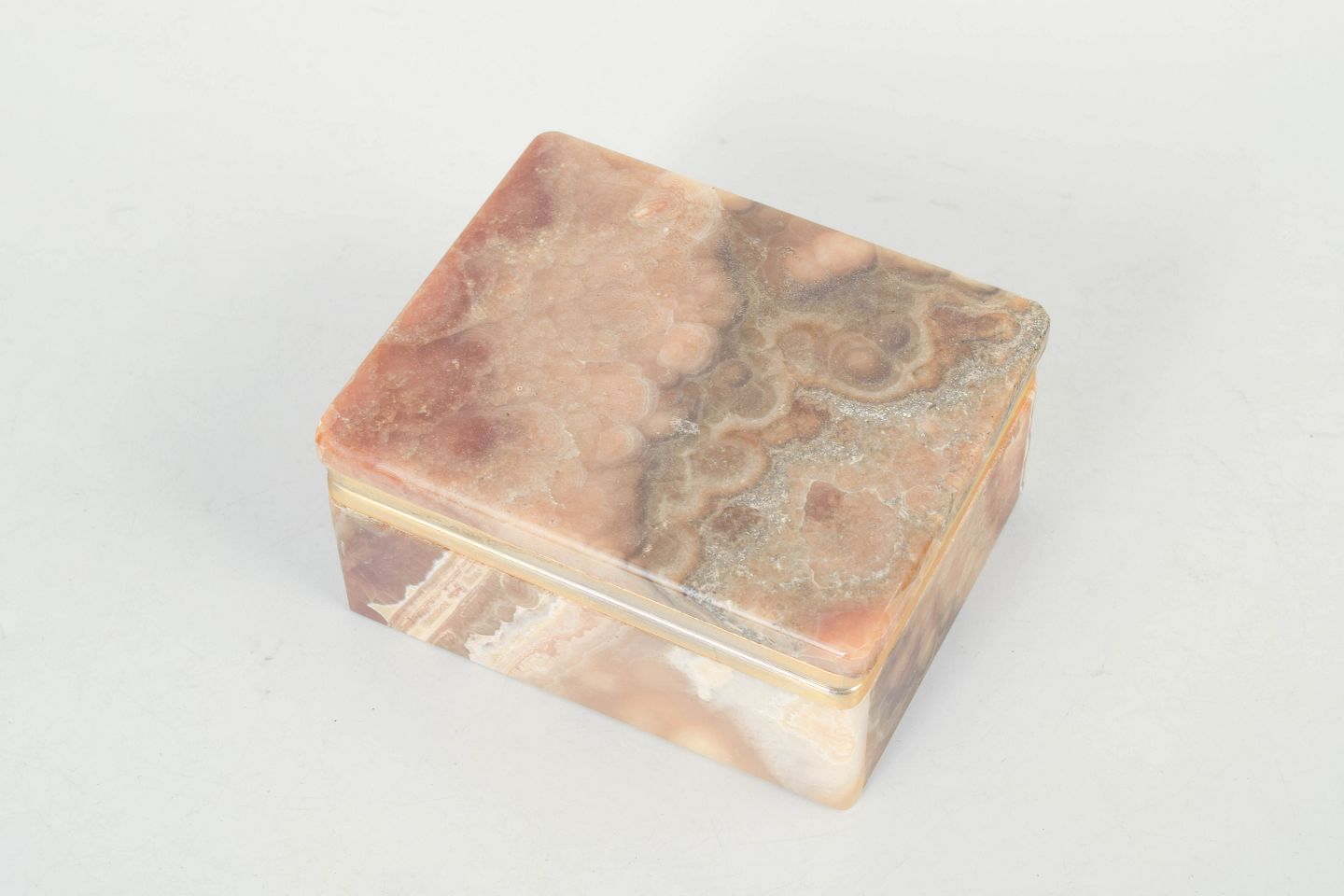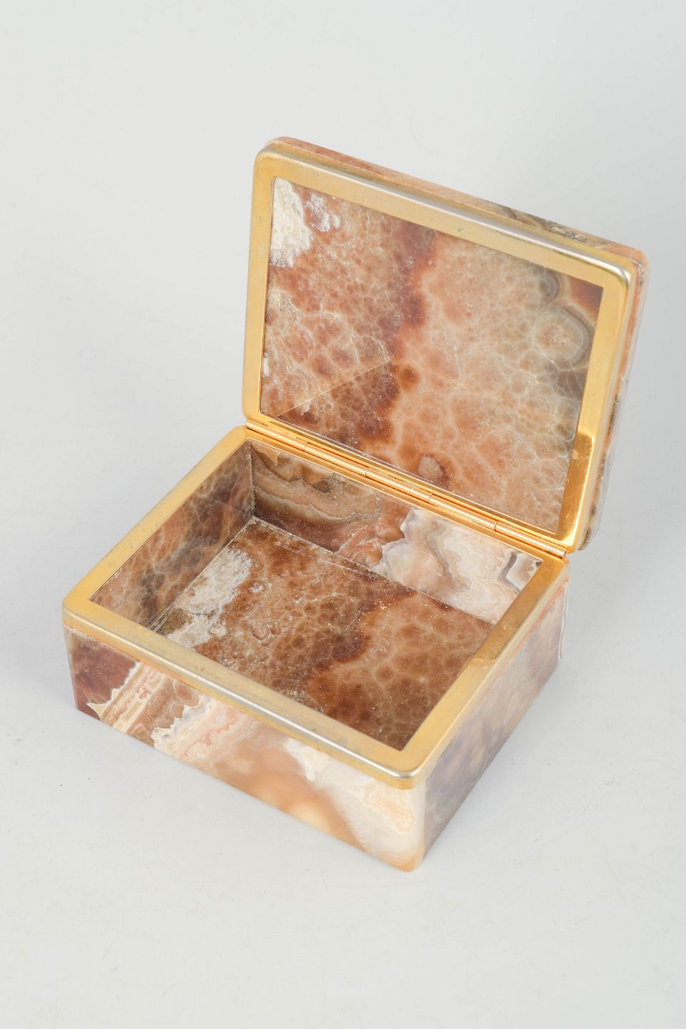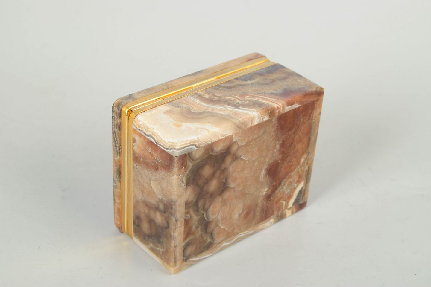 Kvadratisk æske med låg udført i alabast med markant flerfarvet åretegning i brune, beige og cremefarvede nuancer. Afsluttet med et elegant bånd i messing, der fremhæver det klassiske art deco formsprog.