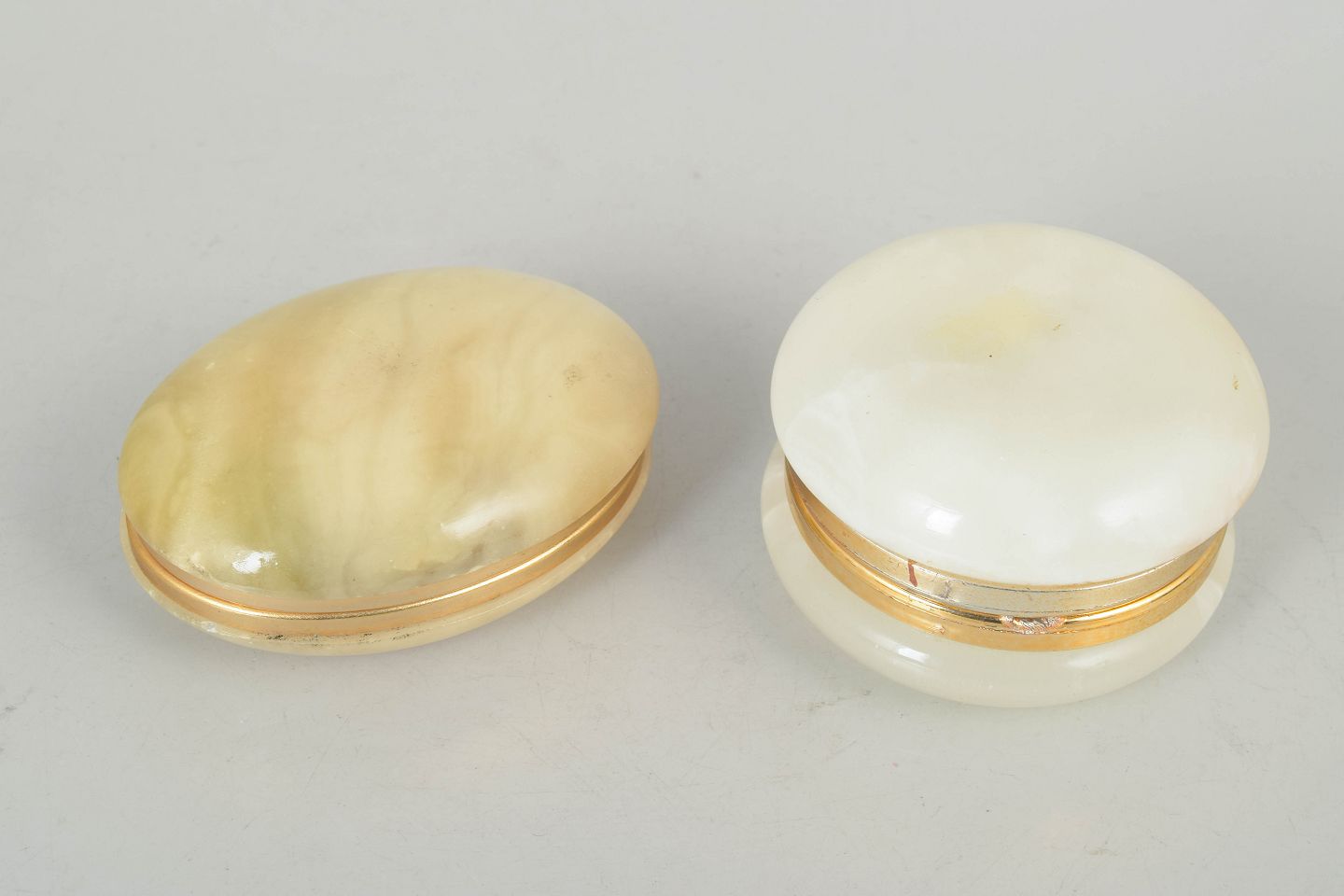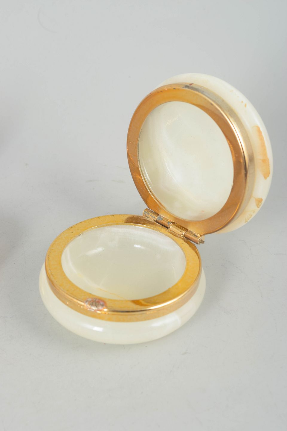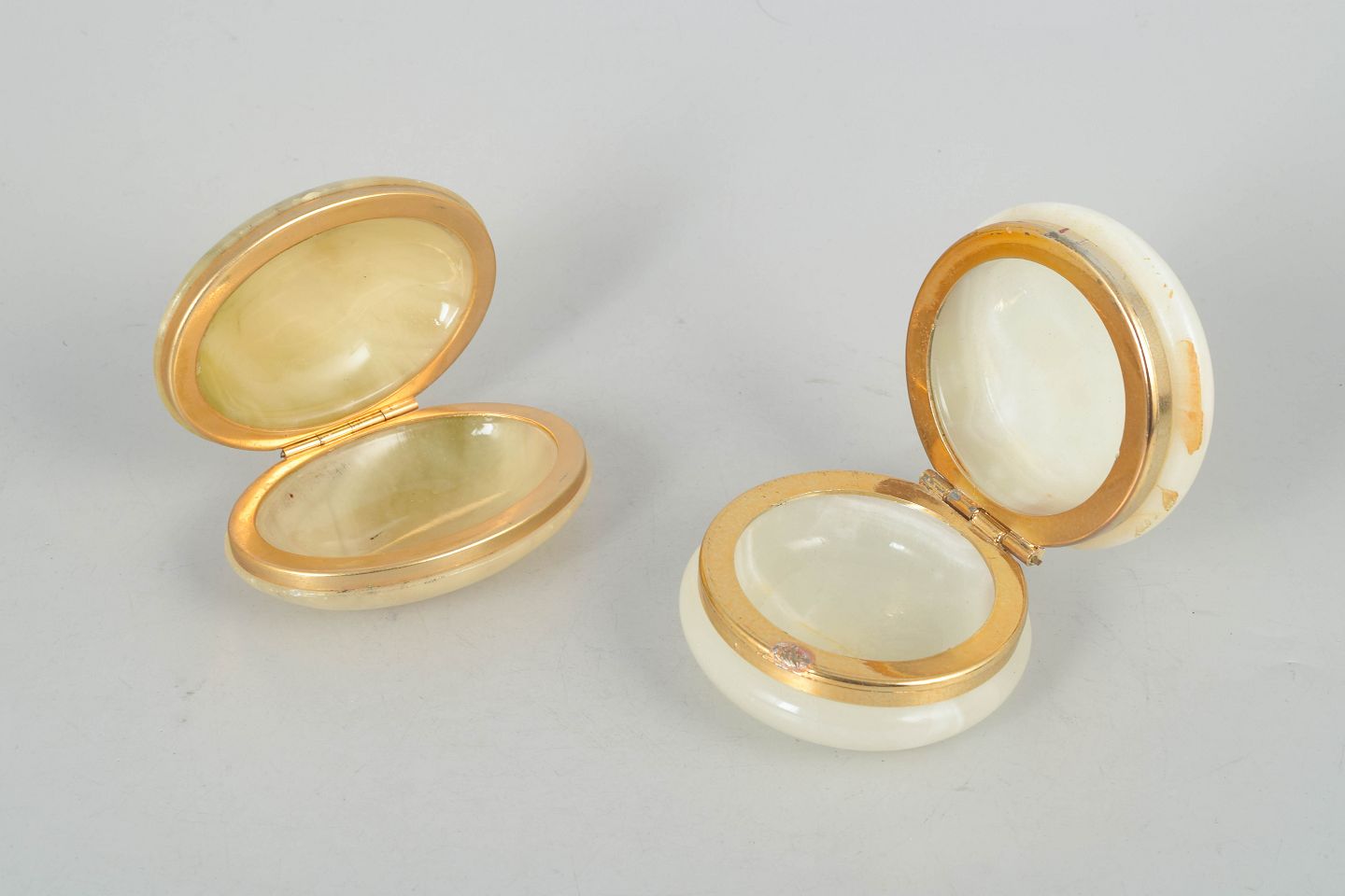 To ovale lågæsker udført i alabast med indsatte bånd i messing. Bløde, afrundede former kombineret med det varme metalskær giver et elegant art deco udtryk, mens alabastens naturlige åretegning fremhæver materialets dekorative karakter.