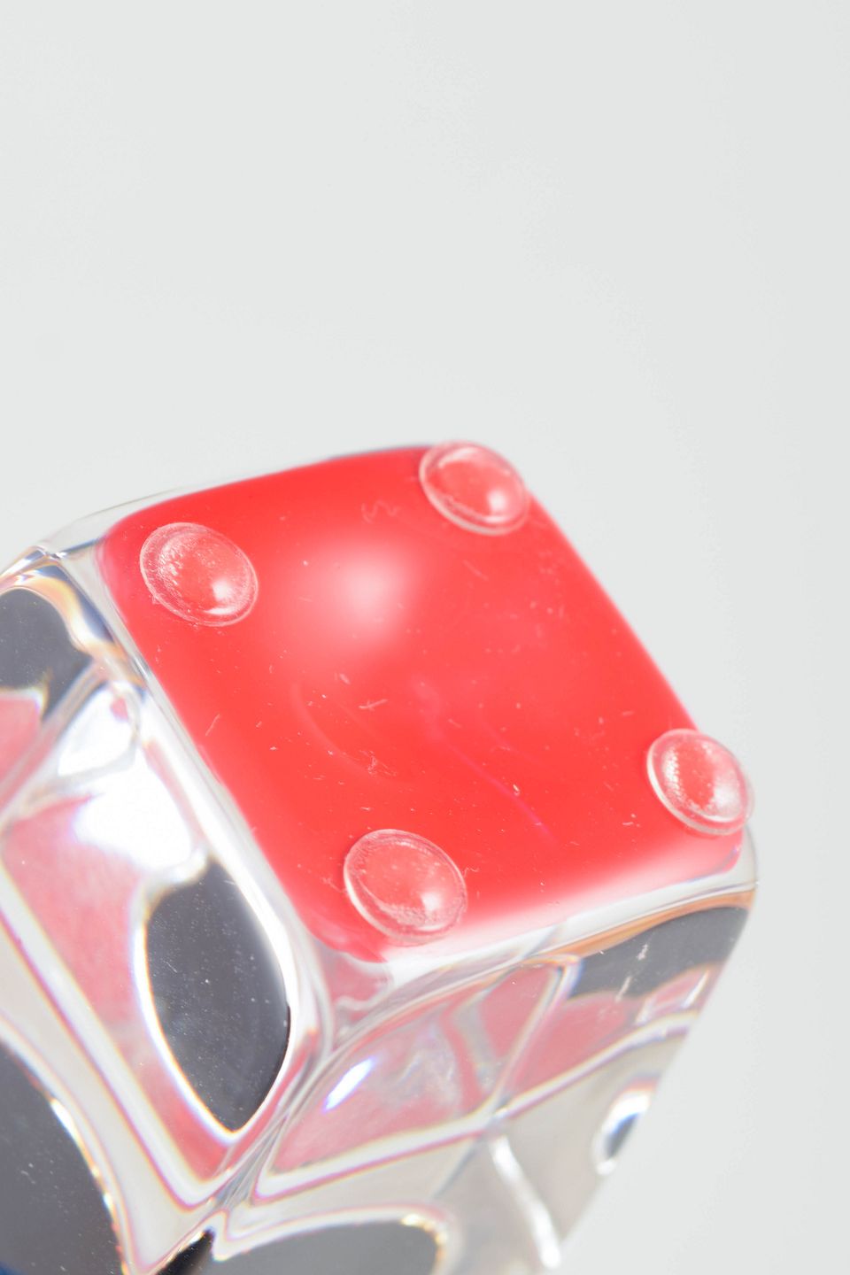Geometrisk formet glasskulptur i form af neglelak udført i klart og farvet glas med massiv kvadratisk base og cylindrisk top i mørk tone.