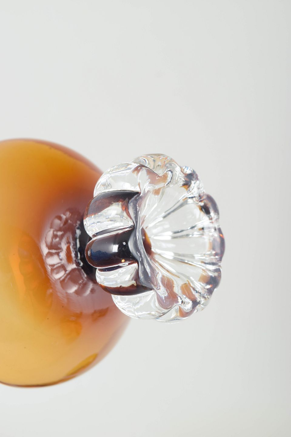 Elegante dessertskåle i mundblæst glas med ravfarvet kumme og dekorativ fod i klart glas med rillet struktur, typisk for svensk glasdesign fra perioden.