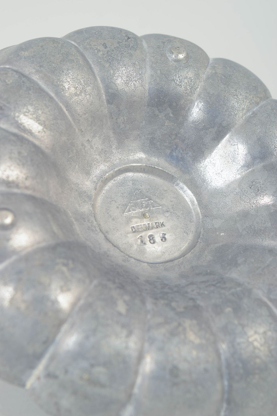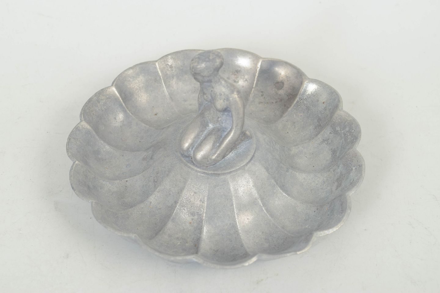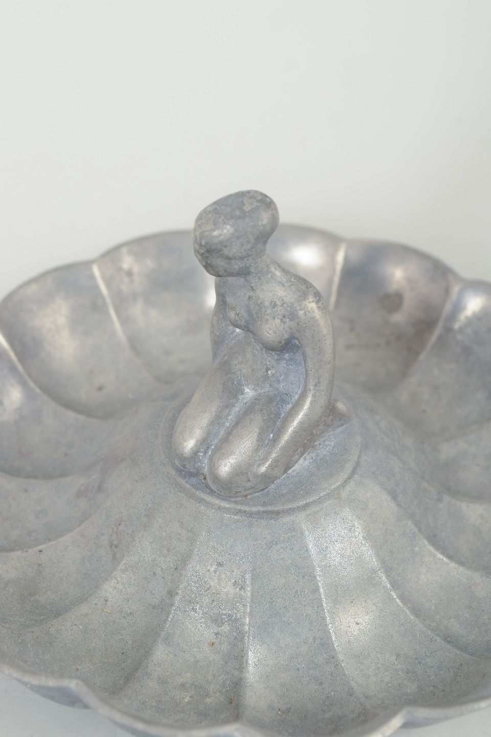 Dekorativ tin skål med central siddende kvindefigur, model 185, udformet med riflet rand og stiliseret art deco formsprog. Et karakteristisk design fra mellemkrigstiden med fin patinering.
