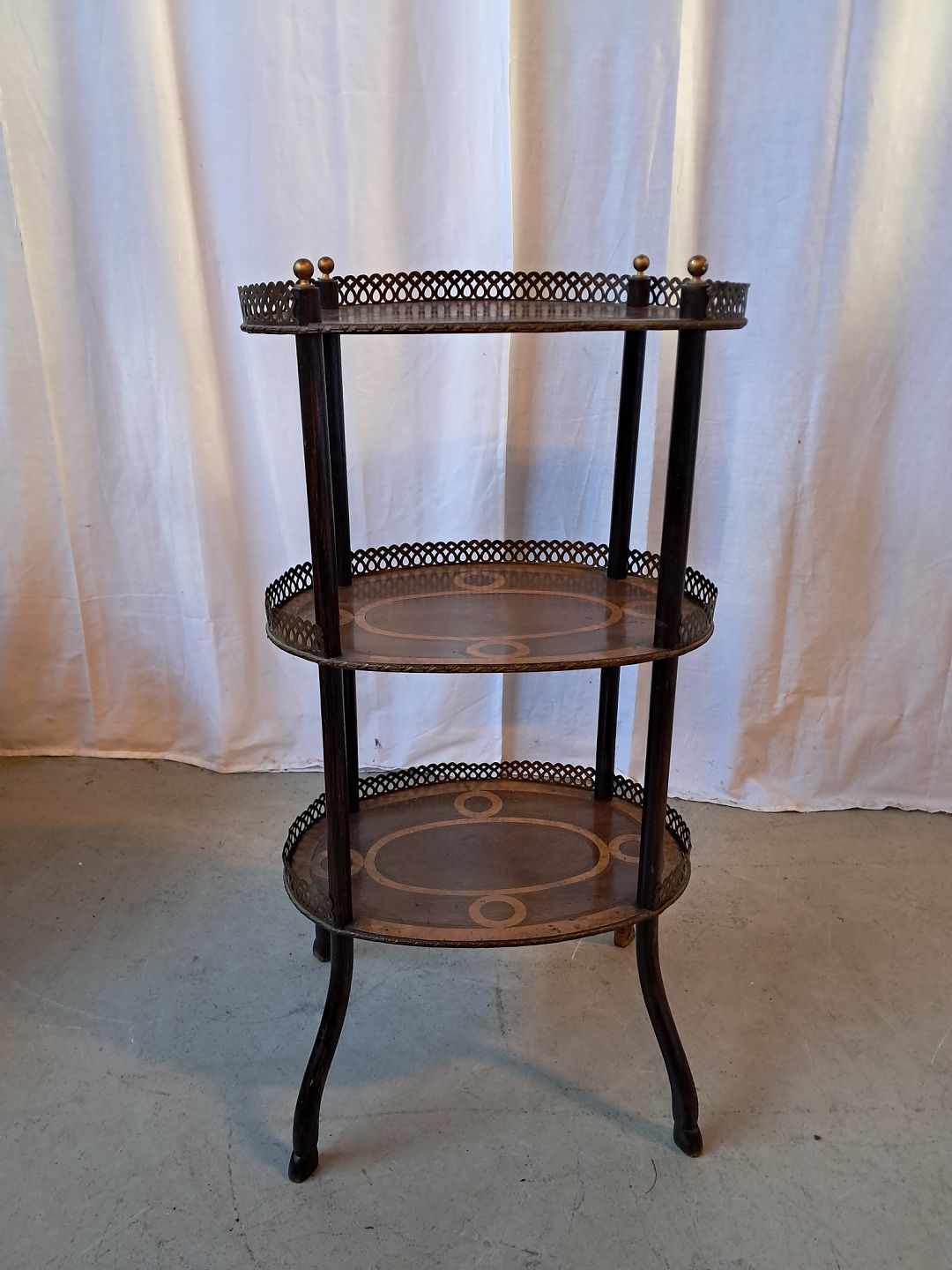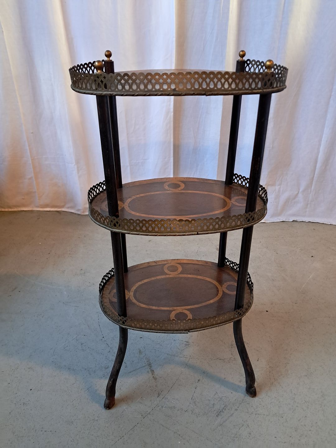 Sidebord i fineret mahogni og nødetræ med metalkant, fra 1980erne.