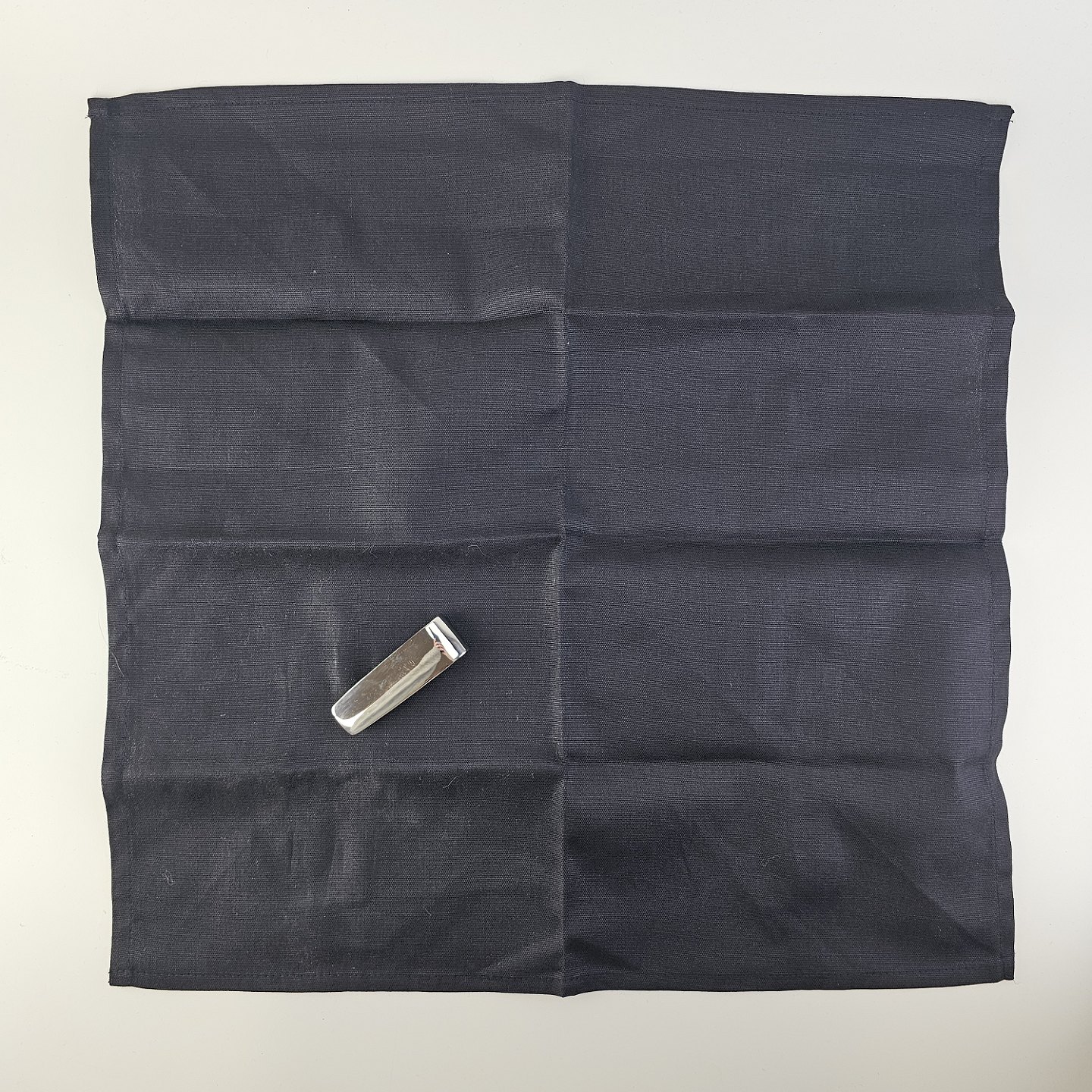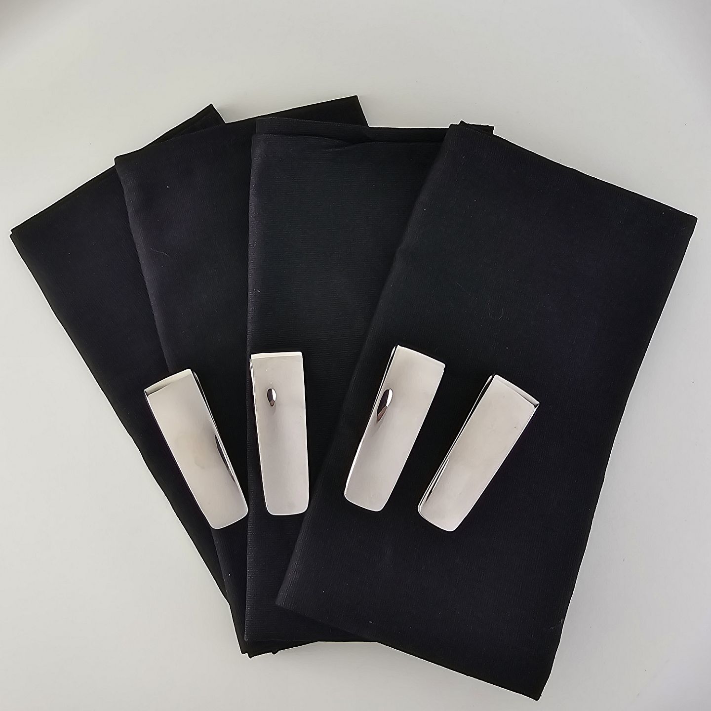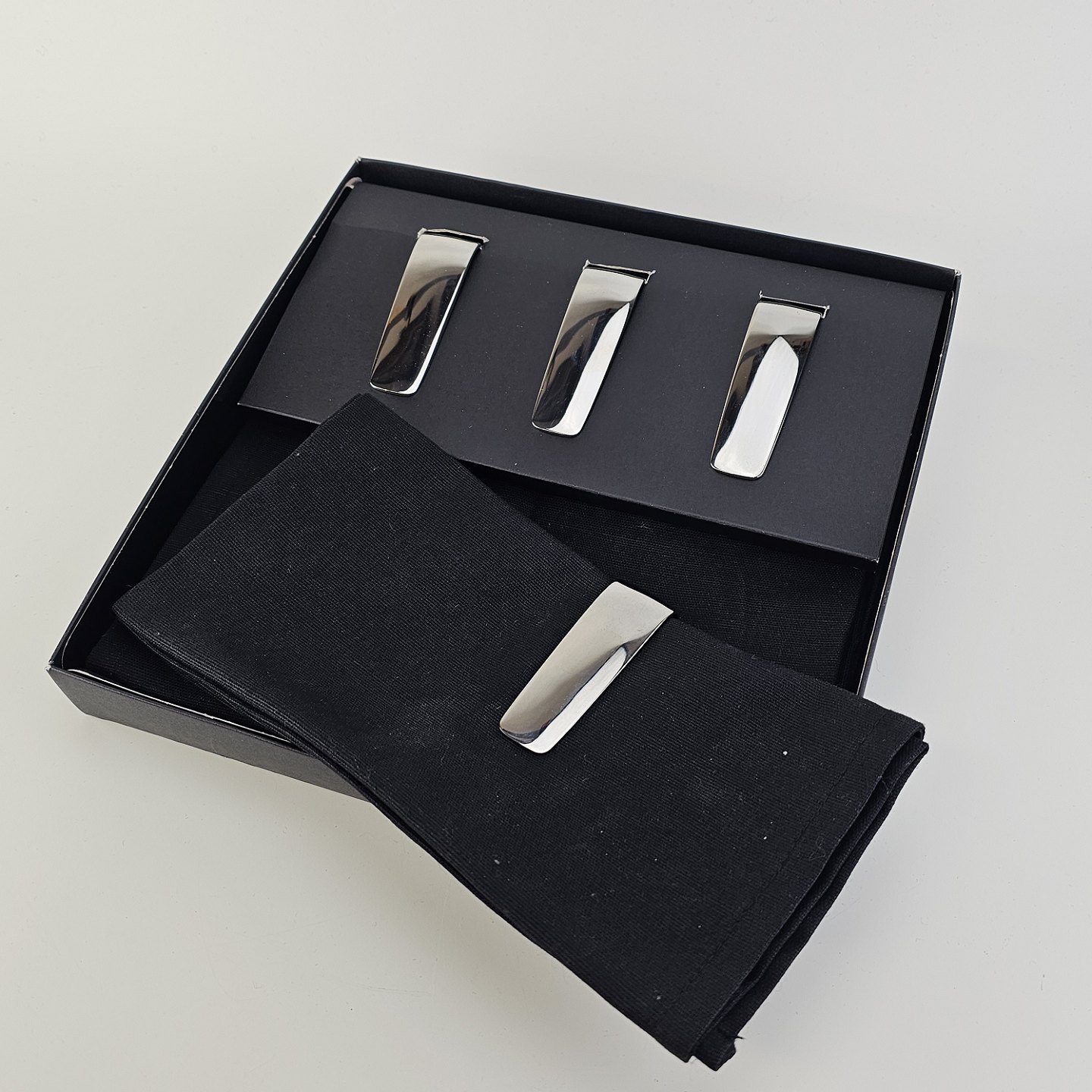 Sæt af fire servietringe i rustfrit stål med tilhørende servietter af sort stof