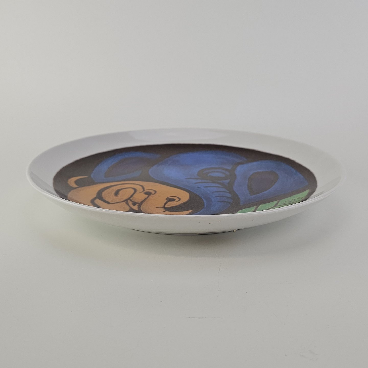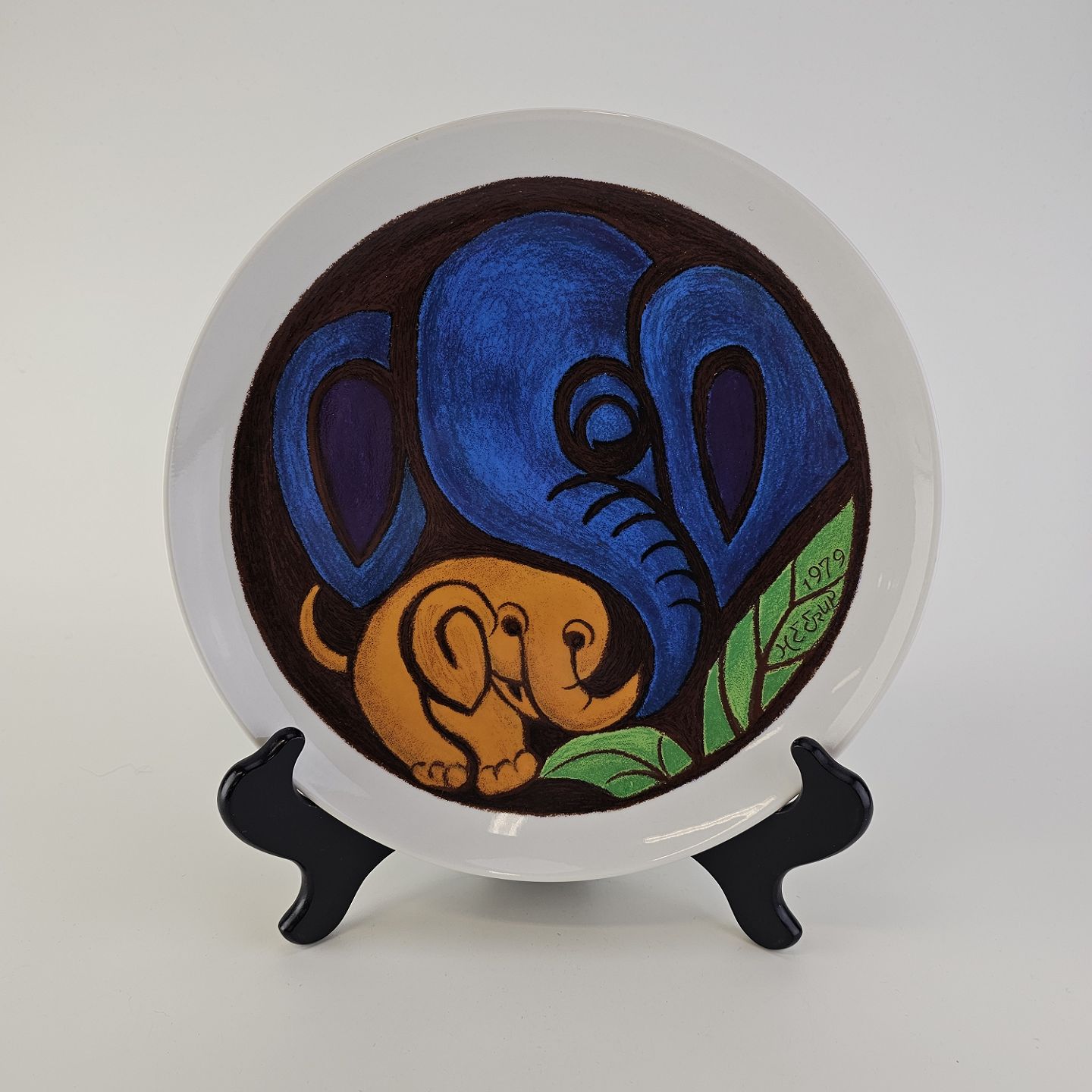 Text zugänglich auf Dänische: Platte af kongeligt porcelæn med motiv af elefanter i blå, orange og grønne farver. Nr. 115/1200