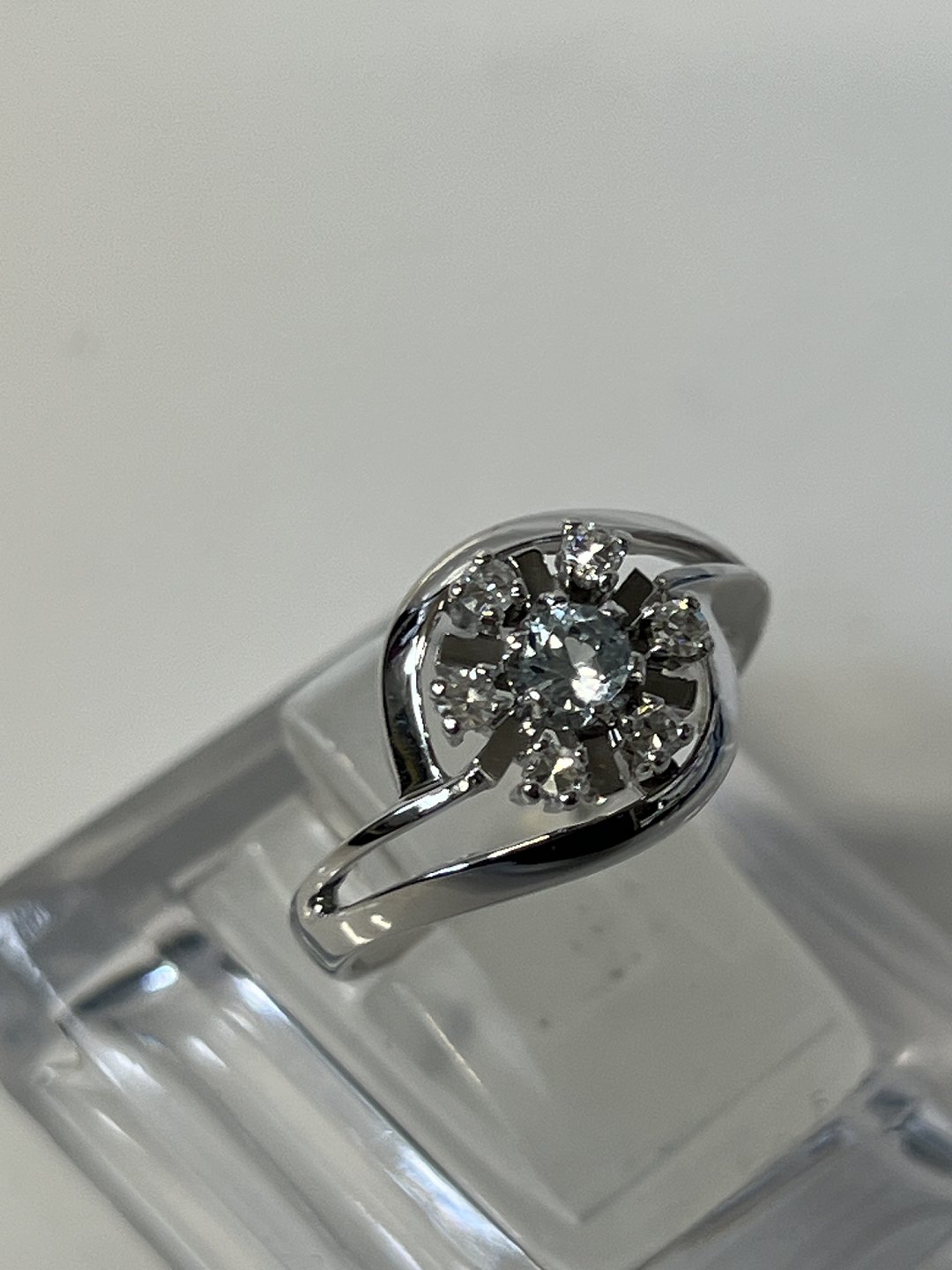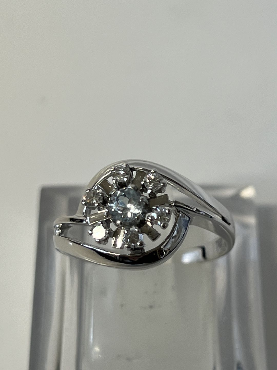 14 karat Damering, med indlagt lyseblå sten og brillanter, i hvidguld.