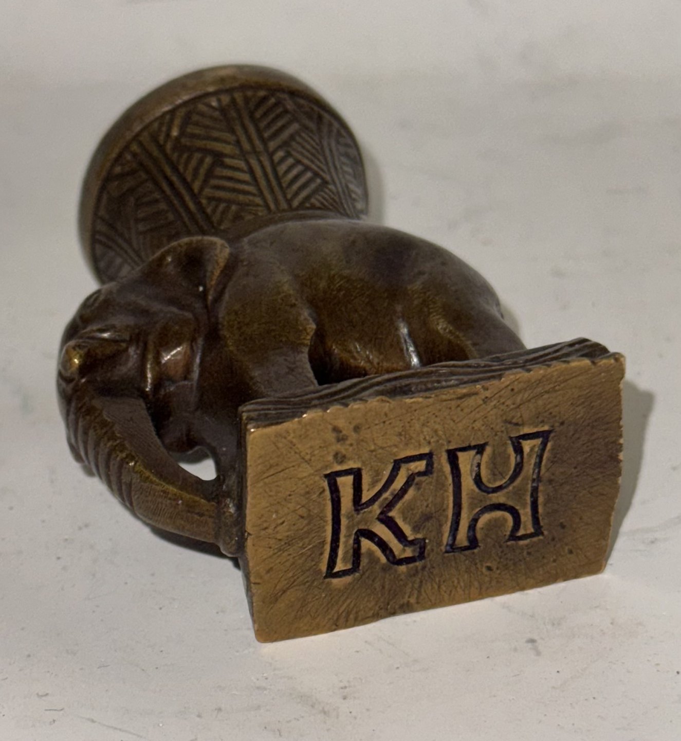 Mogens Ballin (1871-1914): Figur af elefant med kurv på ryggen i bronce. Støbt i ét. I god stand. På bunden indgraveret KH. Ikke stemplet. Muligvis tiltænkt som signet ! Har tidligere solgt lignende figur af Mogens Ballin i tin, der fungerede som strøbøsse. Udgaven i tin havde modelnummer T135. H. 6,8 cm.