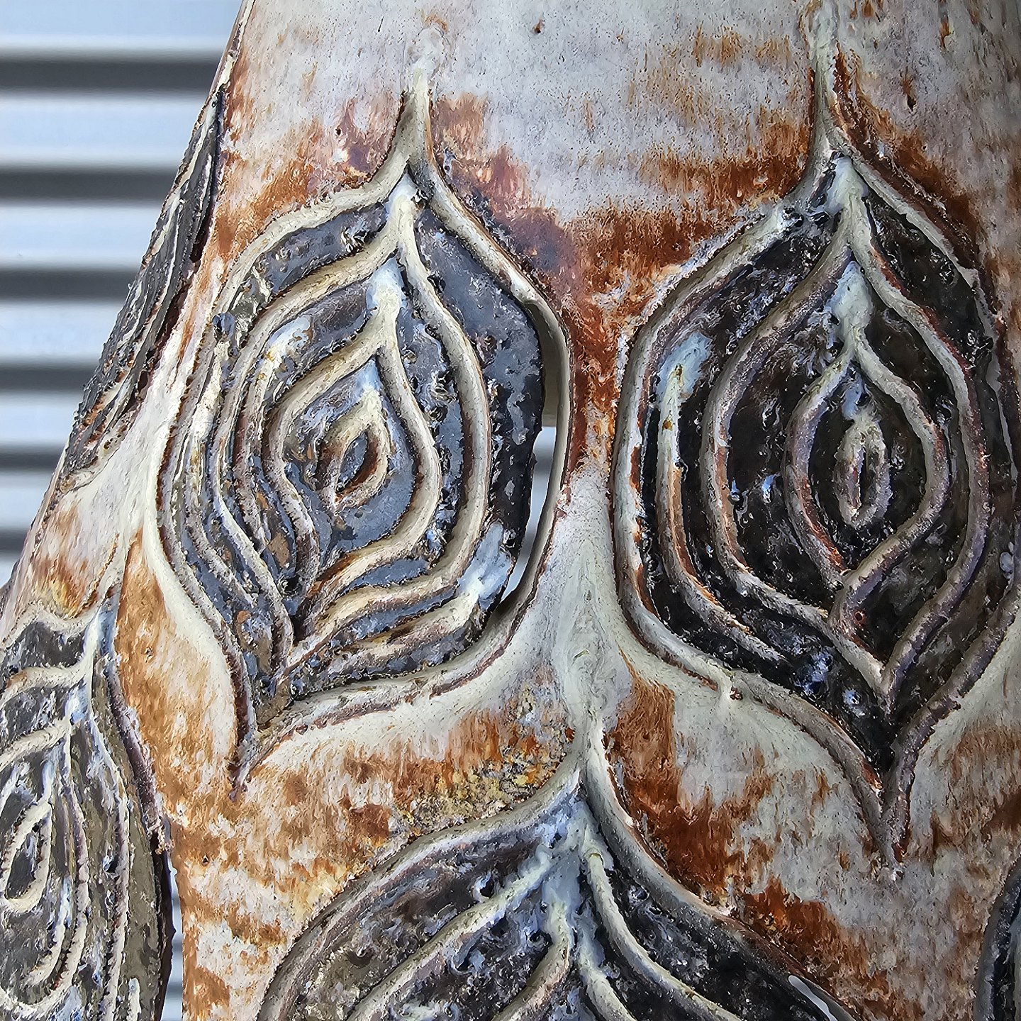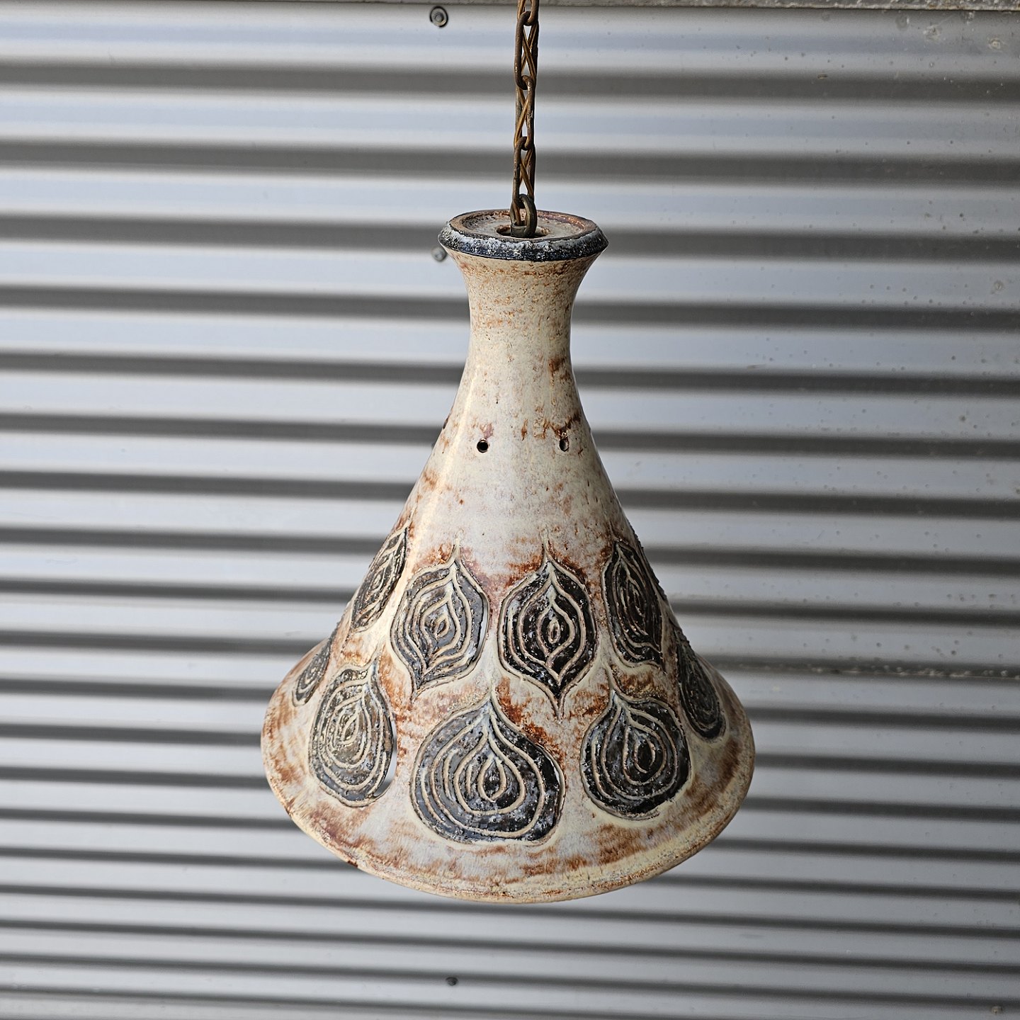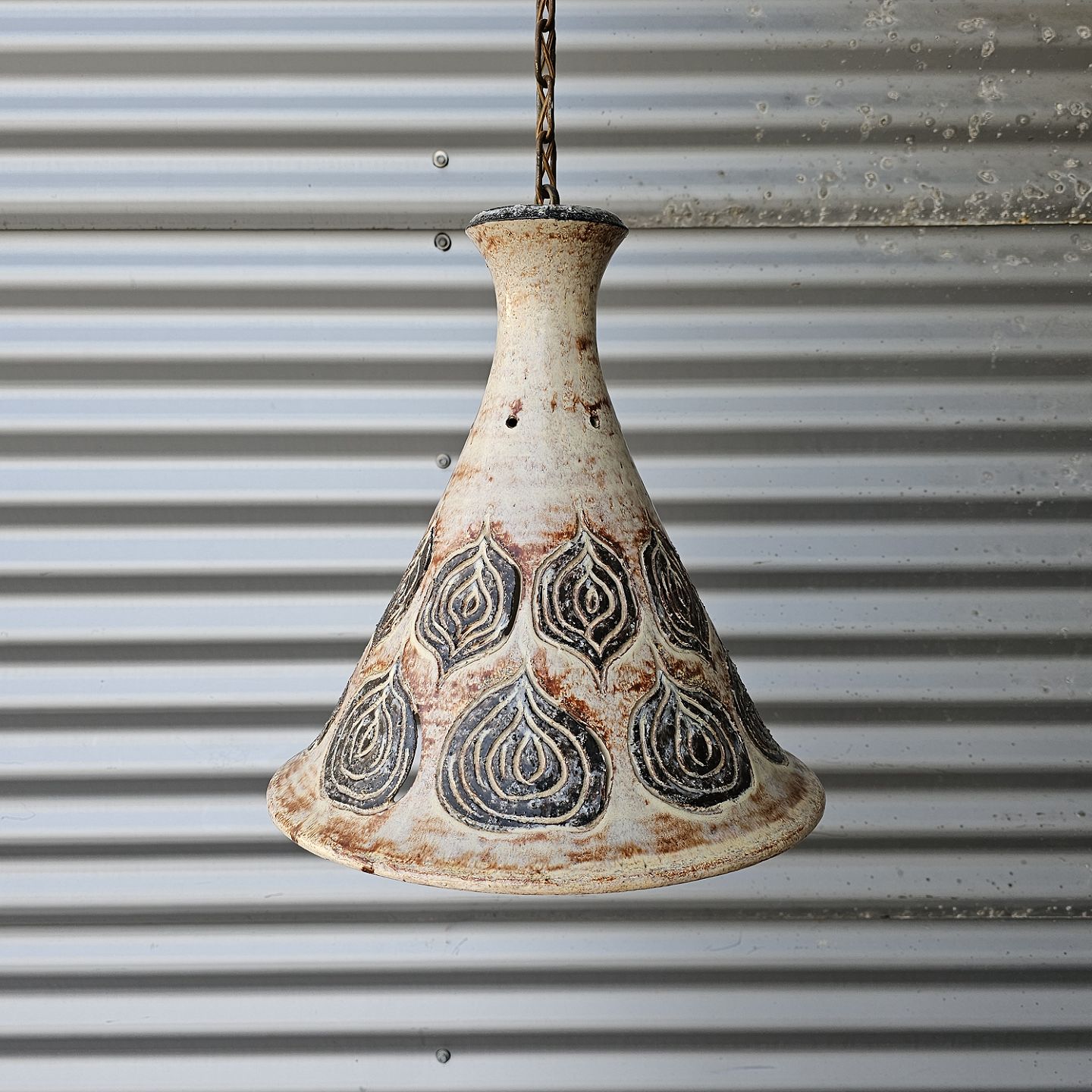 Pendel i keramik med bladmotiv og kæde til ophæng