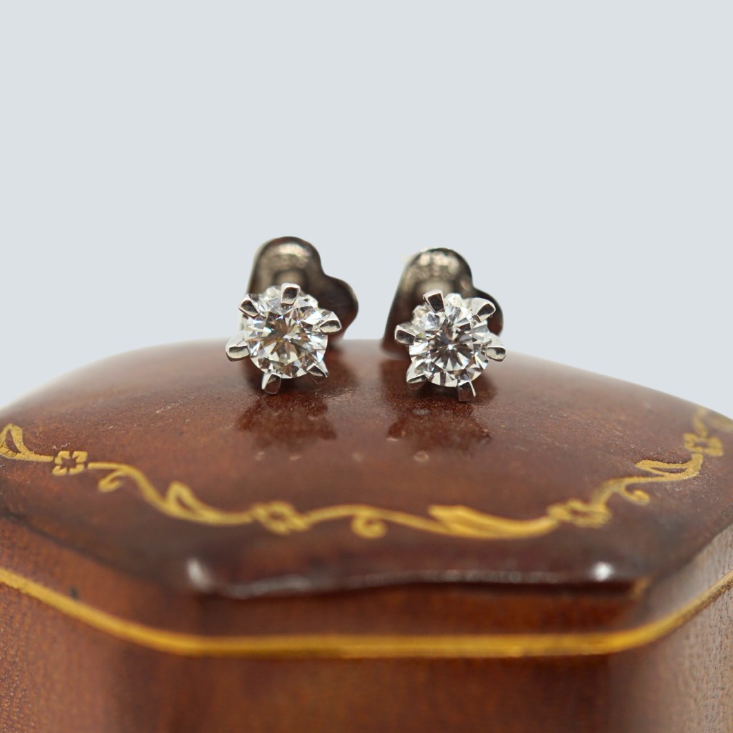 Par diamantørestikker i 18 kt. hvidguld. i alt 0.58 ct. Farve: River. Klarhed: VS SI. Lås formet som hjerte.