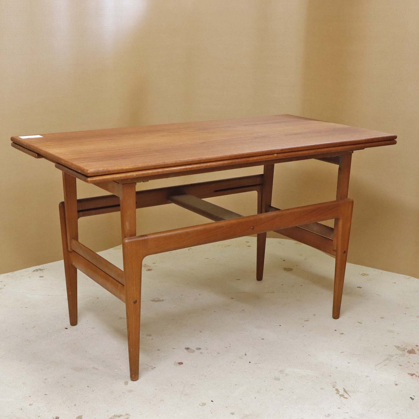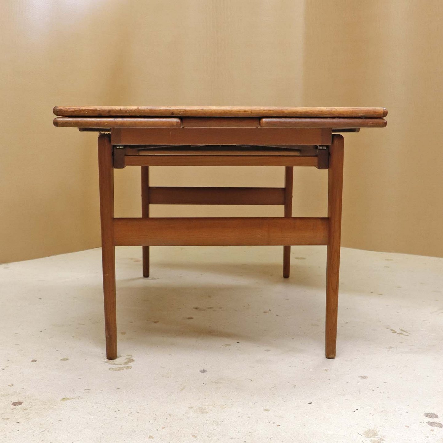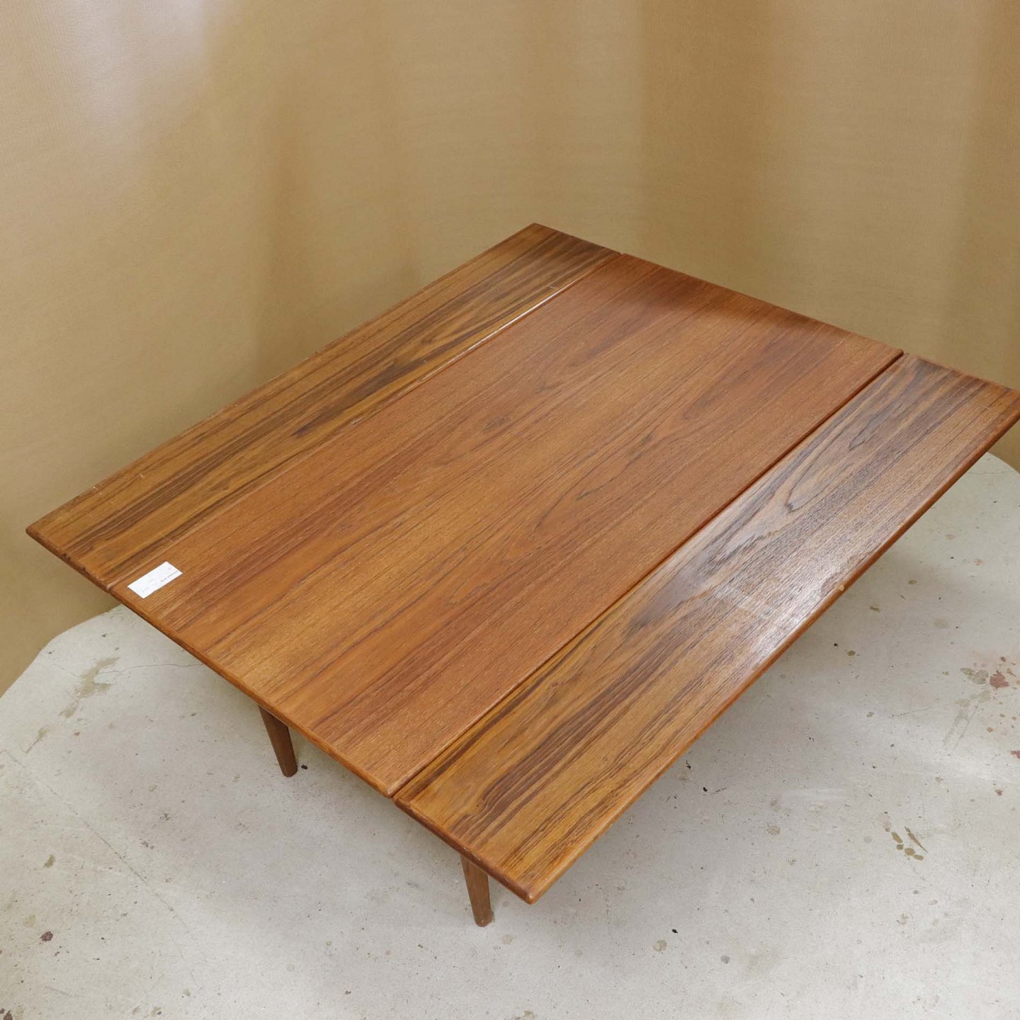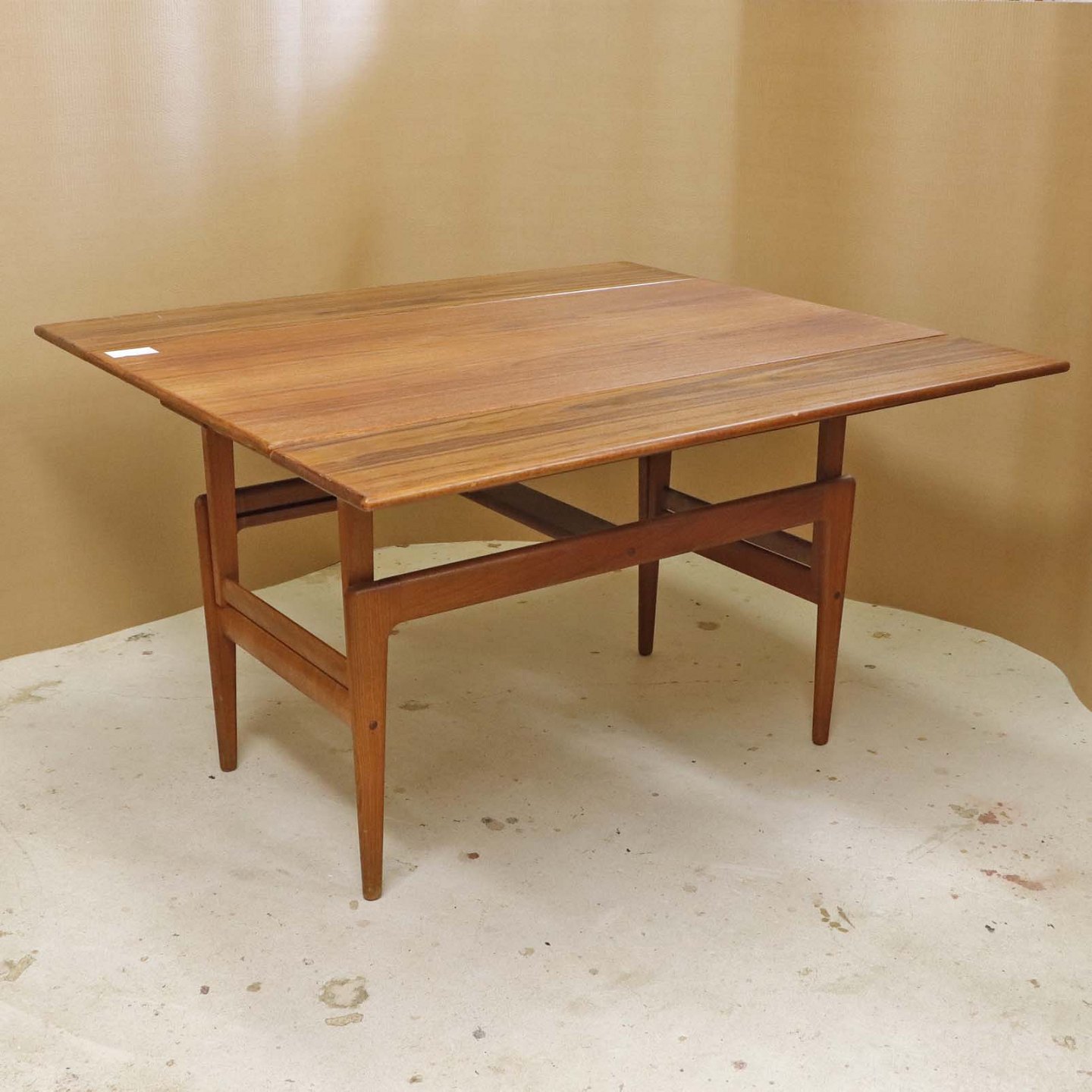Text zugänglich auf Dänische: Sofa- og spisebord i samme møbel. Bordet er fremstillet i teaktræ og har to underliggende udtræksplader, som befinder sig på hver af bordets lang-sider.