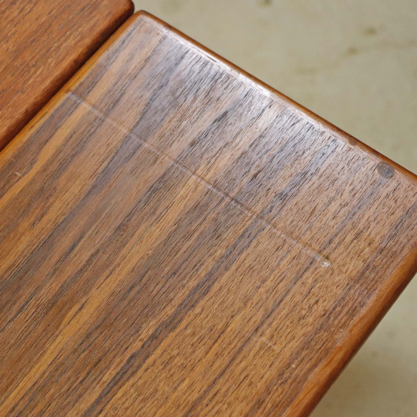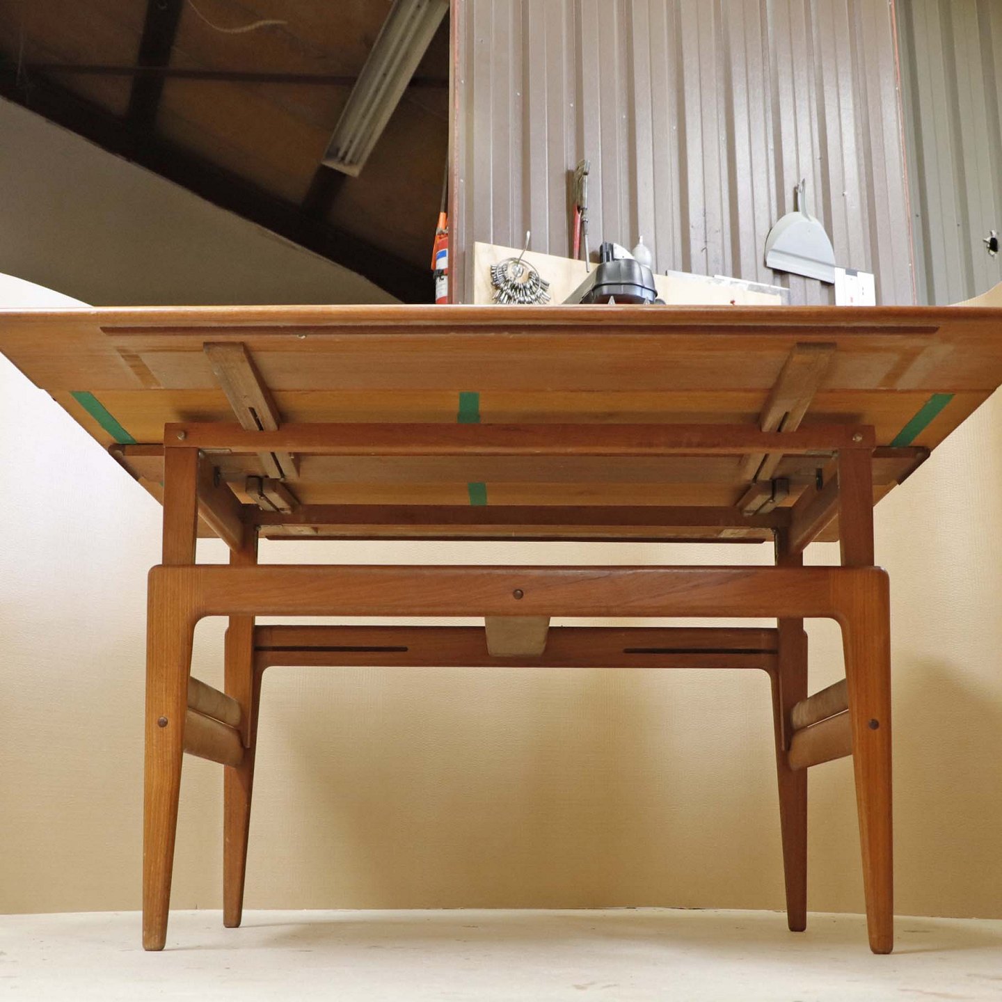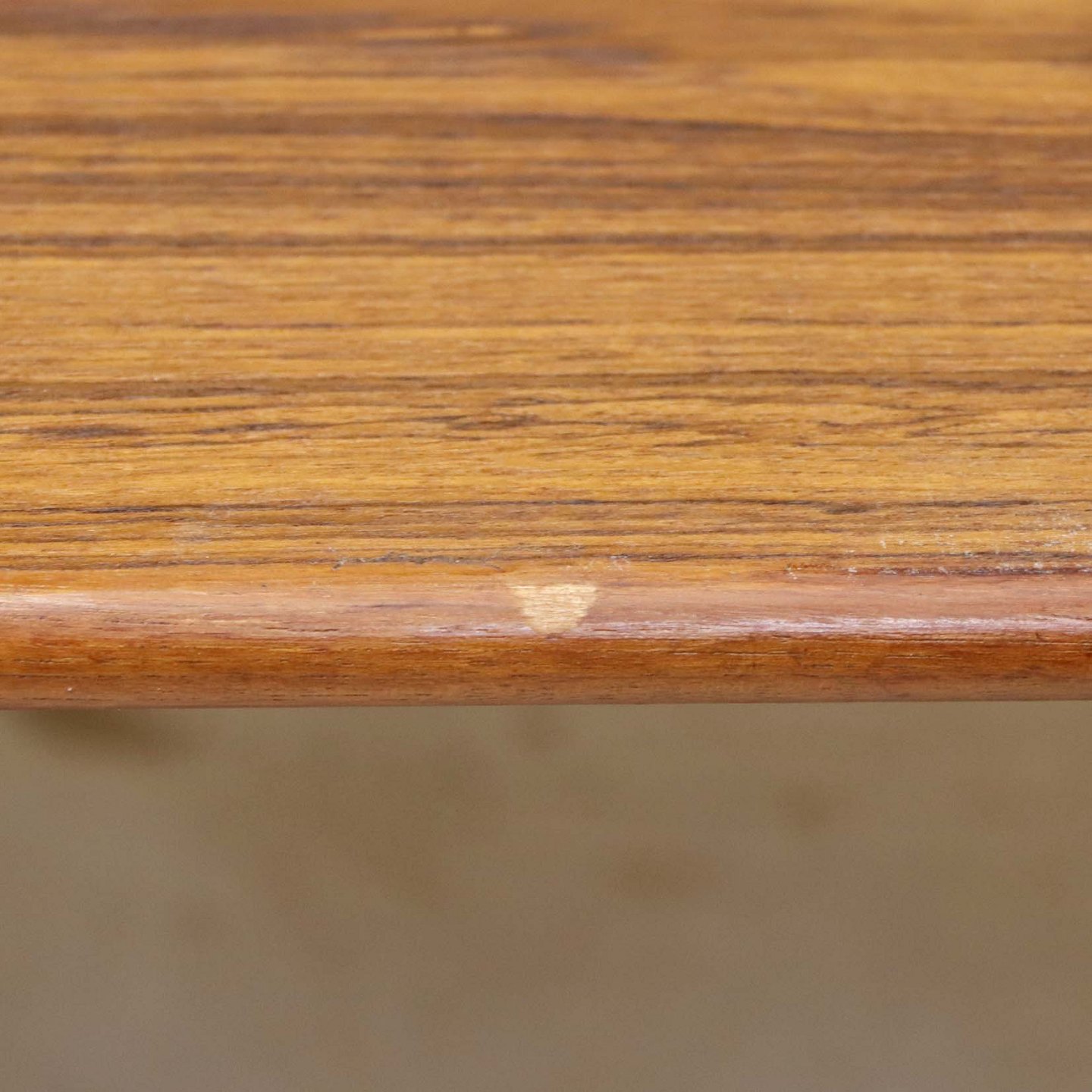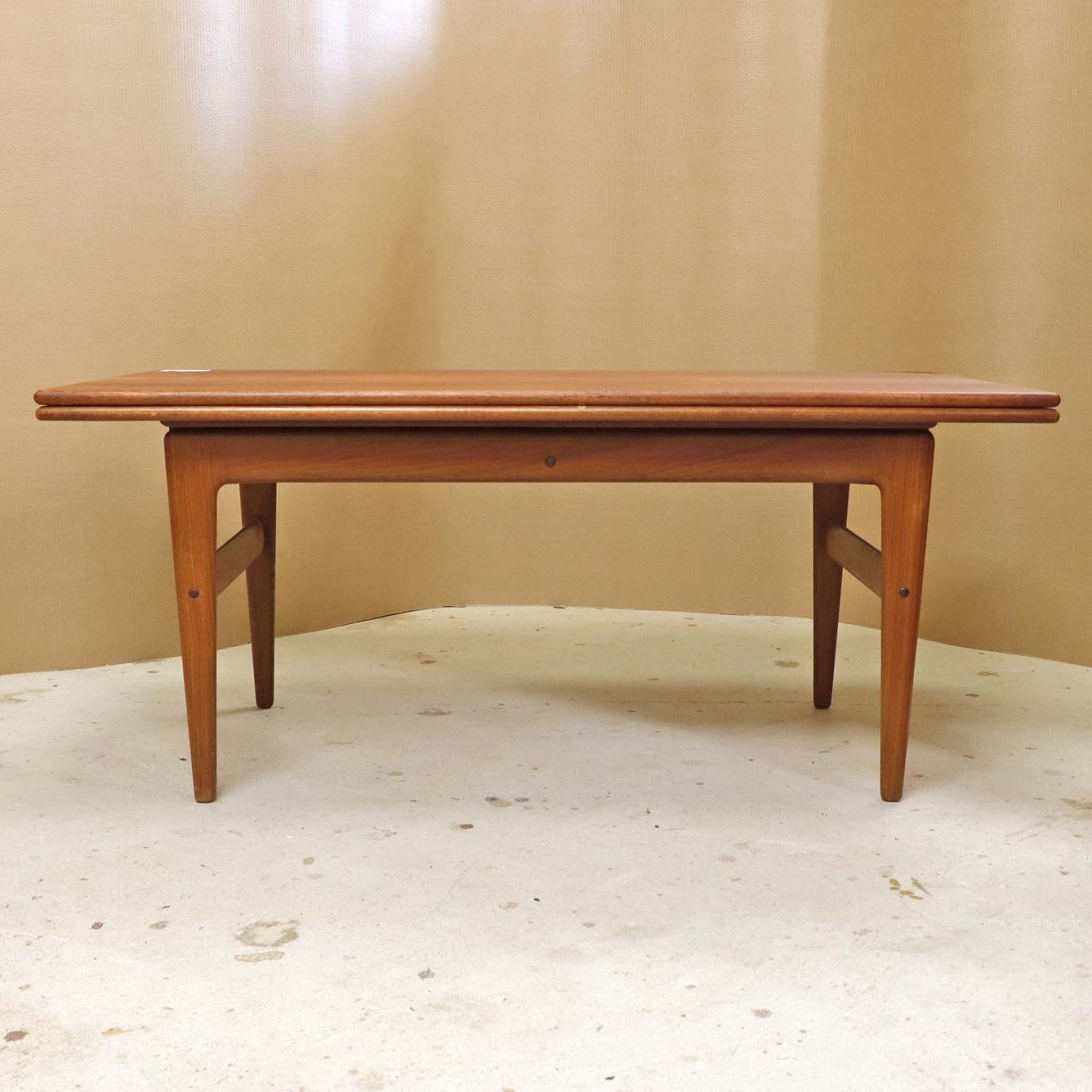 Text zugänglich auf Dänische: Sofa- og spisebord i samme møbel. Bordet er fremstillet i teaktræ og har to underliggende udtræksplader, som befinder sig på hver af bordets lang-sider.