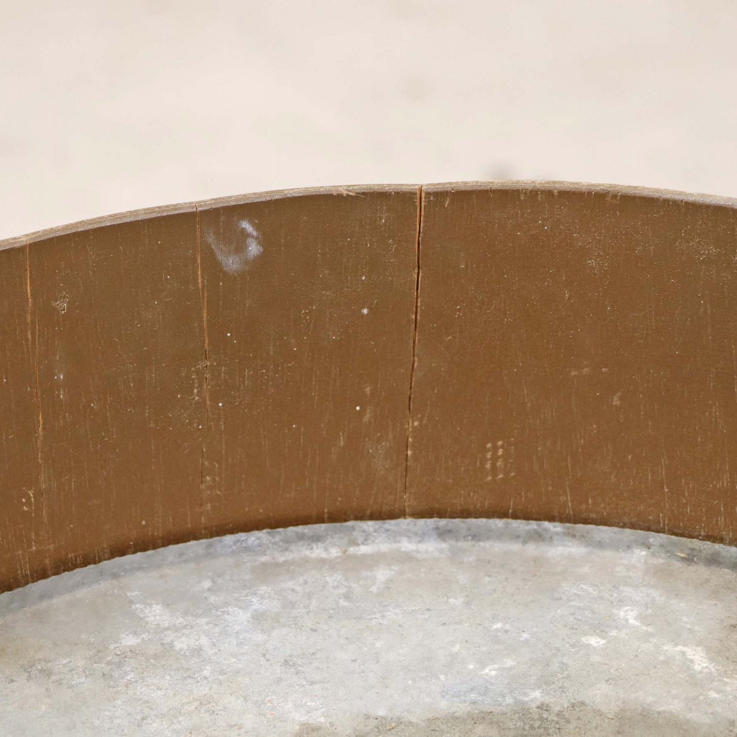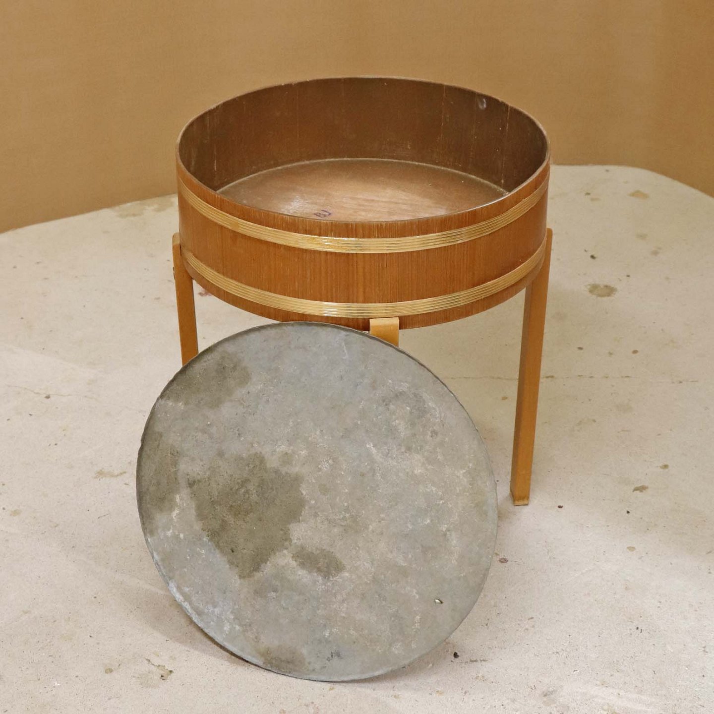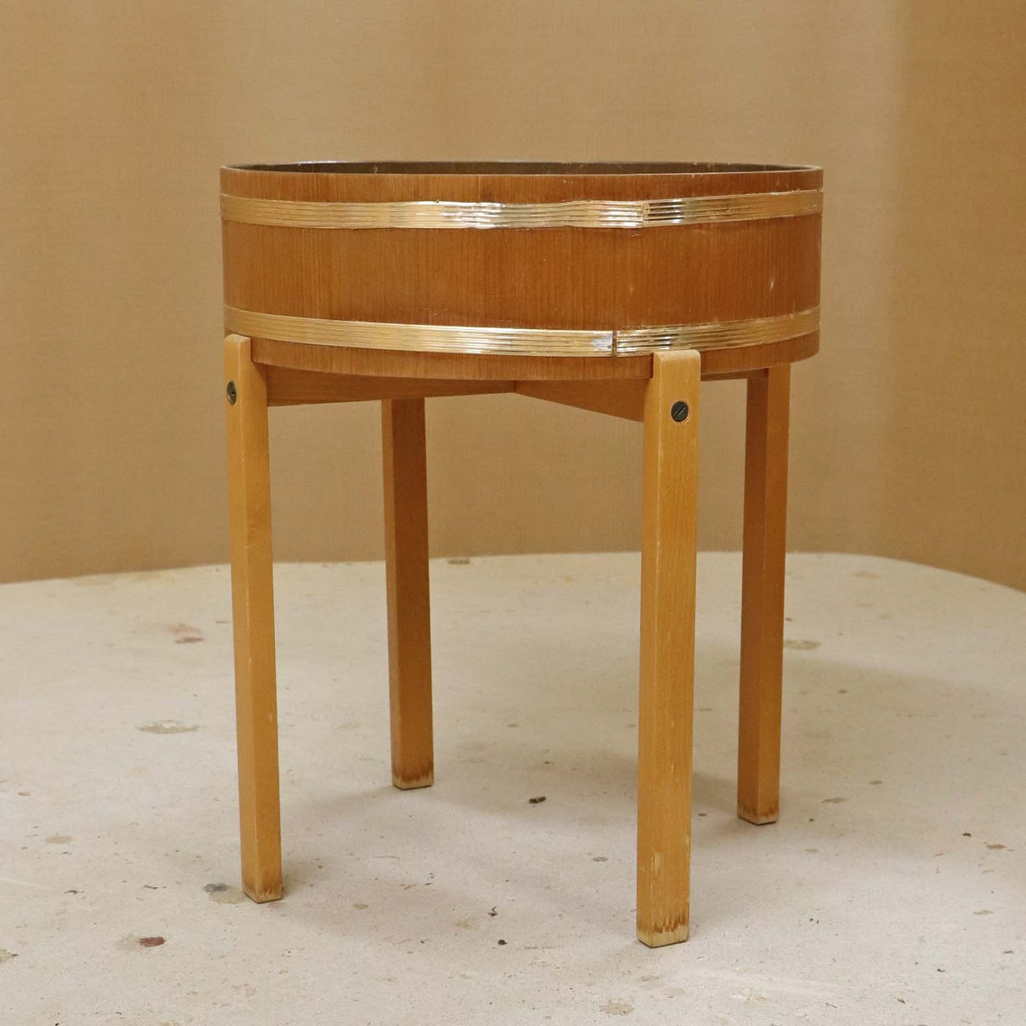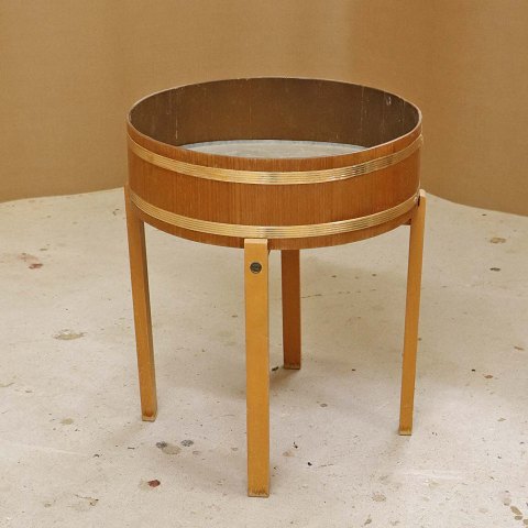 Text zugänglich auf Dänische: Tøndeformet kumme til blomster med stel i lakeret bøgetræ og ramme i teaktræ med gyldne dekoraktionsbånd og aftagelig bundplade i zink.