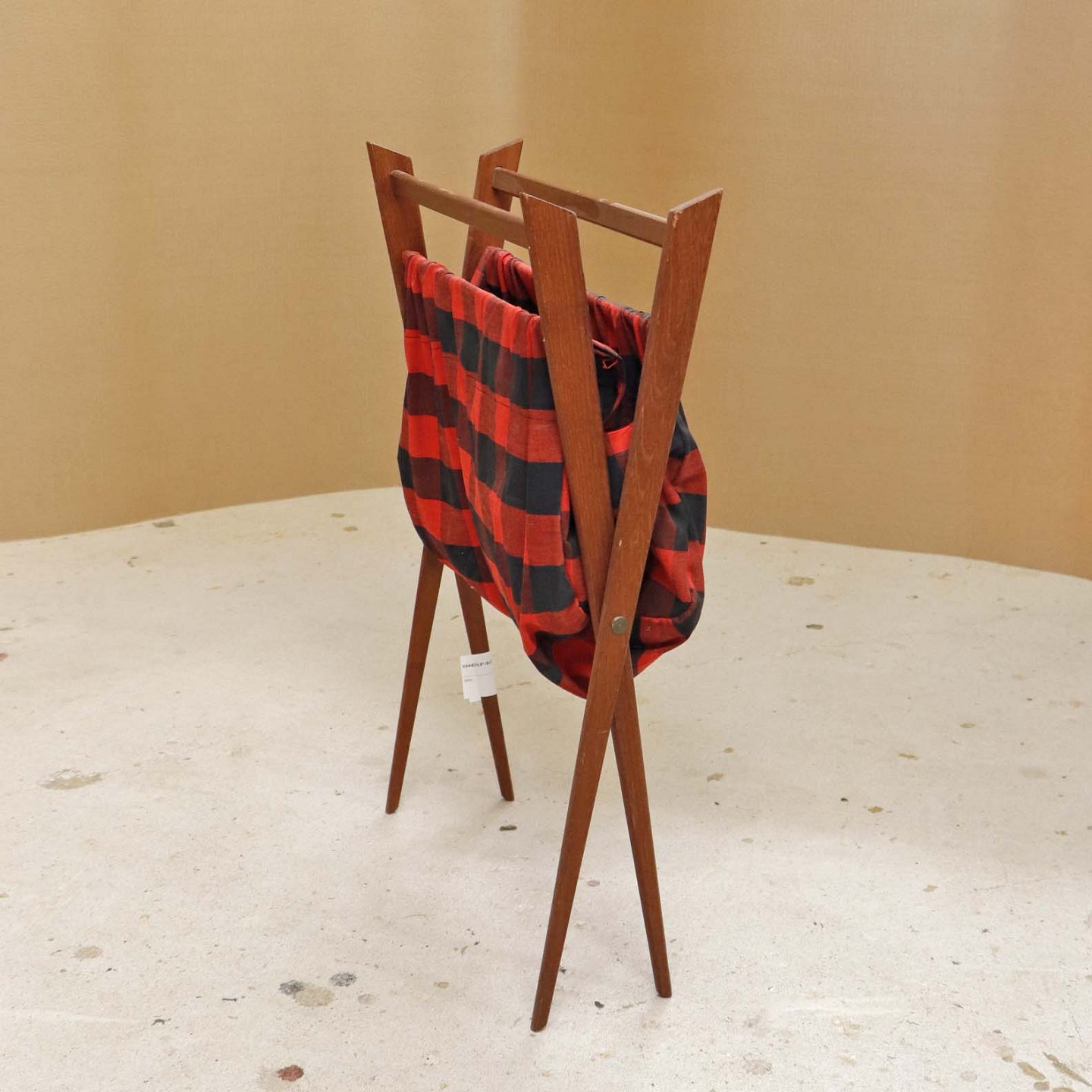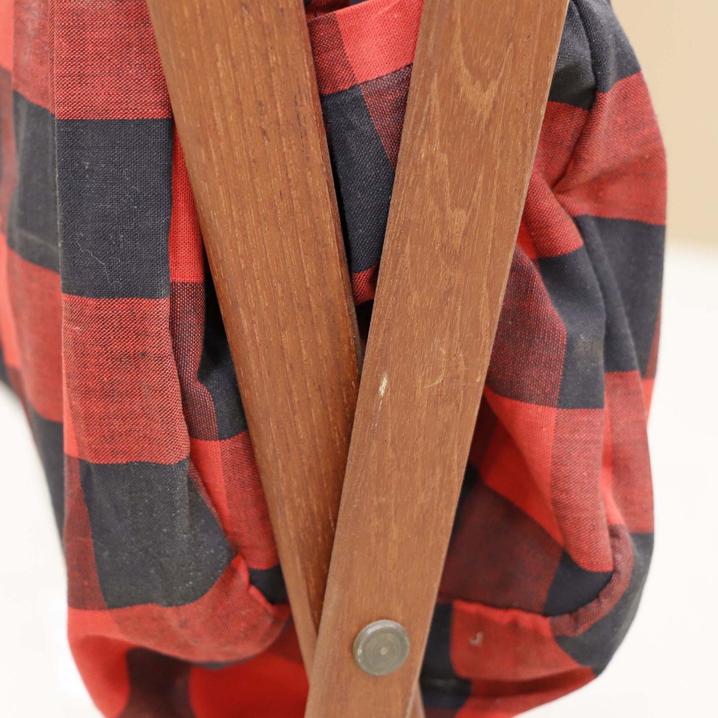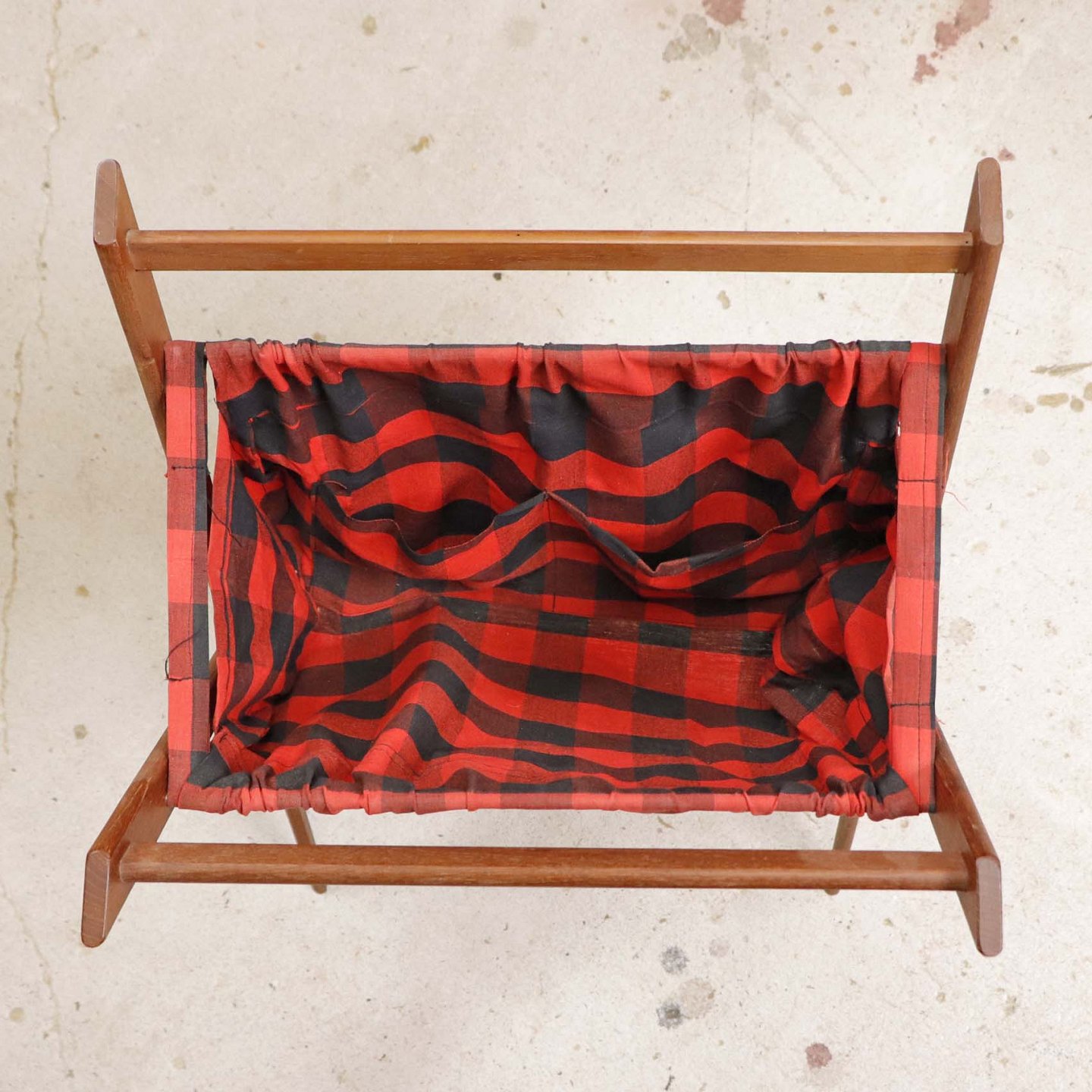 Magasinholder med stel i teaktræ med påmonteret bomuldsstof med mønster af røde og sorte tern. Holderen har to indvendige lommer langs den ene side. Kan også bruges til garn. Holderen kan klappes sammen.