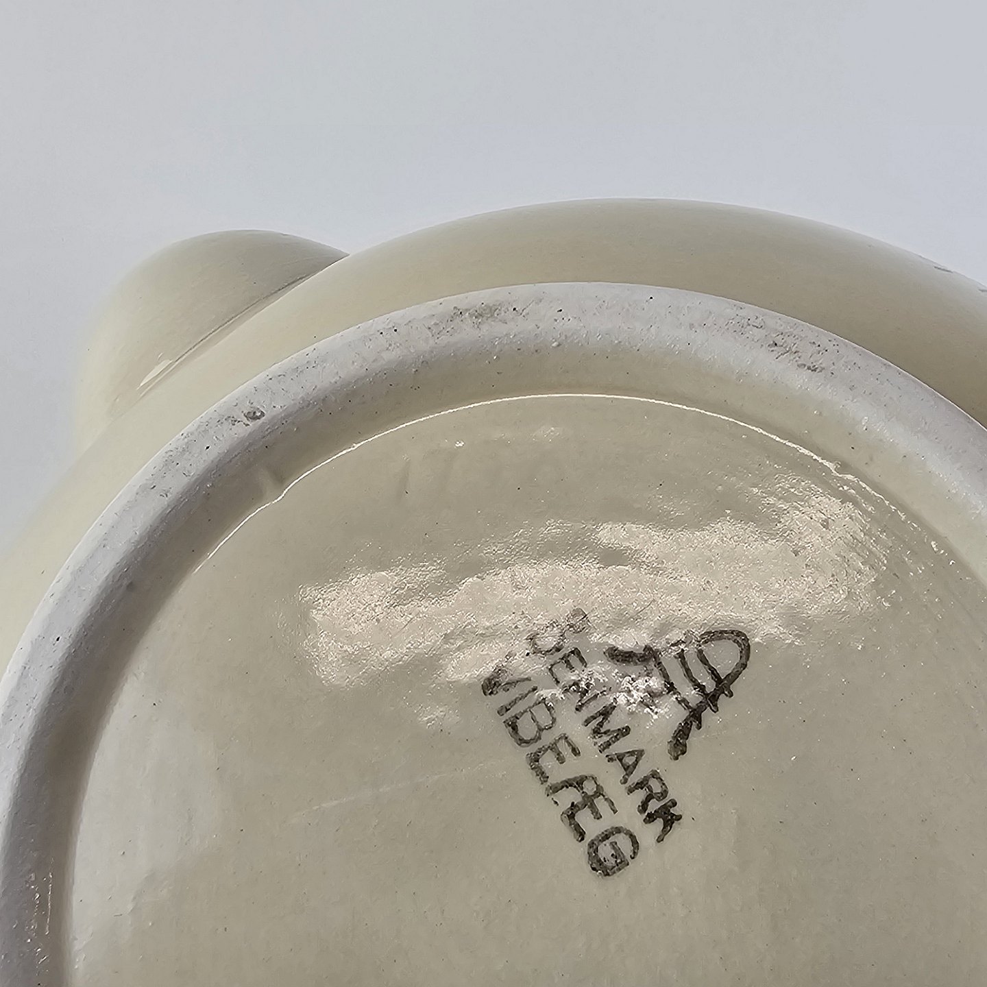 Fajancestel i stelform Viktoria II (Fletværk) med flettet kant og dekoration af en vibeæg blomst i violet og grøn, fremstillet i perioden 1934-1967