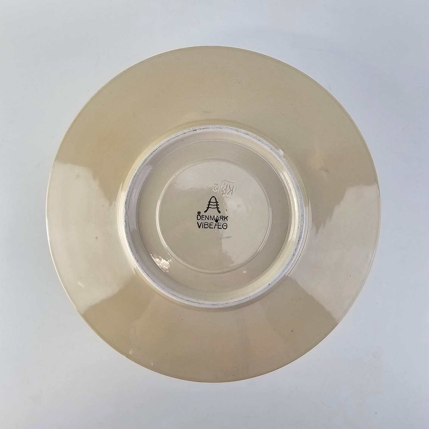 Fajancestel i stelform Viktoria II (Fletværk) med flettet kant og dekoration af en vibeæg blomst i violet og grøn, fremstillet i perioden 1934-1967