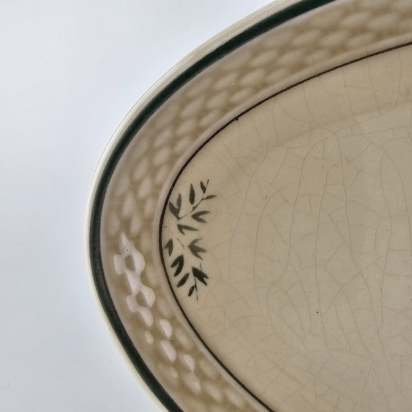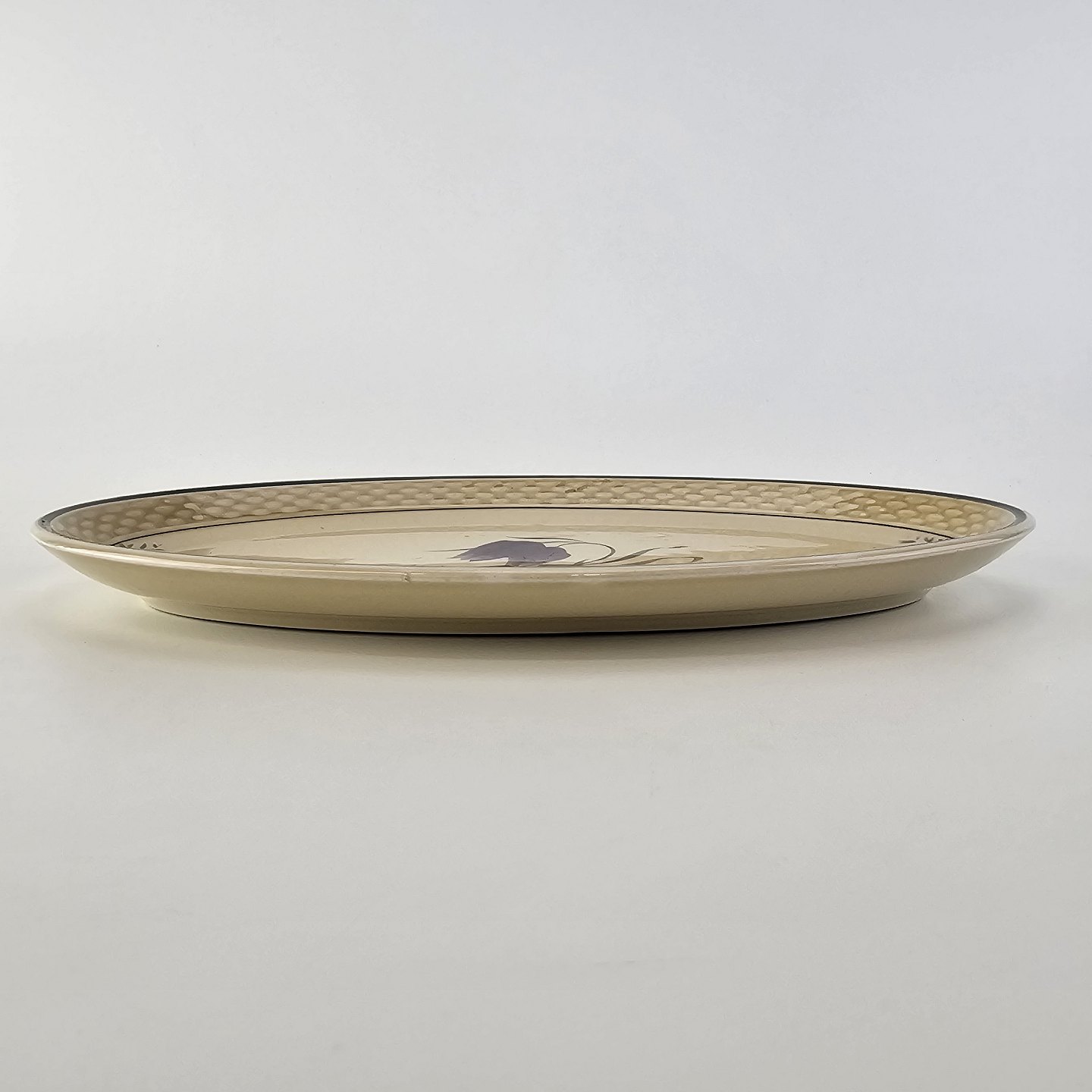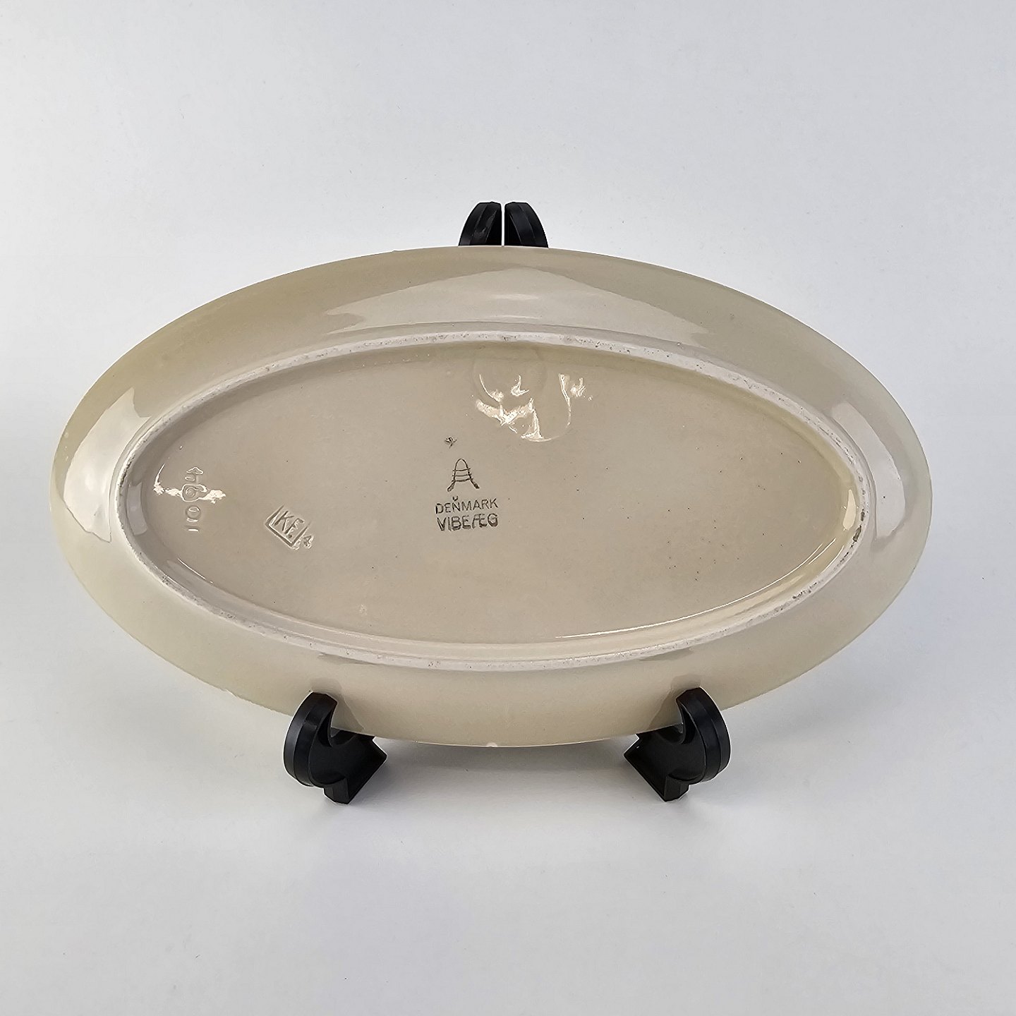 Fajancestel i stelform Viktoria II (Fletværk) med flettet kant og dekoration af en vibeæg blomst i violet og grøn, fremstillet i perioden 1934-1967
