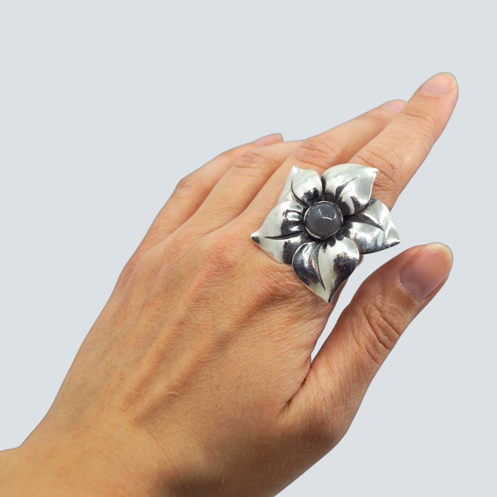 Text zugänglich auf Dänische: Regitze Overgaard for Georg Jensen; Blomster ring i sølv med månesten, nr. 562b. Ring str. 56.