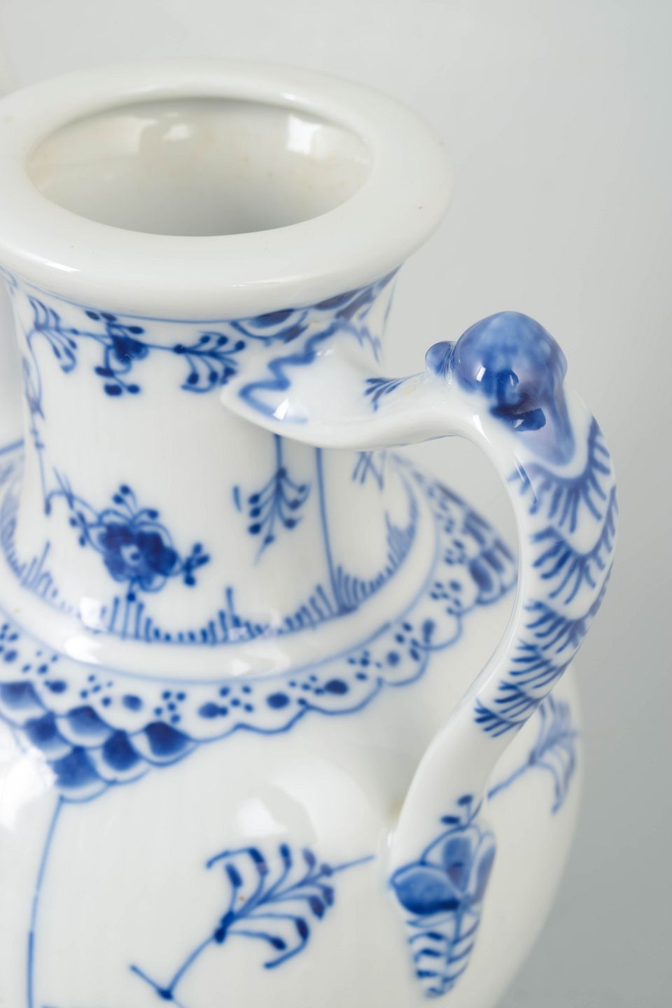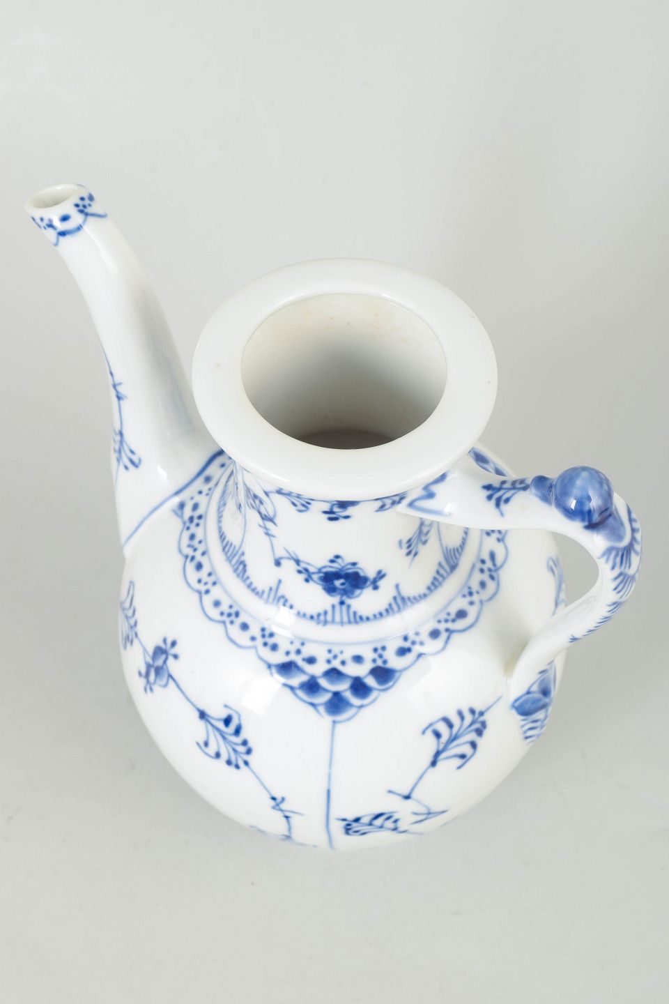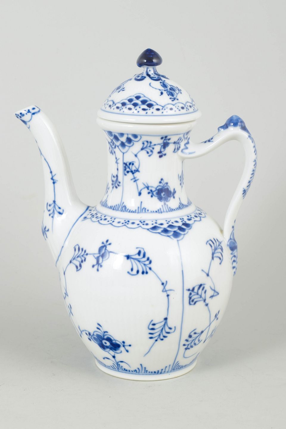 Klassisk kaffekande i hvidt porcelæn med håndmalet blå musselmalet riflet dekoration, model 1/519 fra 1970’erne, 4. sortering.