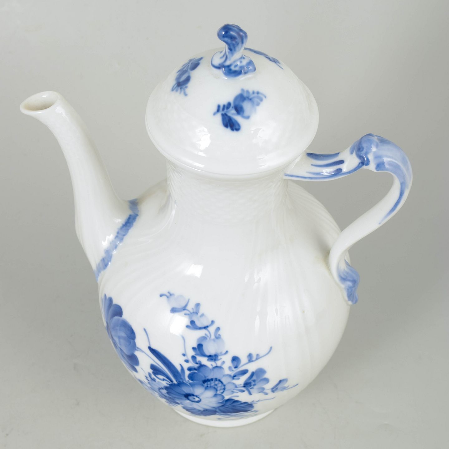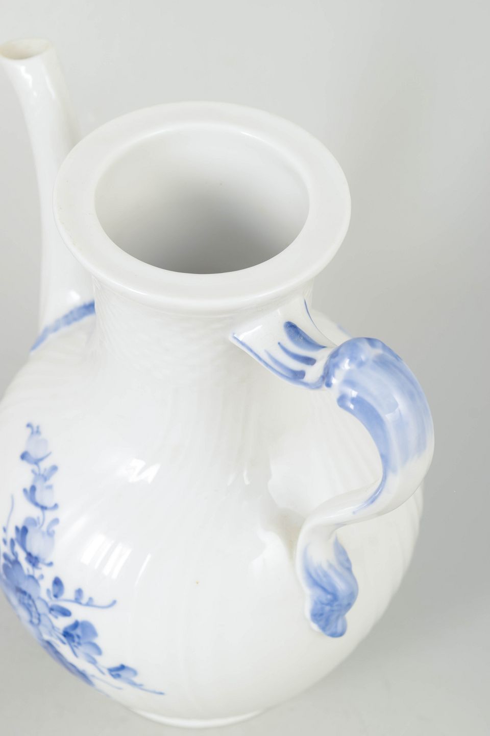 Elegant kaffekande i hvidt porcelæn med håndmalet blå blomsterdekoration i svejfet form, model 10/1794 fra 1950’erne, 2. sortering.